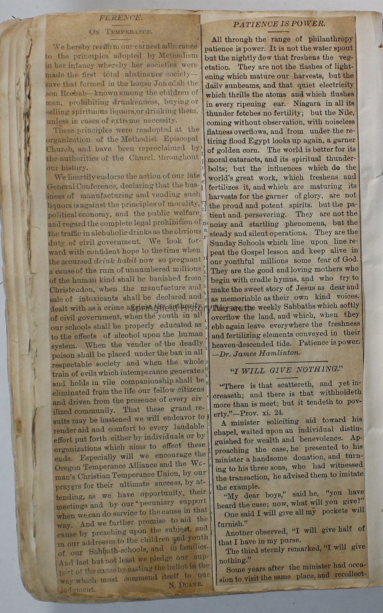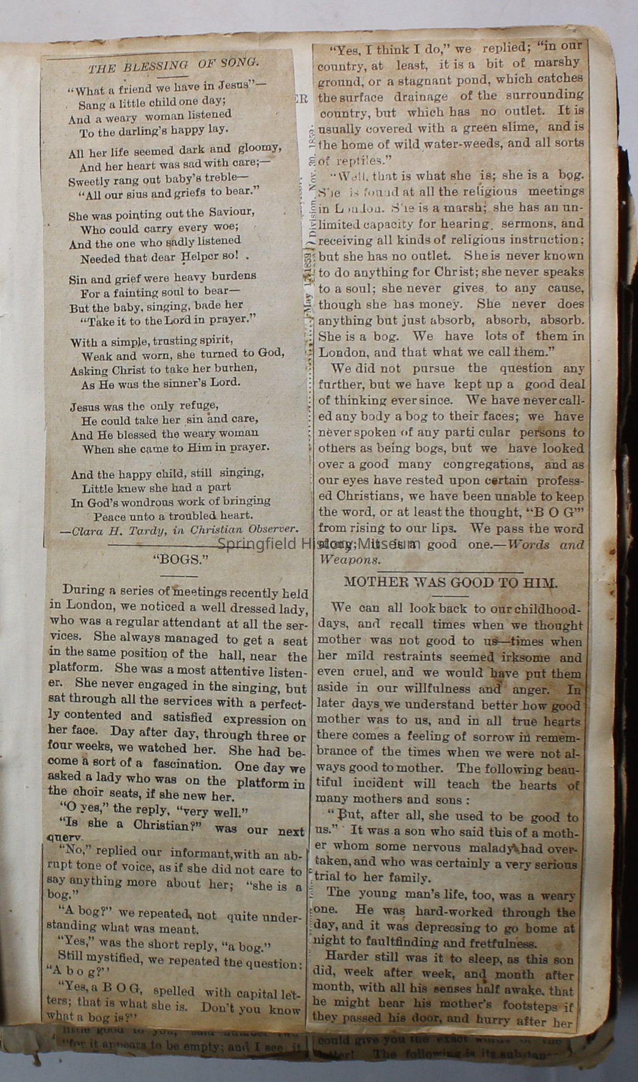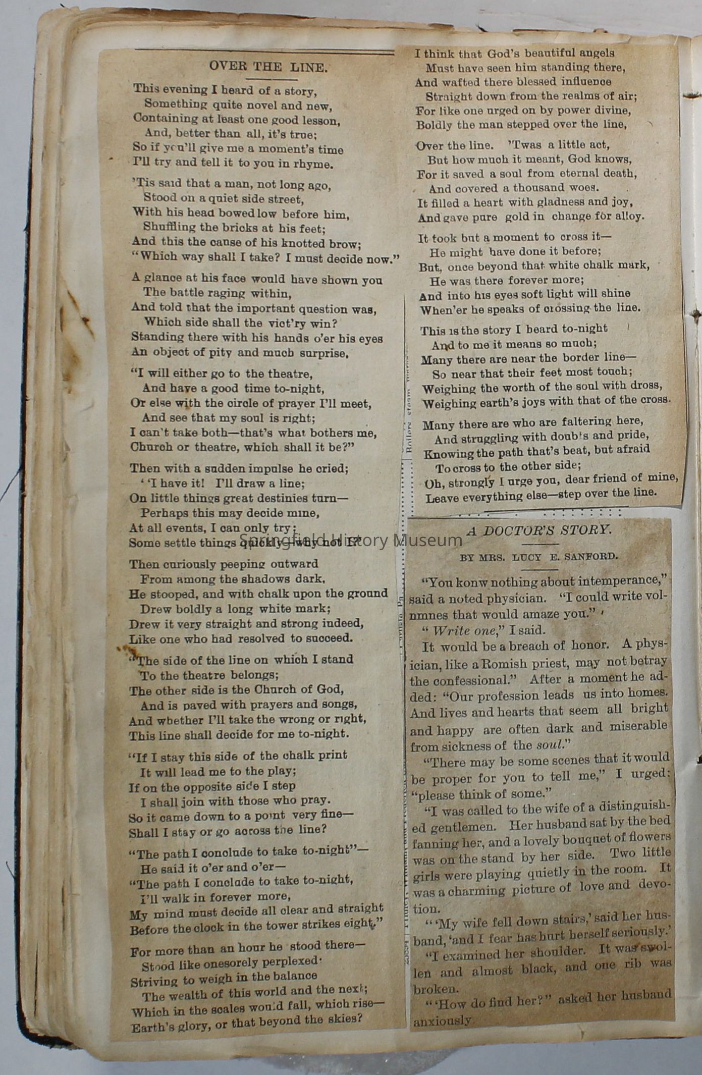 Scrapbook handmade by Agnes Stewart Warner for her son, Clyde. Original hardbound book with newspaper clippings. Book starts with clippings from the Pacific Christian Advocate dated December 4, 1884 on traveling across the Oregon trail. Included are poems, songs, religious articles, and other stories.