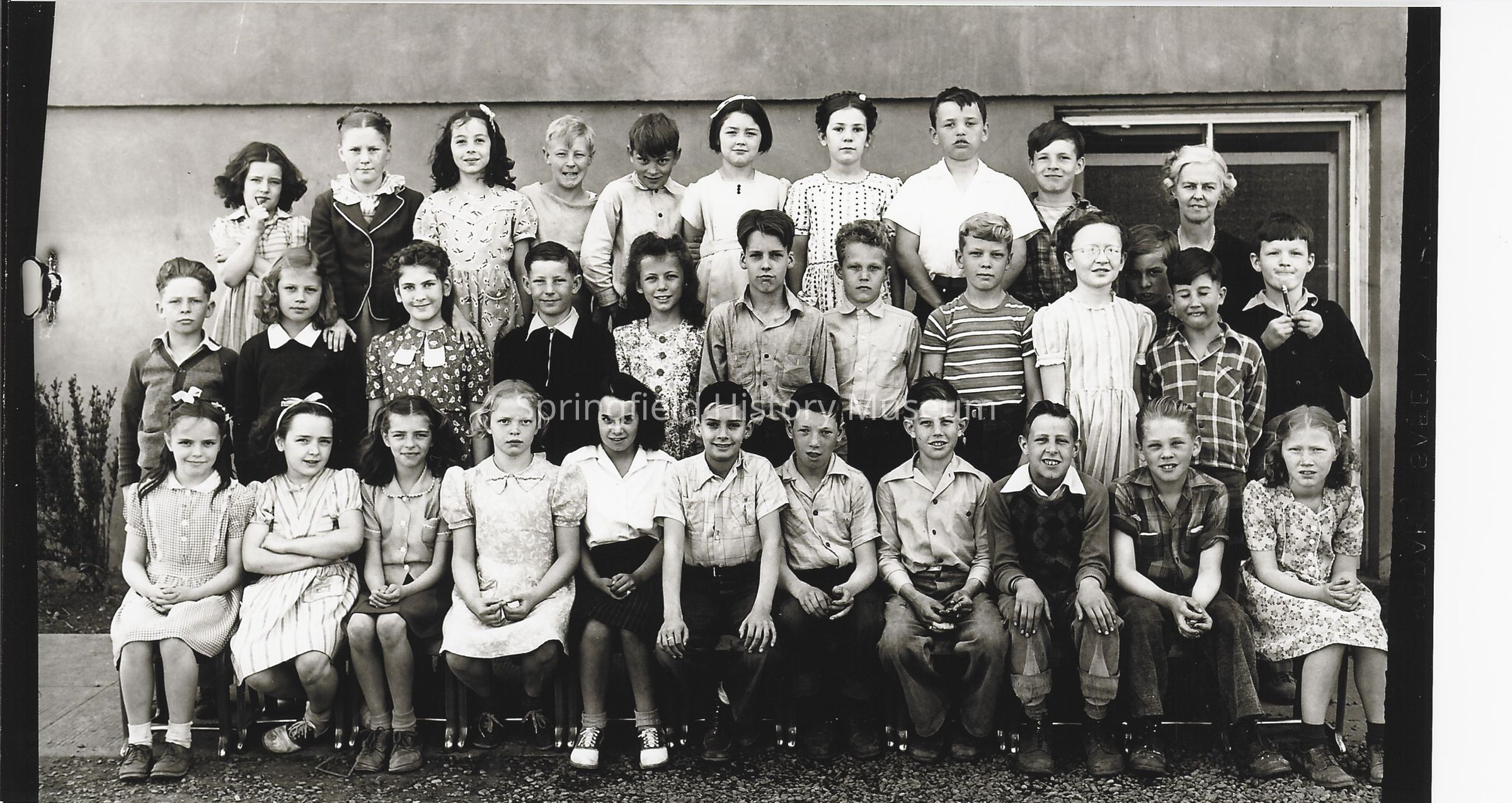 Fourth grade class photo with teacher, taken outside school building. 1940s