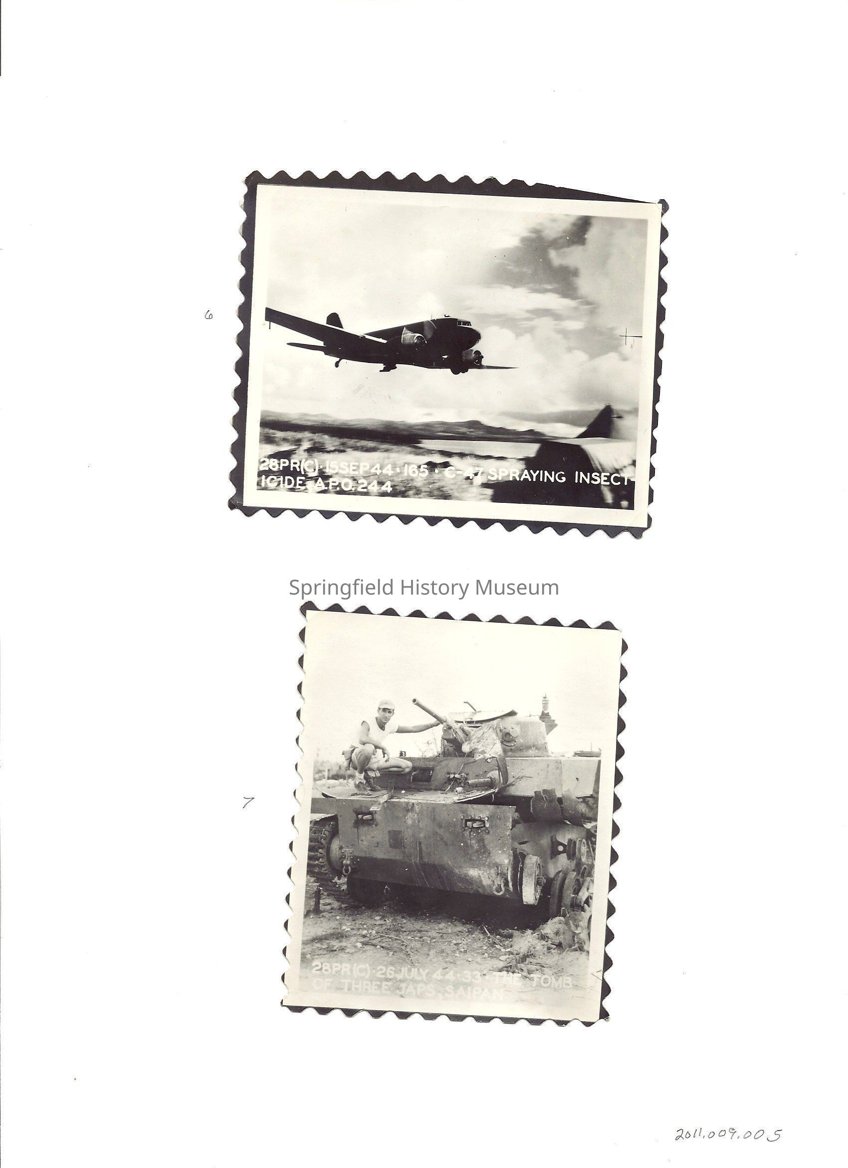 6) Photo Labeled 28 PR(C) 15 September, 1944.165. C-47 Spraying Insecticide APO 244.