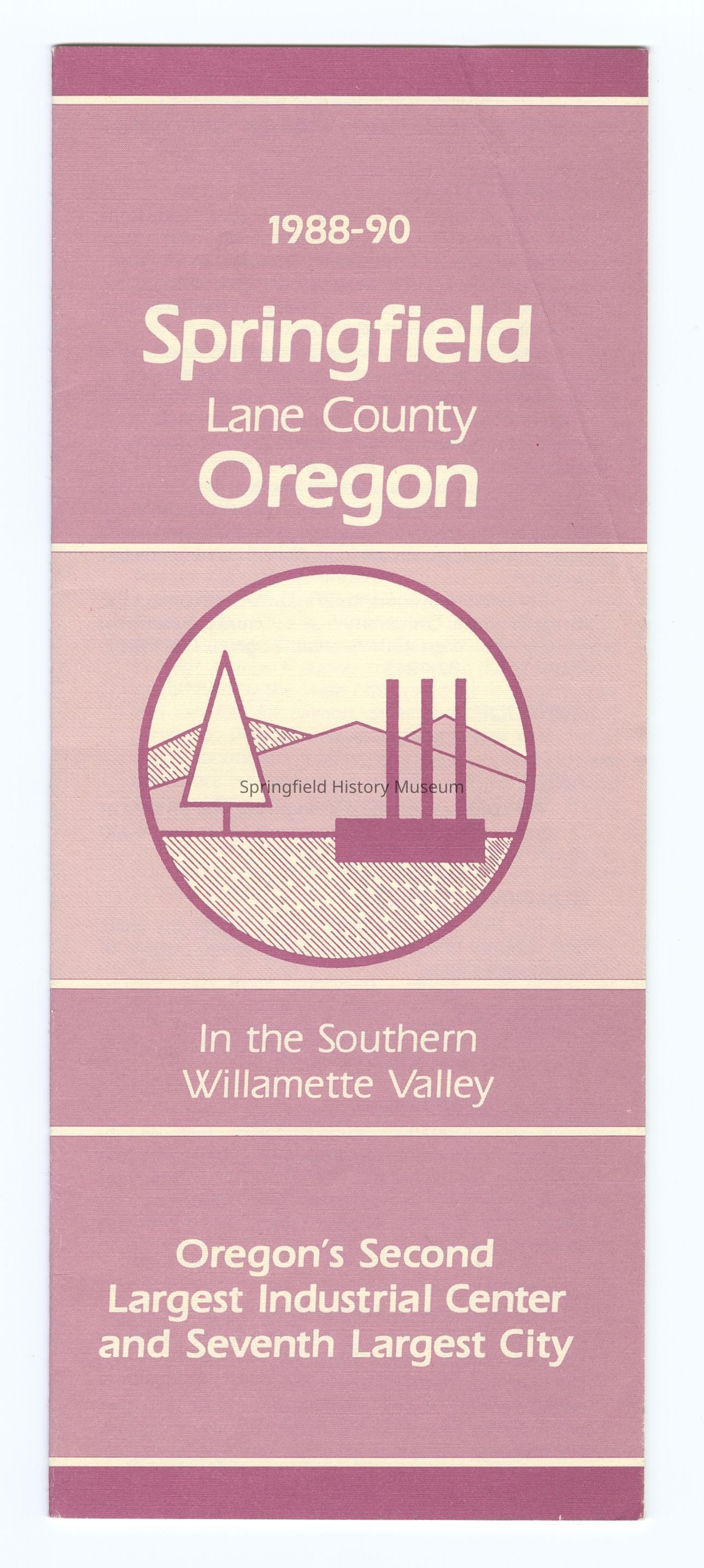 6-panel folded informational brochure titled "1988-1990, Oregon's Second Largest Industrial Center and Seventh Largest City", contains statistical data on Springfield. Red-toned brochure. Compiled by Springfield Chamber of Commerce.Context