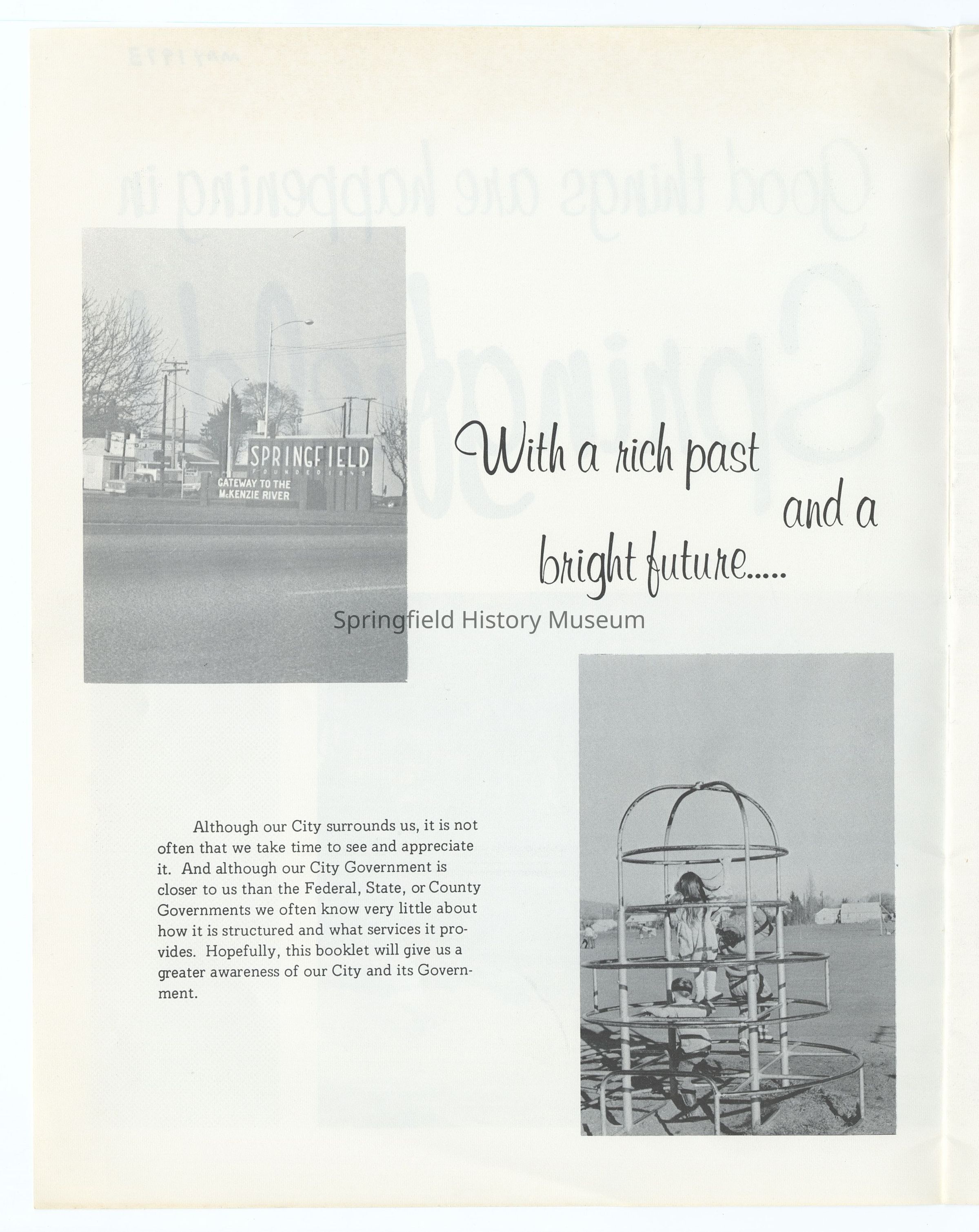 Informational booklet about Springfield titled "Good things are happening in Springfield!", 1973. Compiled by Susen Ertle (University of Oregon intern) for the City of Springfield. Appr. 10 pages.Context