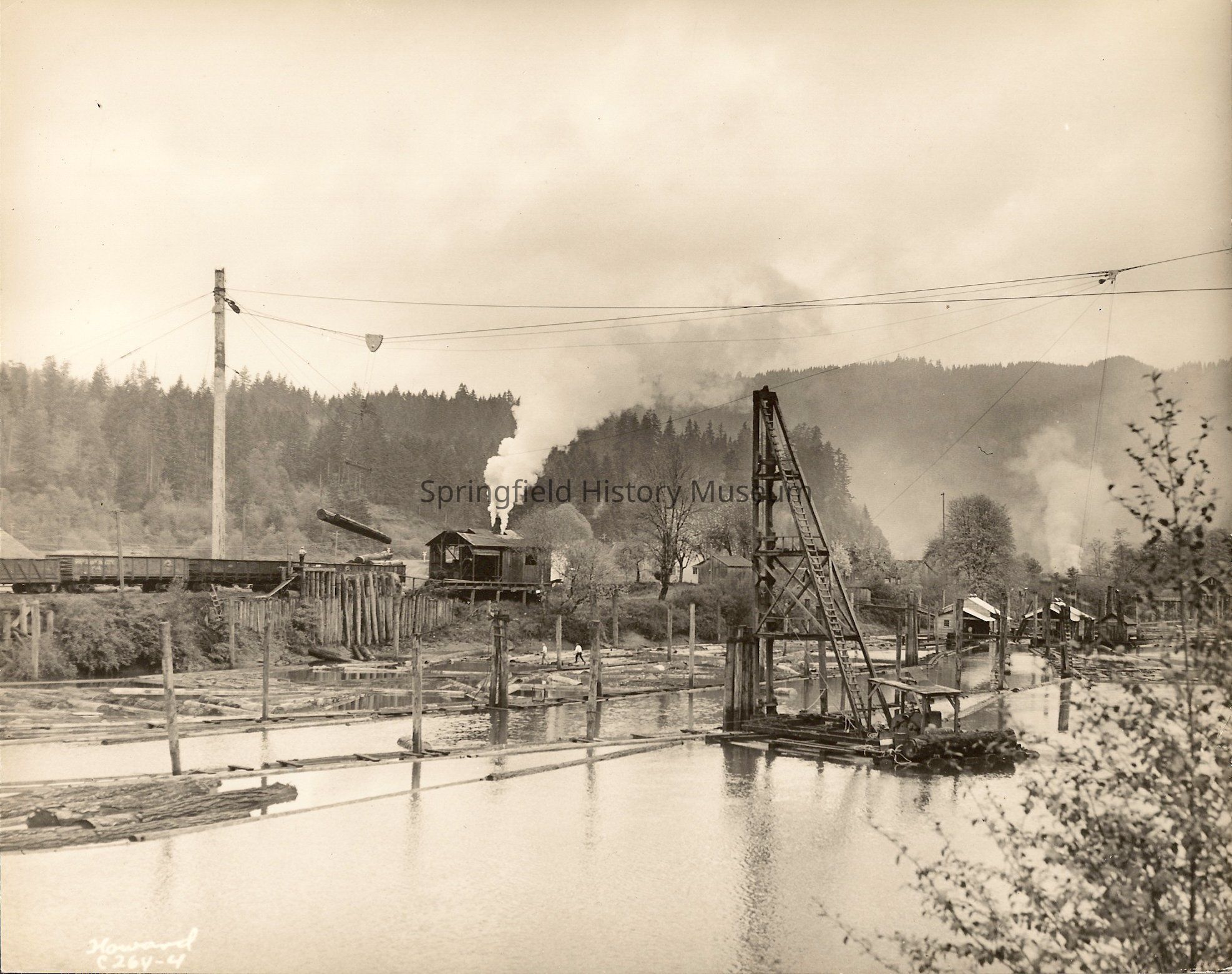 Photo of a log pond, logs being unloaded off a train by Howard C-264-4