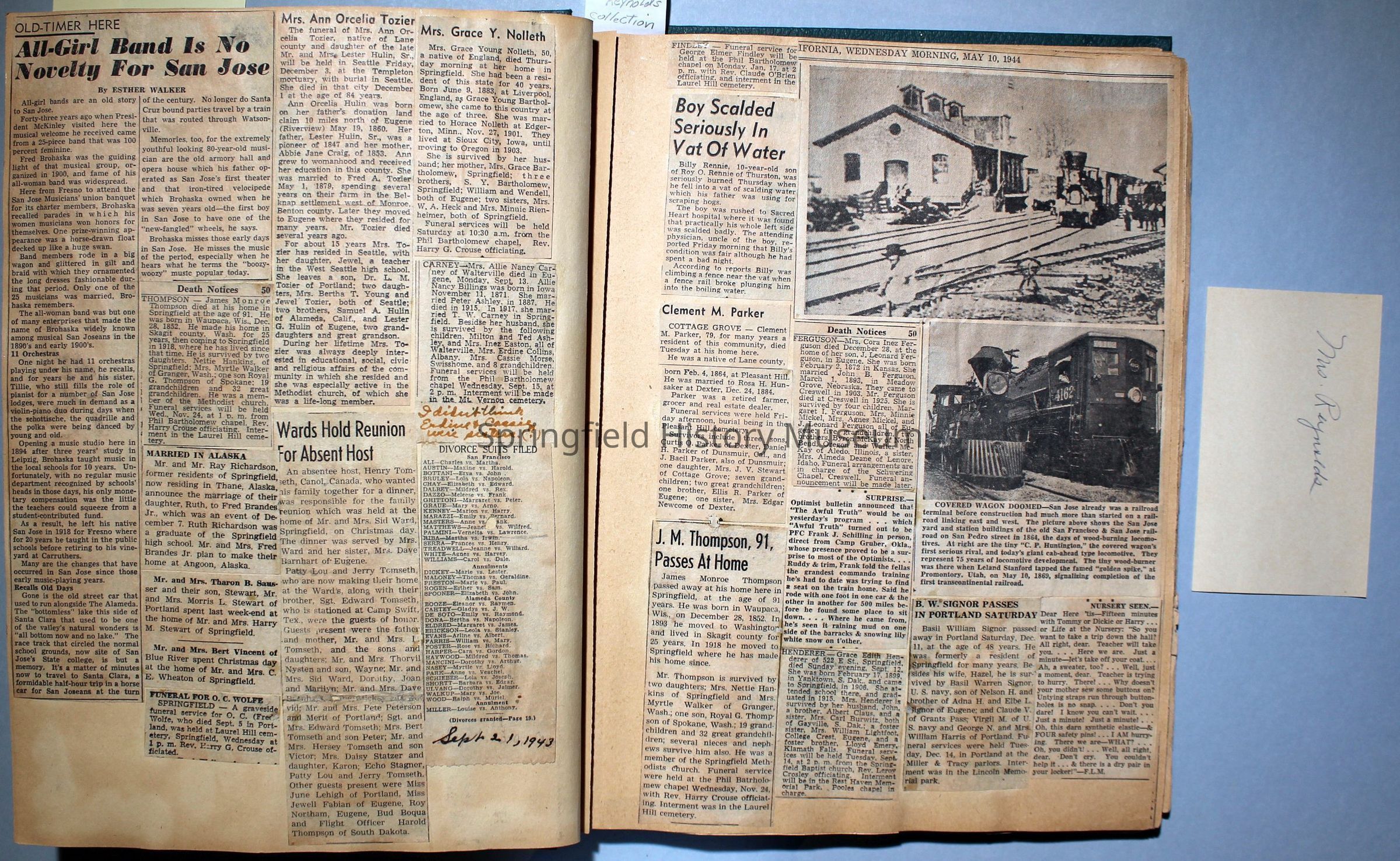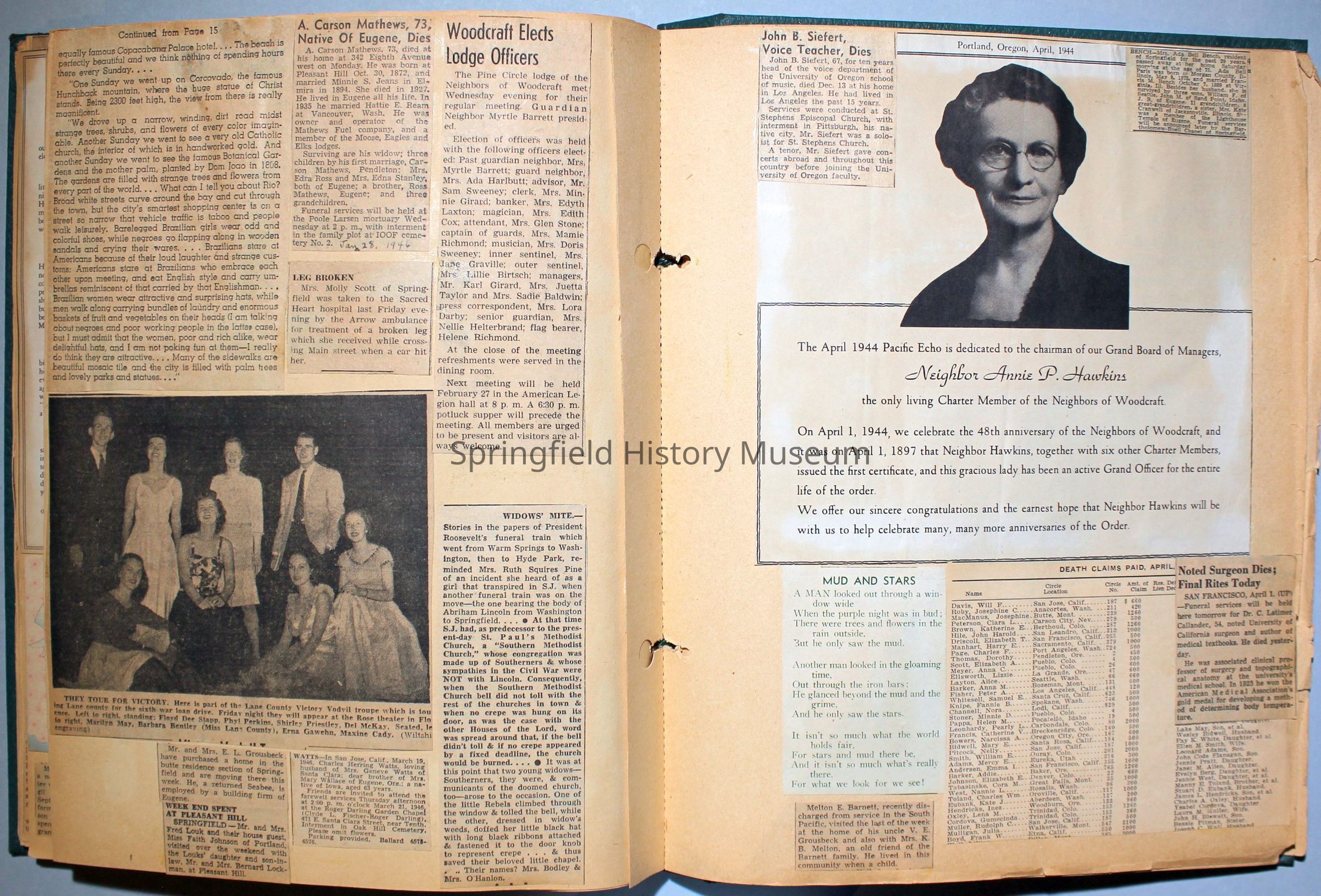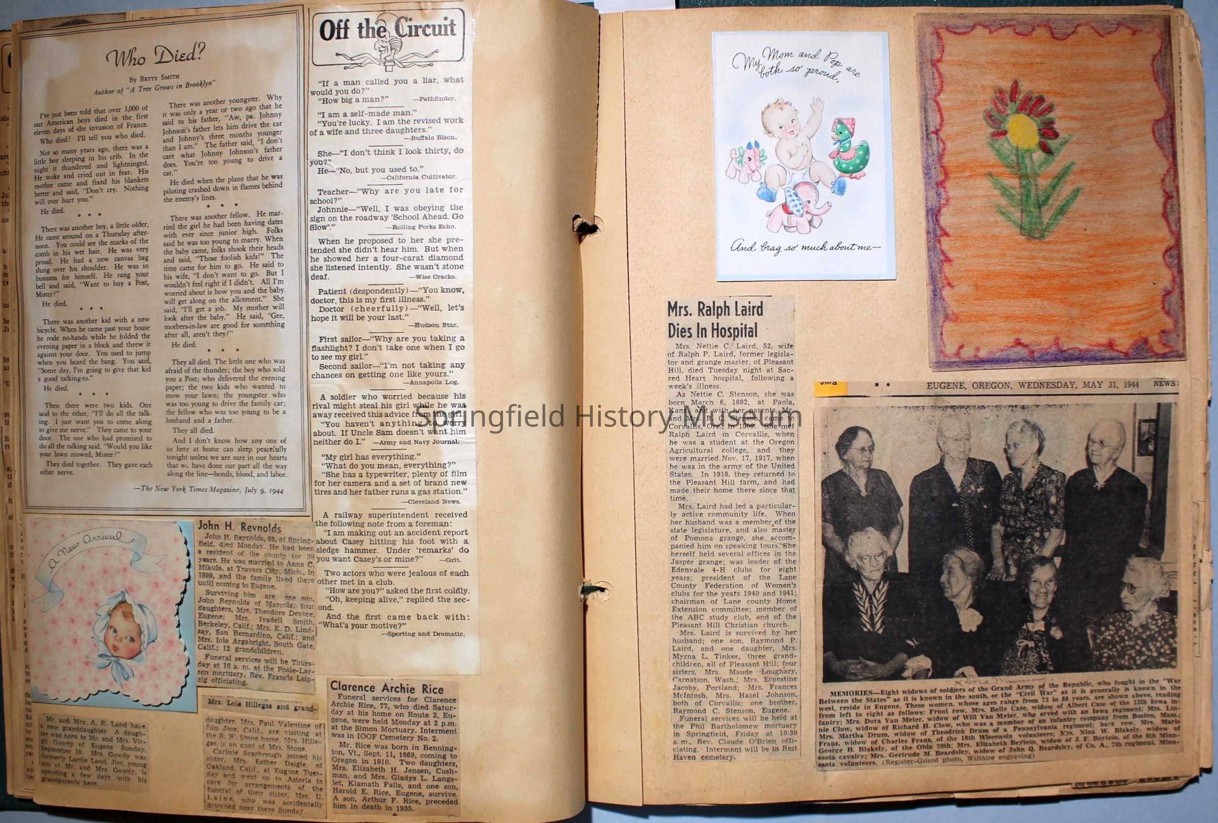 Green covered scrapbook with tied cord; address sticker on first page: Virgie A Reynolds. Back, inside cover displays an illustrated clipping of Jesus Christ. A few pictures from magazines, the bulk is newspaper clippings about World War II and the happenings of local families in the 1940s. Scrapbook contains personal relics from World War II, such as a "Join the WAC" slip that Virginia collected and wrote on.Collection