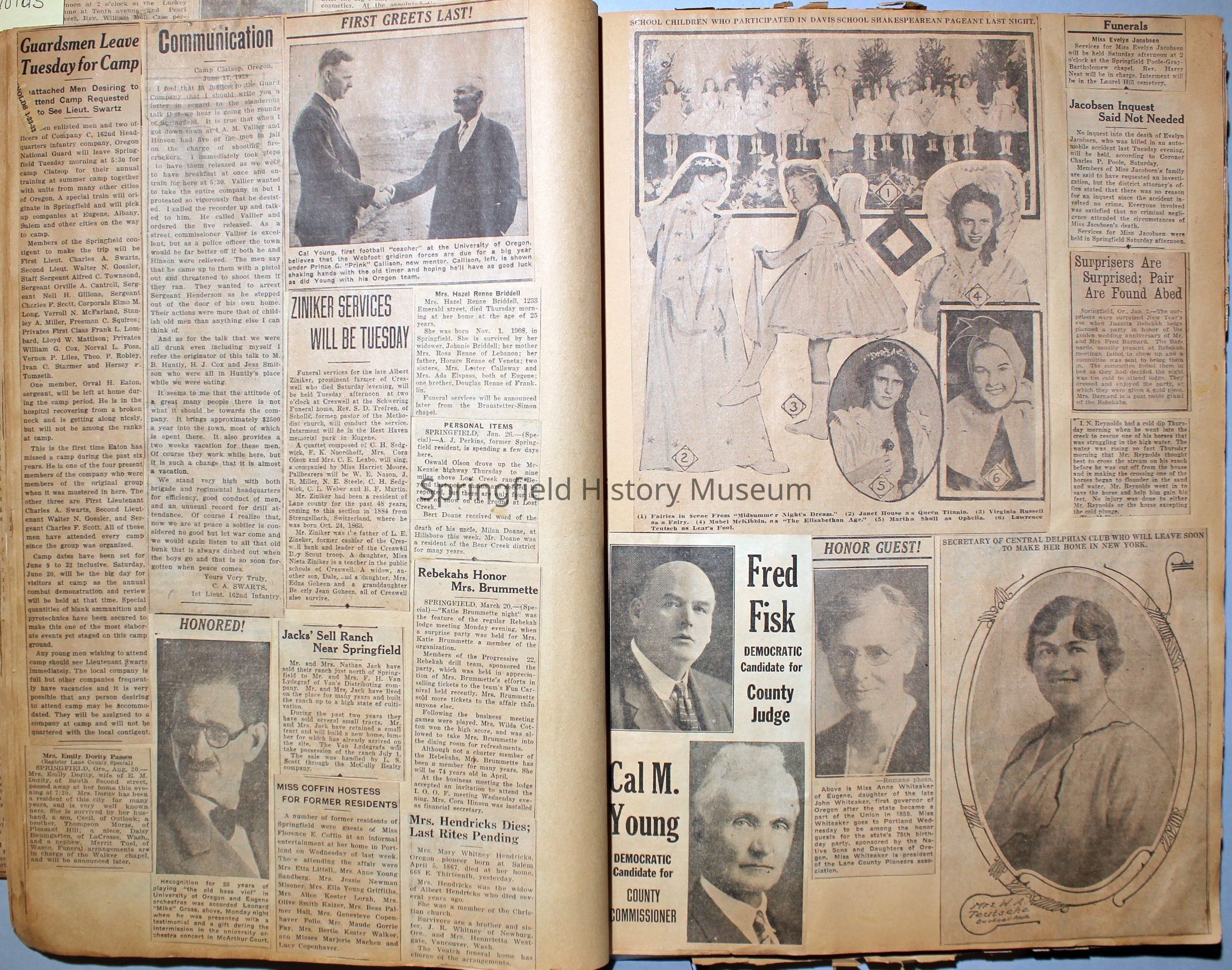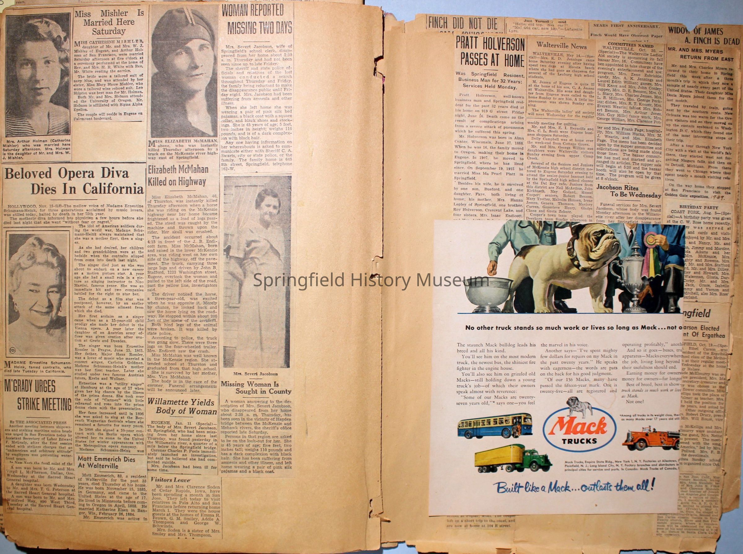 Cover reads: "Scrapbook for Pictures." Paperback scrapbook; newspaper clippings about local news, families and friends, advertisements, as well as letters and drawings from children and other relatives; dates from 1920 through 1940.Collection