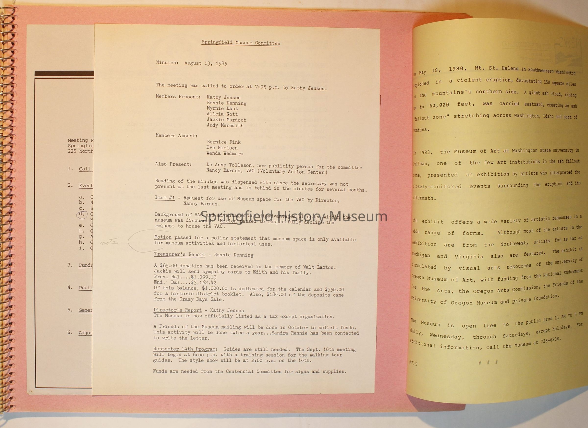 Scrapbook from 1981 through 1986 of Springfield Museum events. Mostly contains newspaper clippings, some event brochures and other papers. Wire spiral bound with green and dark pink cover.Collection