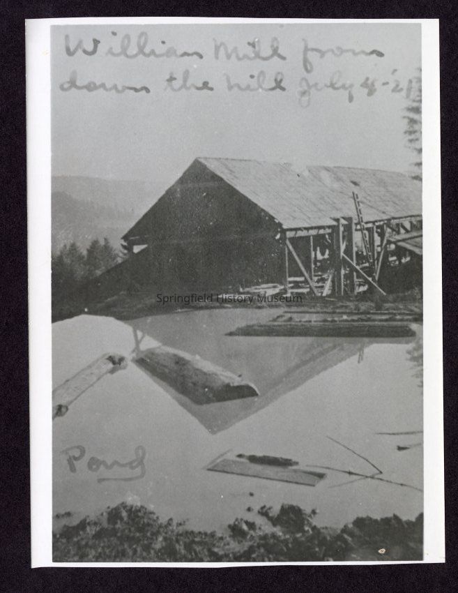 Photograph of mill and mill pond. Transcribed inscription on the front: "William Mill from down the hill July 4, '21."