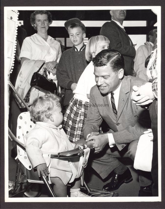 Photograph of Governor Mark O. Hatfield talking to a child. Date unknown.Entry/Object ID