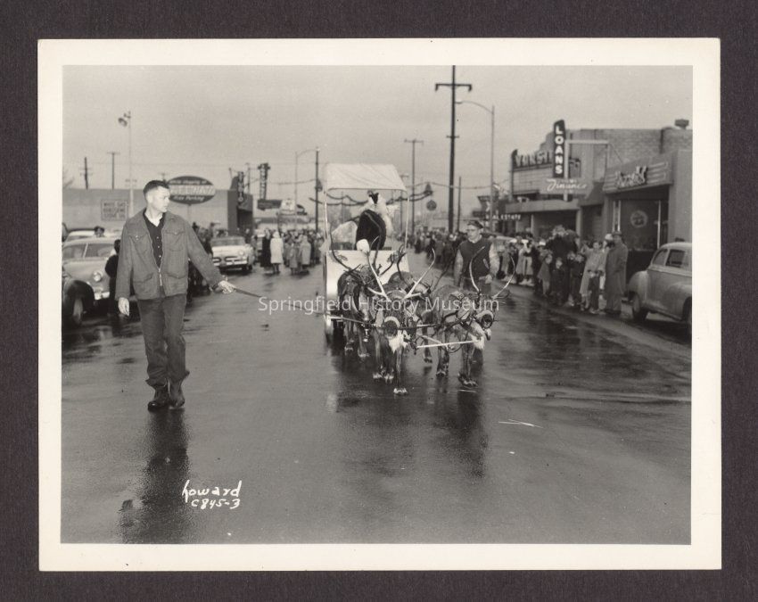 B&W Photo of Springfield, Oregon Christmas Parade. Santa in his Sleigh with his reindeer. December 10, 1955. Howard Studio C845-3