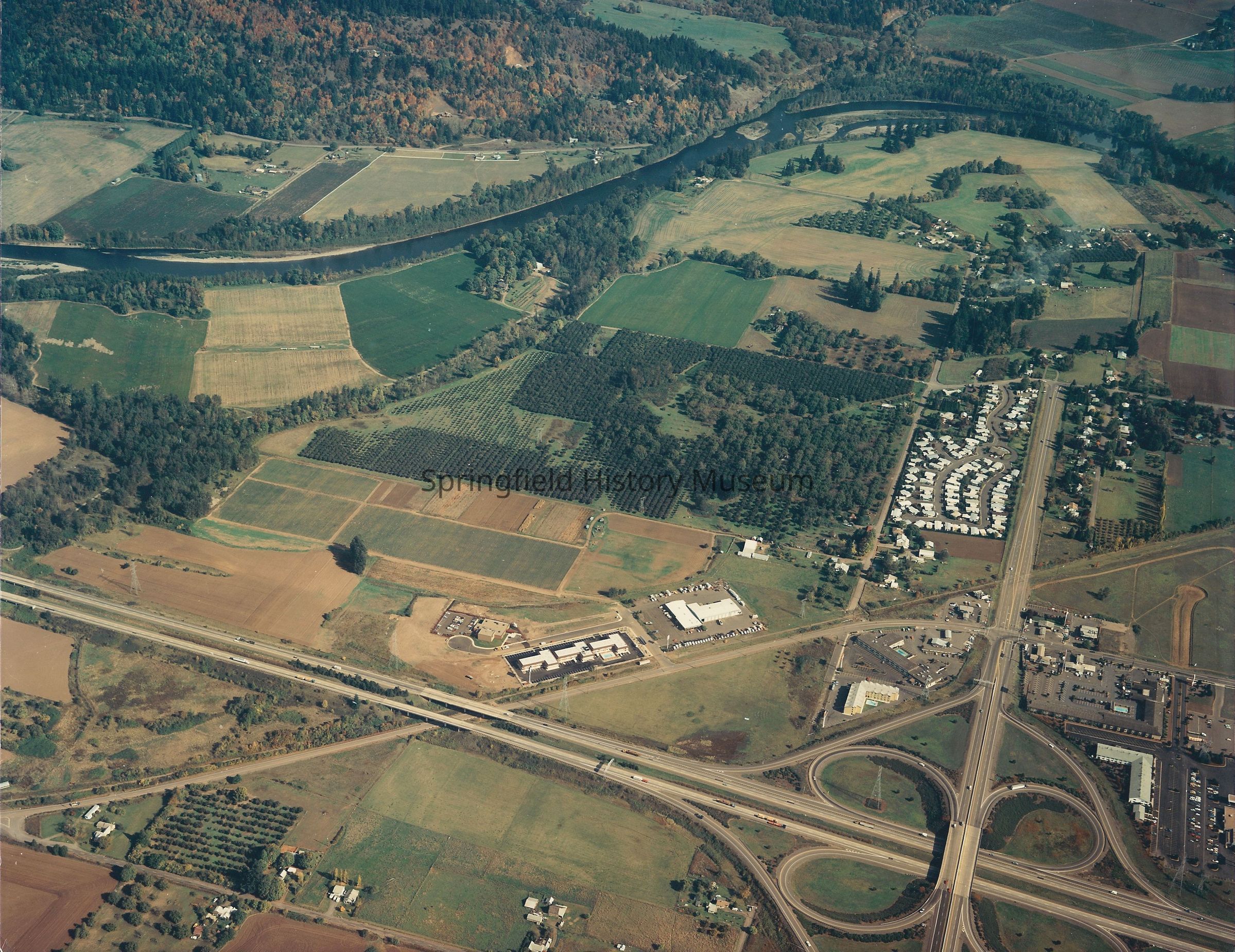 Aerial view of Beltline, Gateway Area and the McKenzie river. Center of photo is where the Sony plant was built.