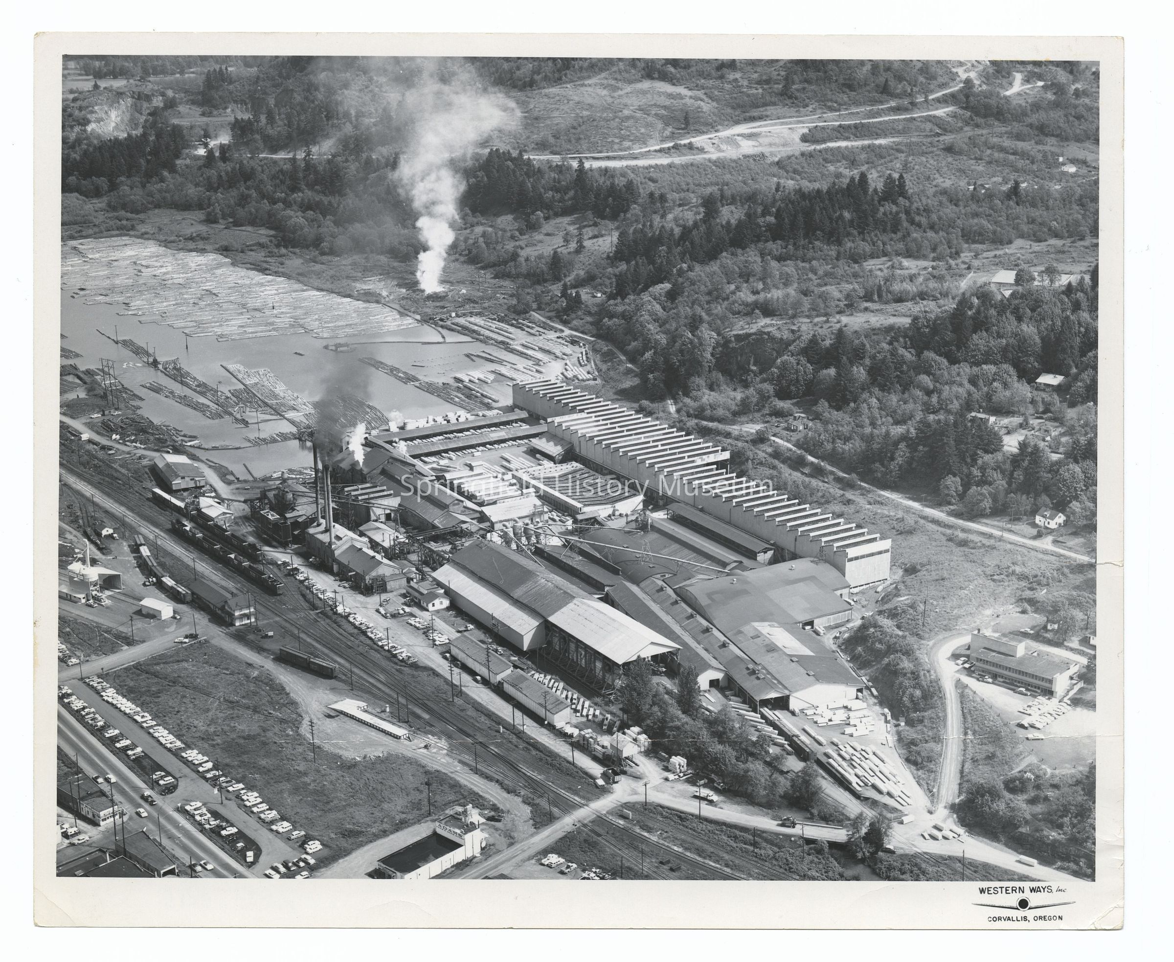 Aerial photograph of Booth-Kelly Lumber Company mill site and surrounding area, Springfield, 1960Photograph Details