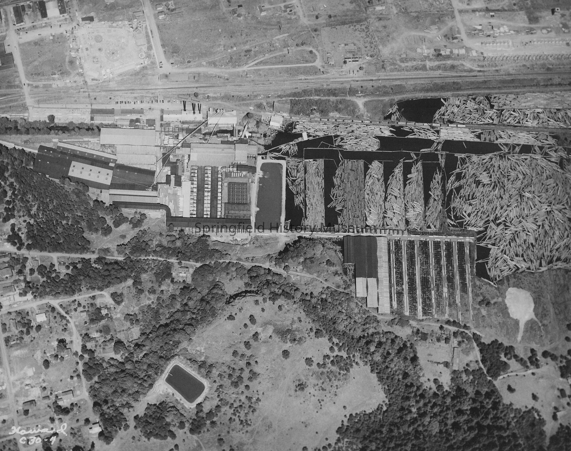 Aerial view of Booth Kelly mill and pond, Springfield. Note old water reservoir at bottom left of photo. Marked Howard C30-4