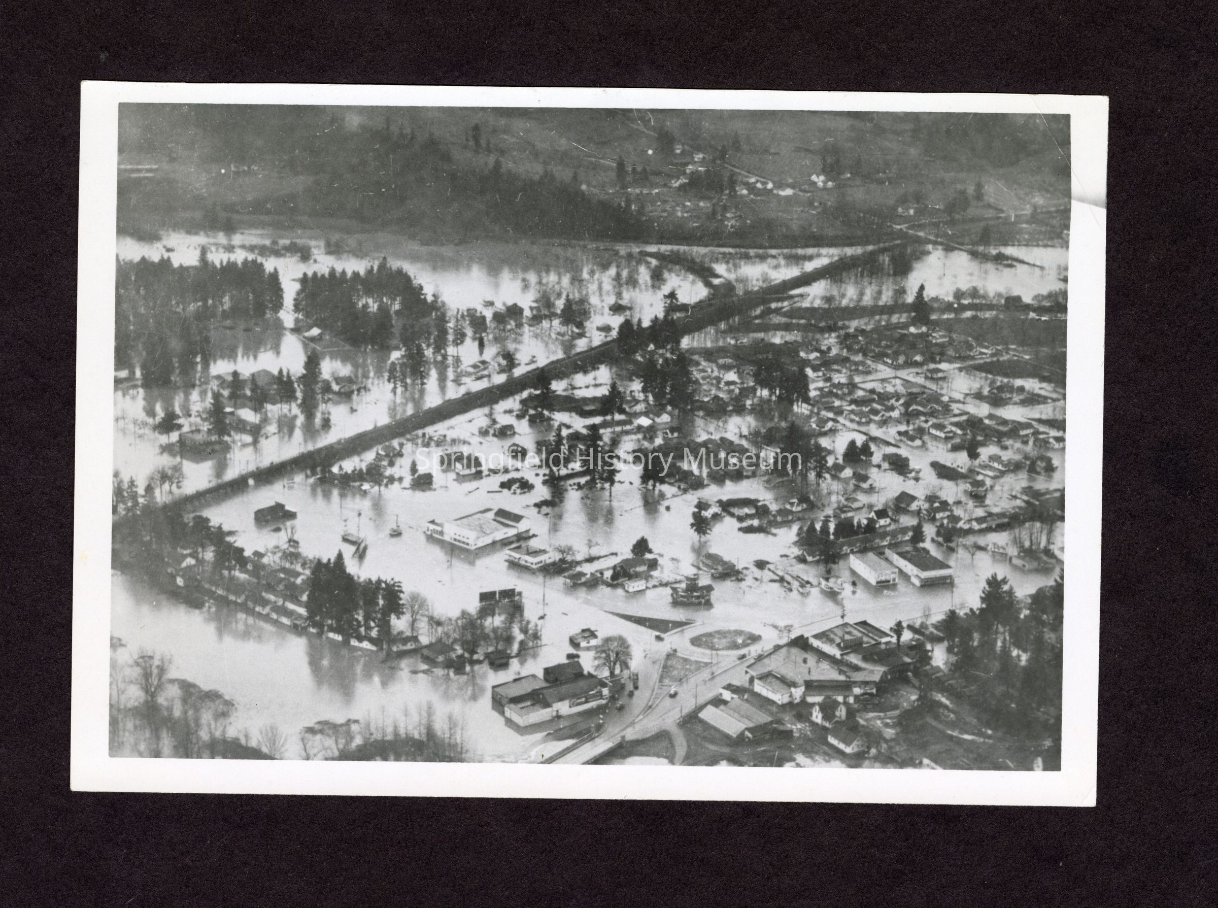 Aerial view of flooded city. On back of photo there is a sticker that states: "L.R. Davidson 1765 Henderson Ave. Eugene, Ore. 97403"