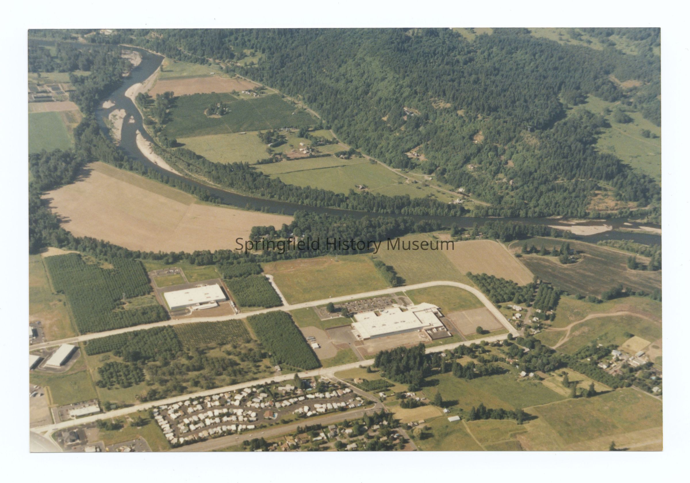 Aerial photograph of International Way-Gateway area, South to North view, Springfield, undated, circa 1980. Shows hospital, International Way, larger surrounding area, and area across the McKenzie river.Photograph Details