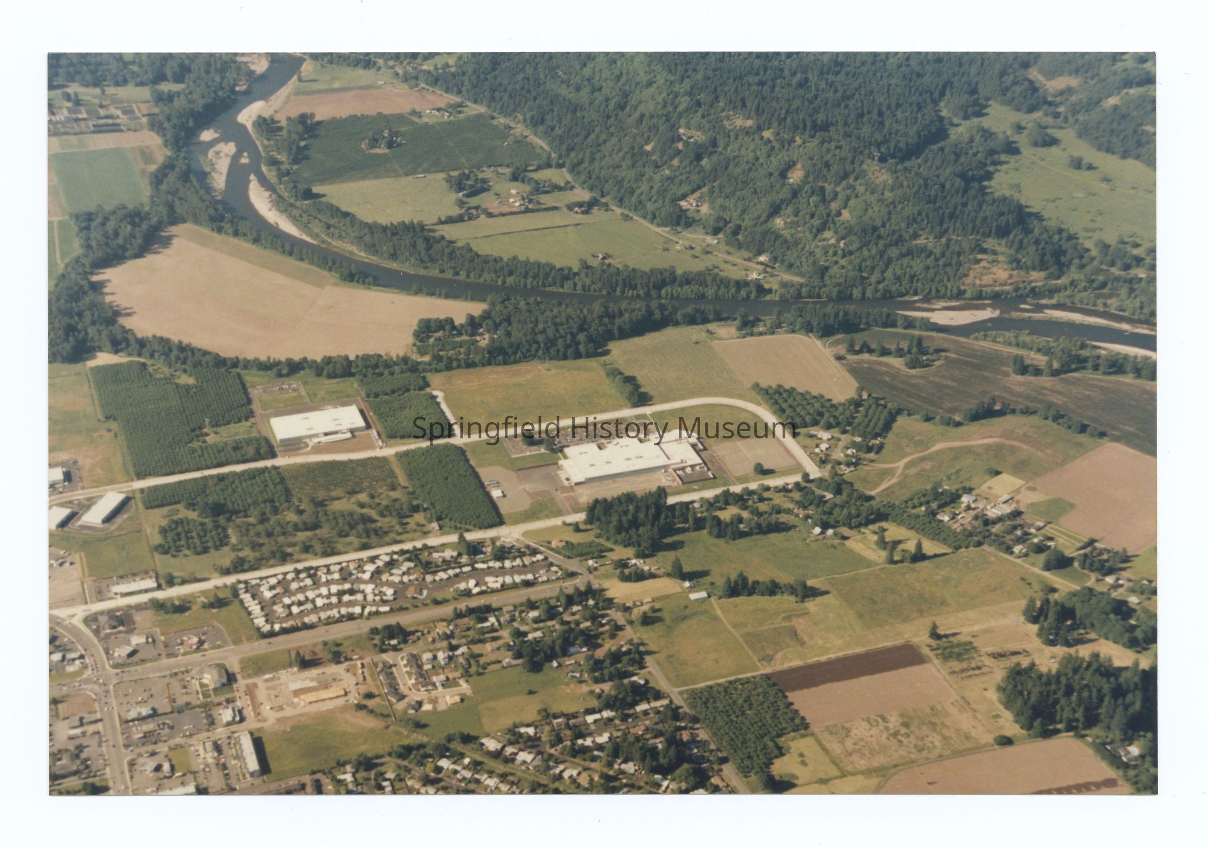 Aerial photograph of International Way-Gateway area, South to North view, Springfield, undated, circa 1980. Shows hospital, International Way, larger surrounding area, and area across the McKenzie river.Photograph Details