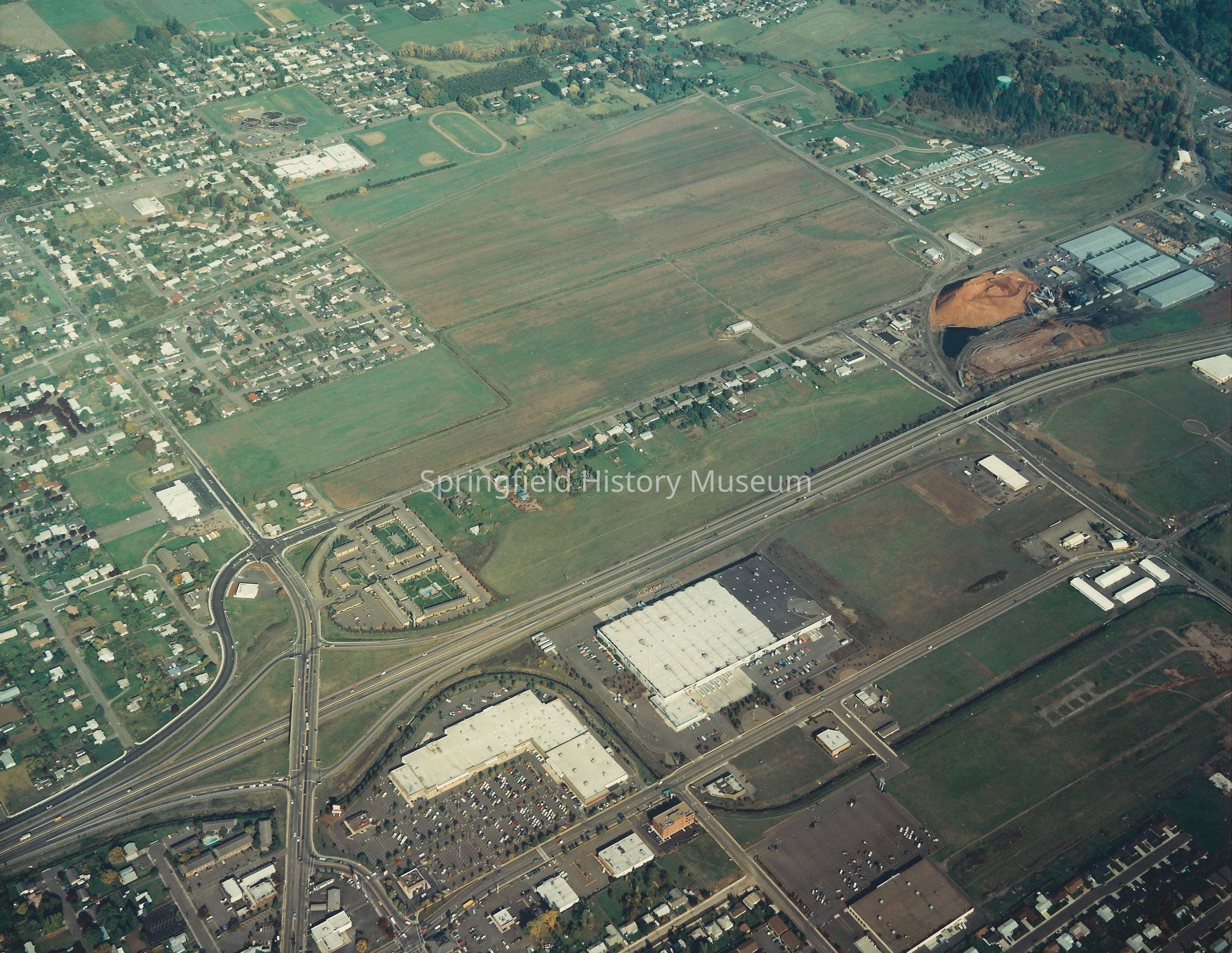 Aerial view of Springfield showing old Springfield Mall on Olympic Street, the Kingsford mill, north to Marcola and Yolanda Street. Dated between 1981 & 1984.Photograph Details