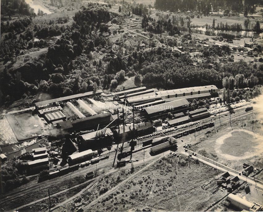 Aerial view of Booth-Kelly mill, Soutern Pacific railroad Depot.