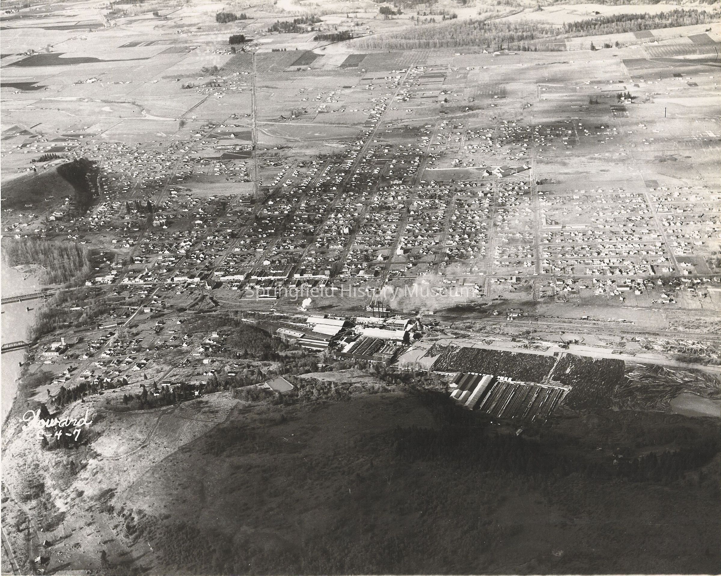 Aerial view from water reservoir on hill, over Booth-Kelly mill and Springfield. Undated. Marked 'Howard C-4-7"