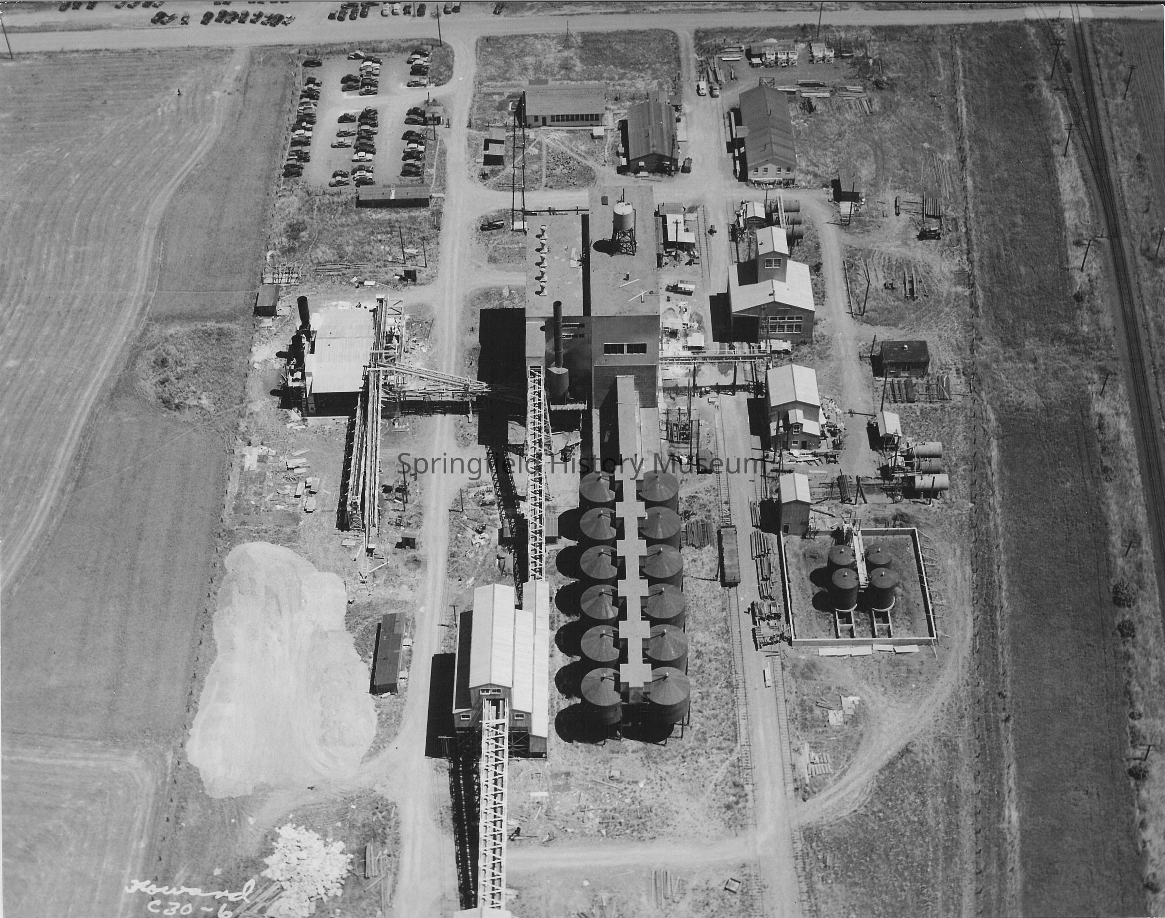 Aerial view of Springfield: close up of alcohol plant; looking east. Marked "Howard C30-6" Undated.