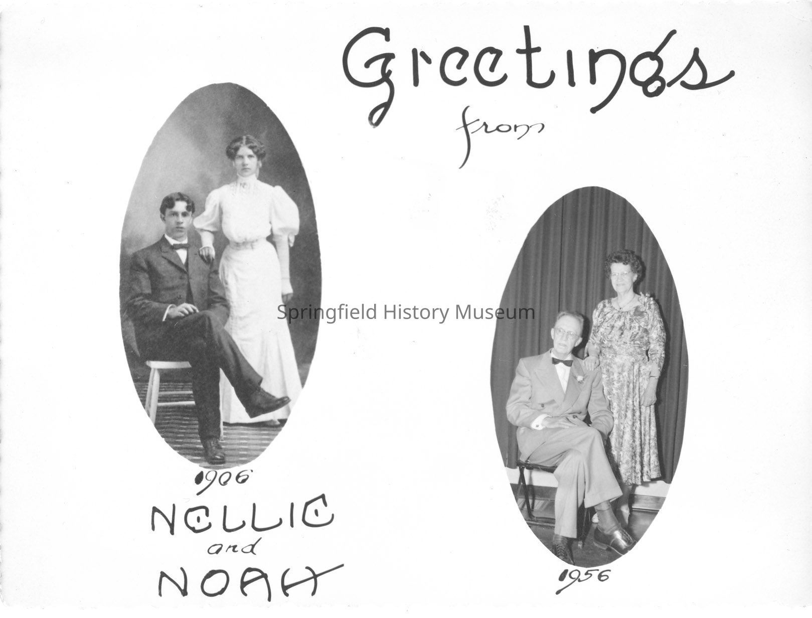 Greetings from Nellie and Noah, 1906 - 1956. Two pictures on an anniversary postcard.Photograph Details