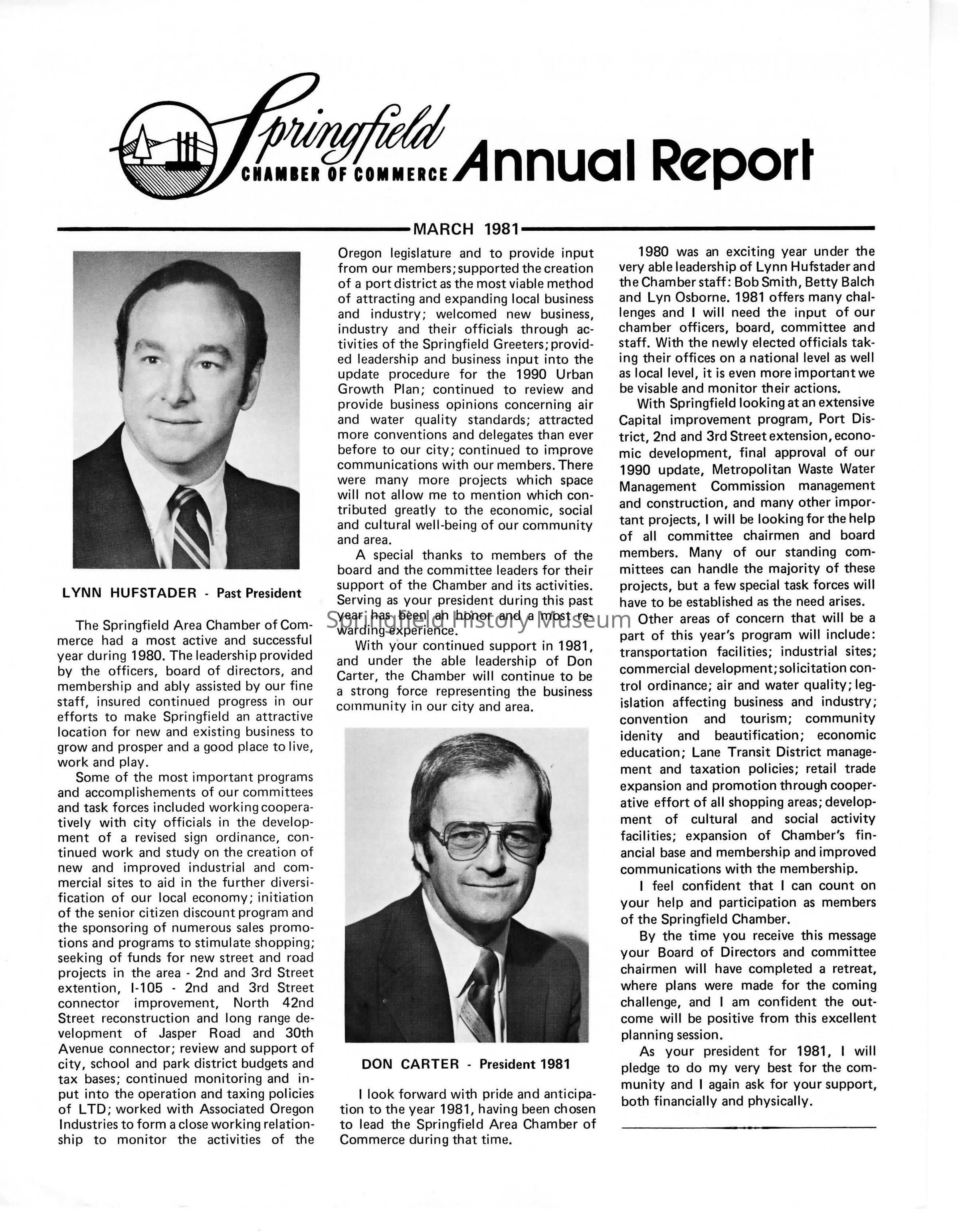 Springfield Chamber of Commerce Annual Report, 1981. Contains information about Springfield and the projects and activities of the Chamber in 1980. Black and white brochure.Context