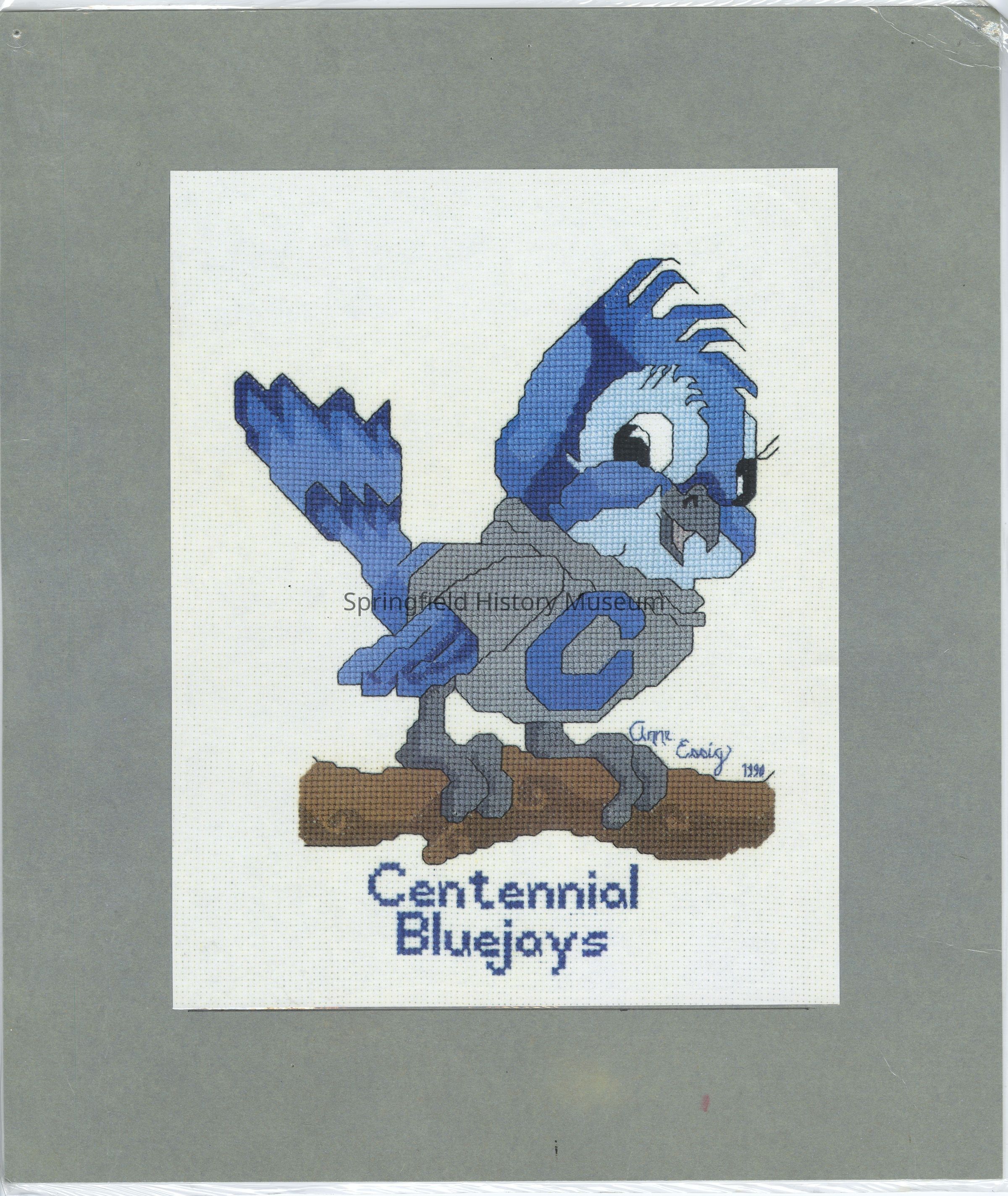 Artwork of Blue Jay Mascot, Centennial Elementary School, 1990. By Anne Essig. Laminated.Collection
