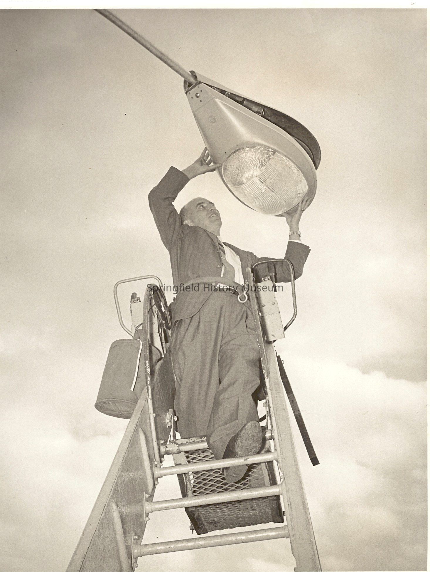 Photo of B.J. Rogers in a EWEB Truck Changing a Pole Lamp light Bulb. EWEB Photo, October 20, 1961.Collection