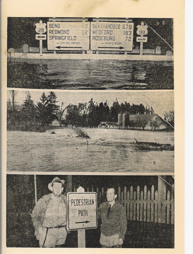 Top picture: signs for Bend, Redmond, Springfield, San Francisco, Medford, Roseburg, on old highway 99, with flood water in foreground. Center picture: flood with building and house in background. Bottom picture: two men with Pedestrian sign and fence in background. undated, 3 in 1 photo.