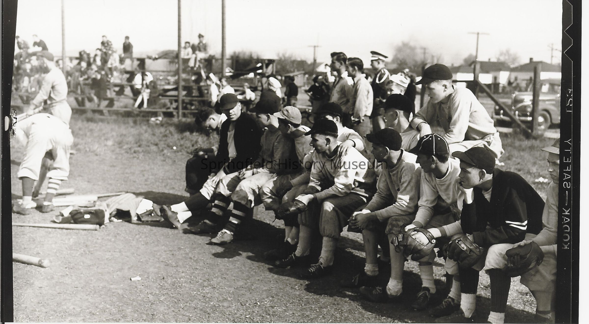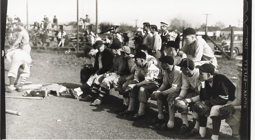 Springfield Union High Baseball Team-1940s. Outside sitting on bench during baseball game. Large group in back ground on bleachers.