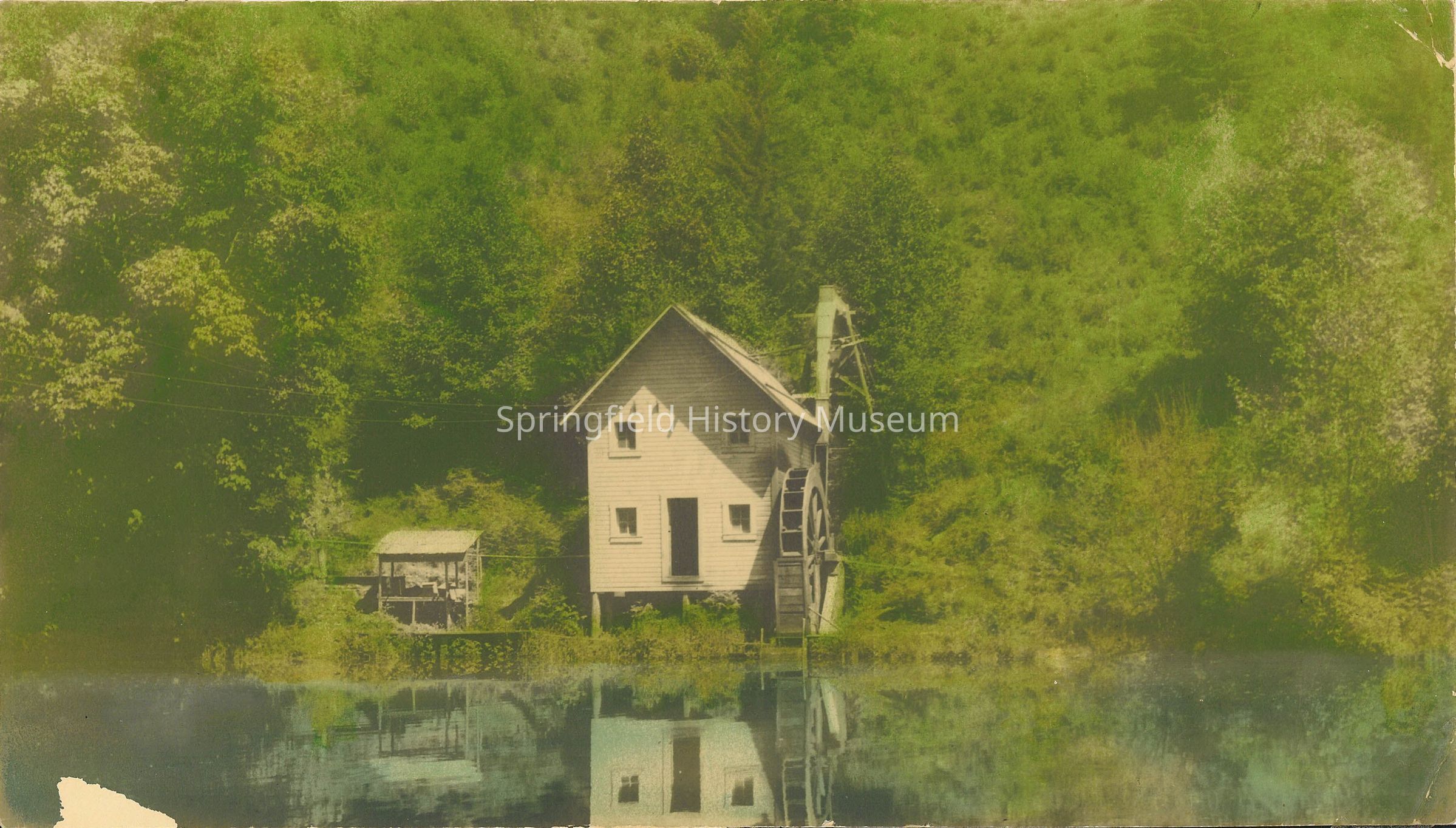 Building on waterfront with water wheel known to be Belknap Springs. Trees in background, colored by Pearl Metcalf. Unknown
