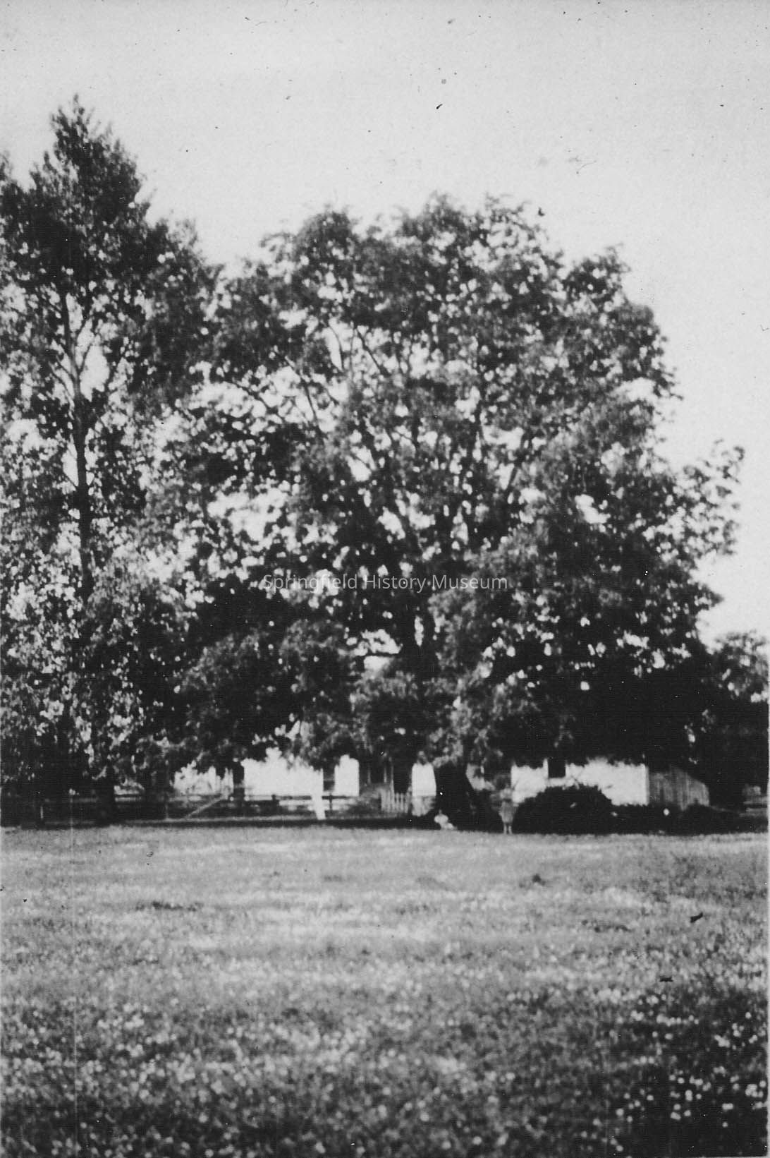 Distant view of "Millie" the black walnut tree planted by Paul Brattain. Undated