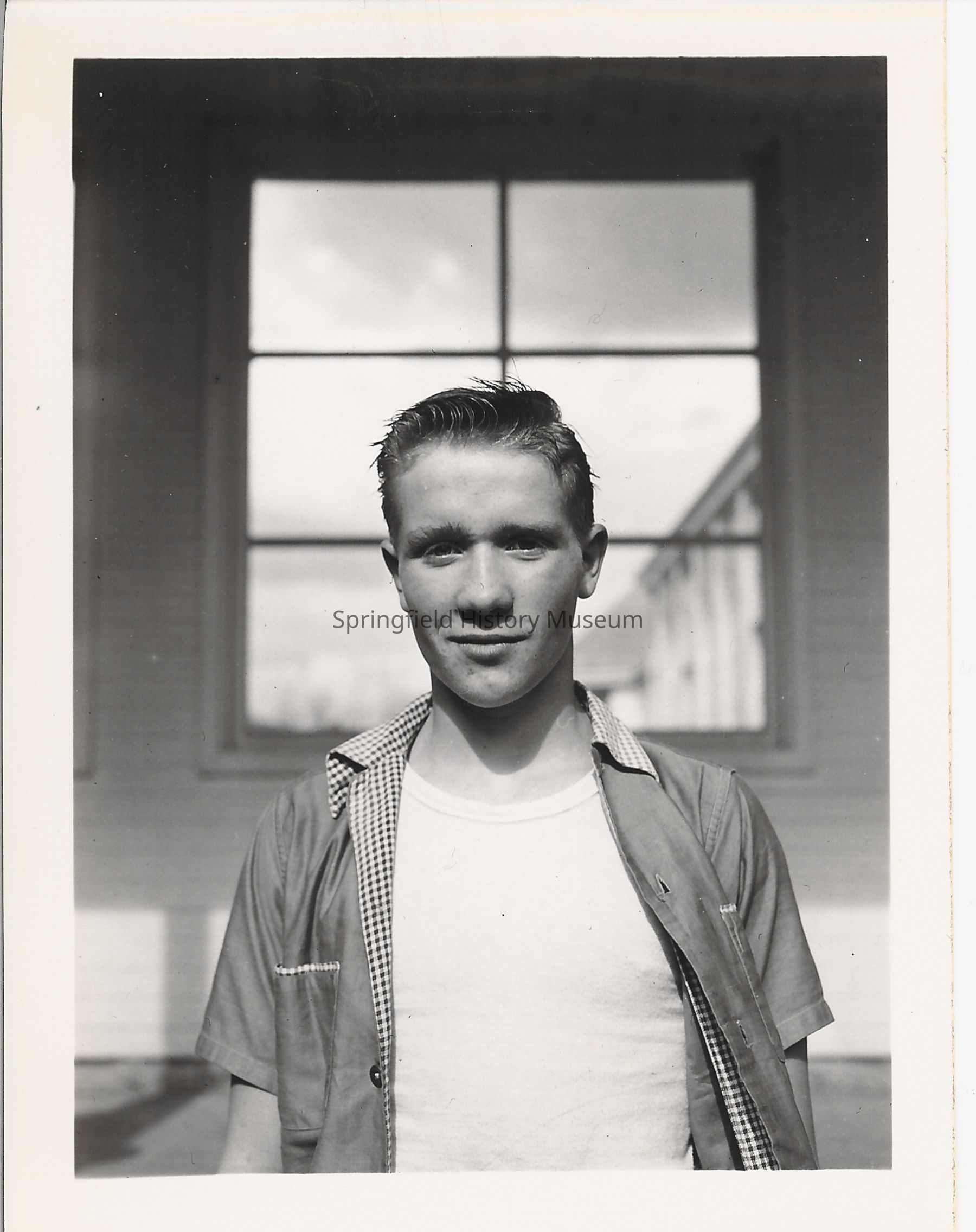 Springfied High boxer standing in front of a window outside of school building. 1940s