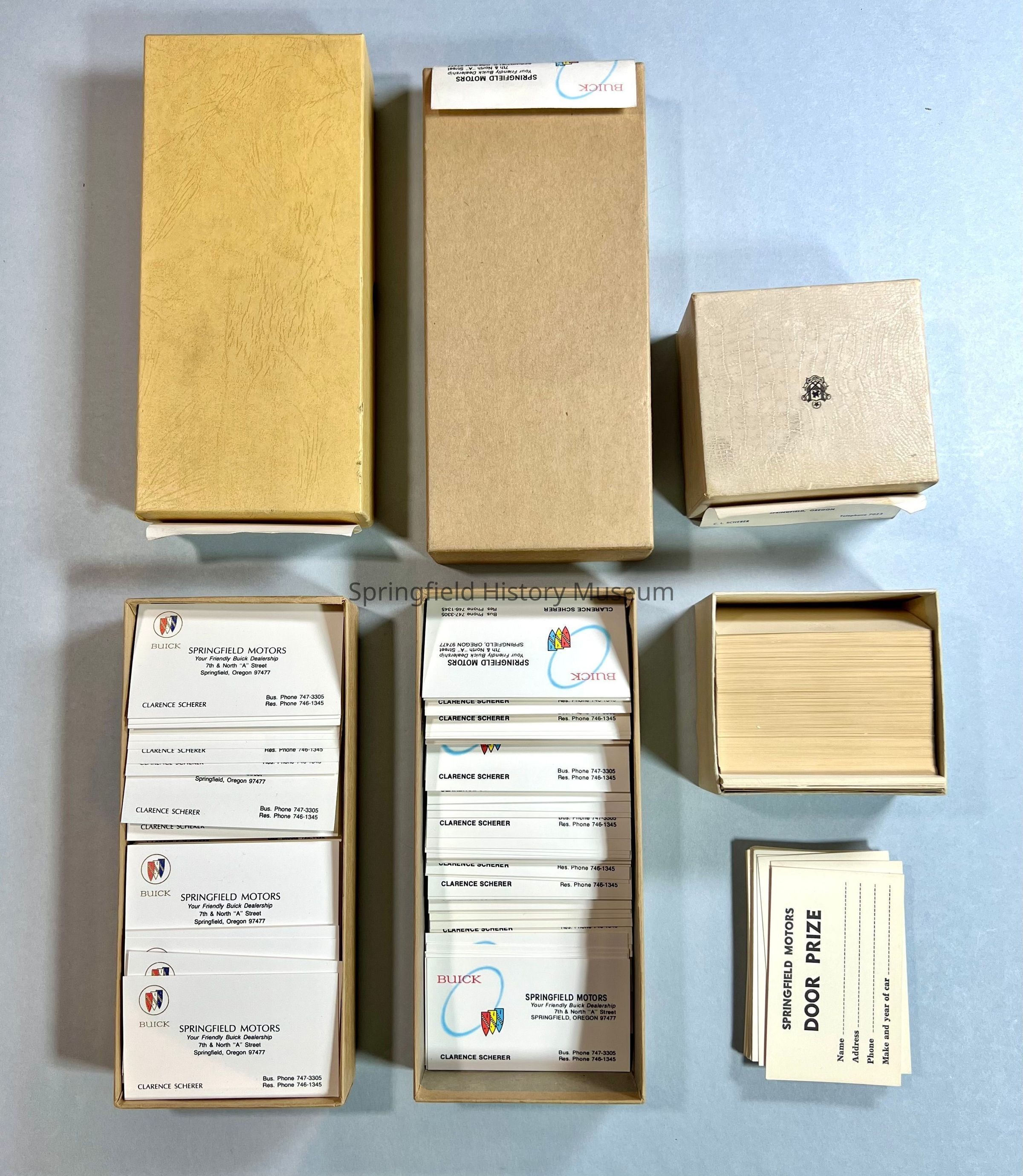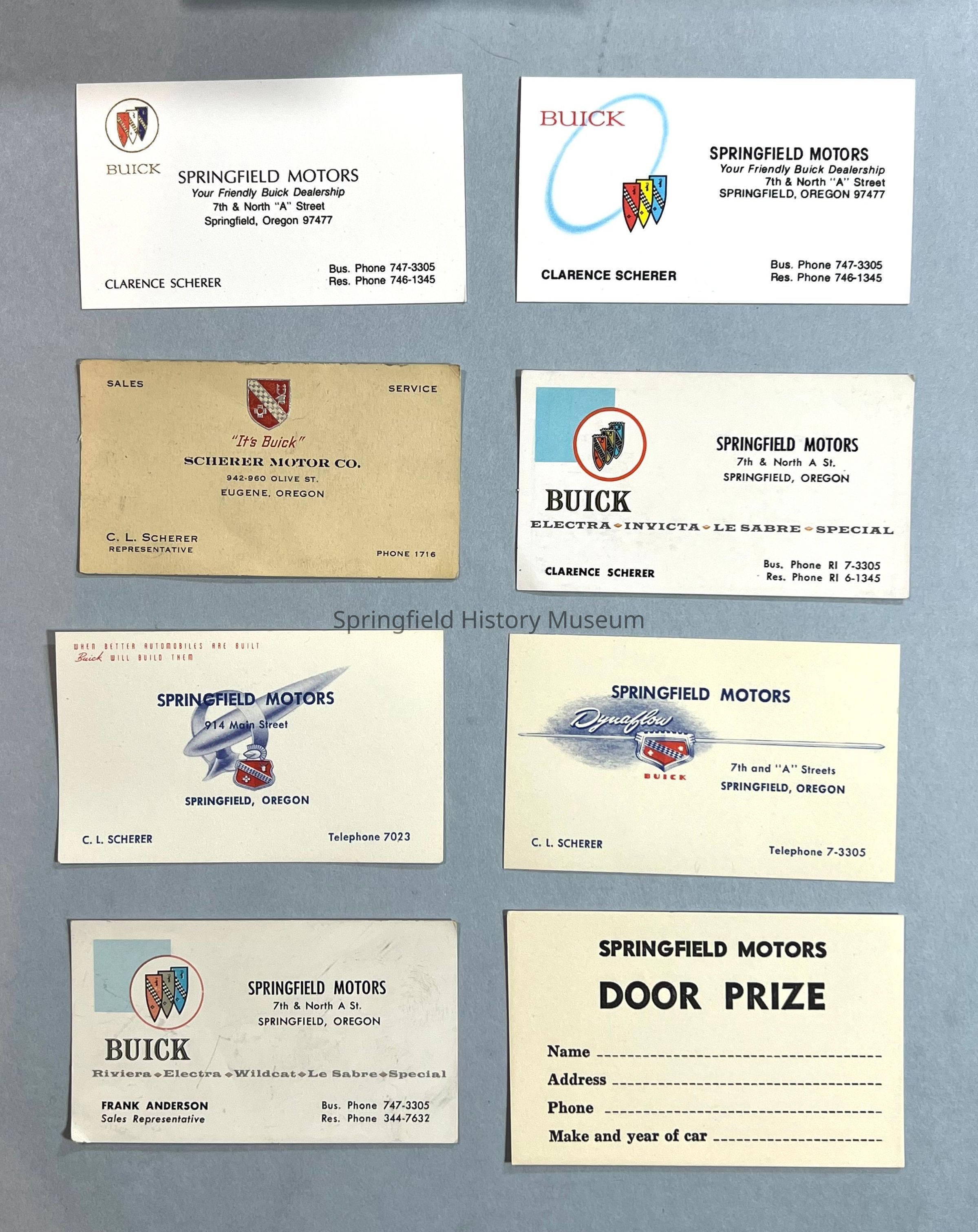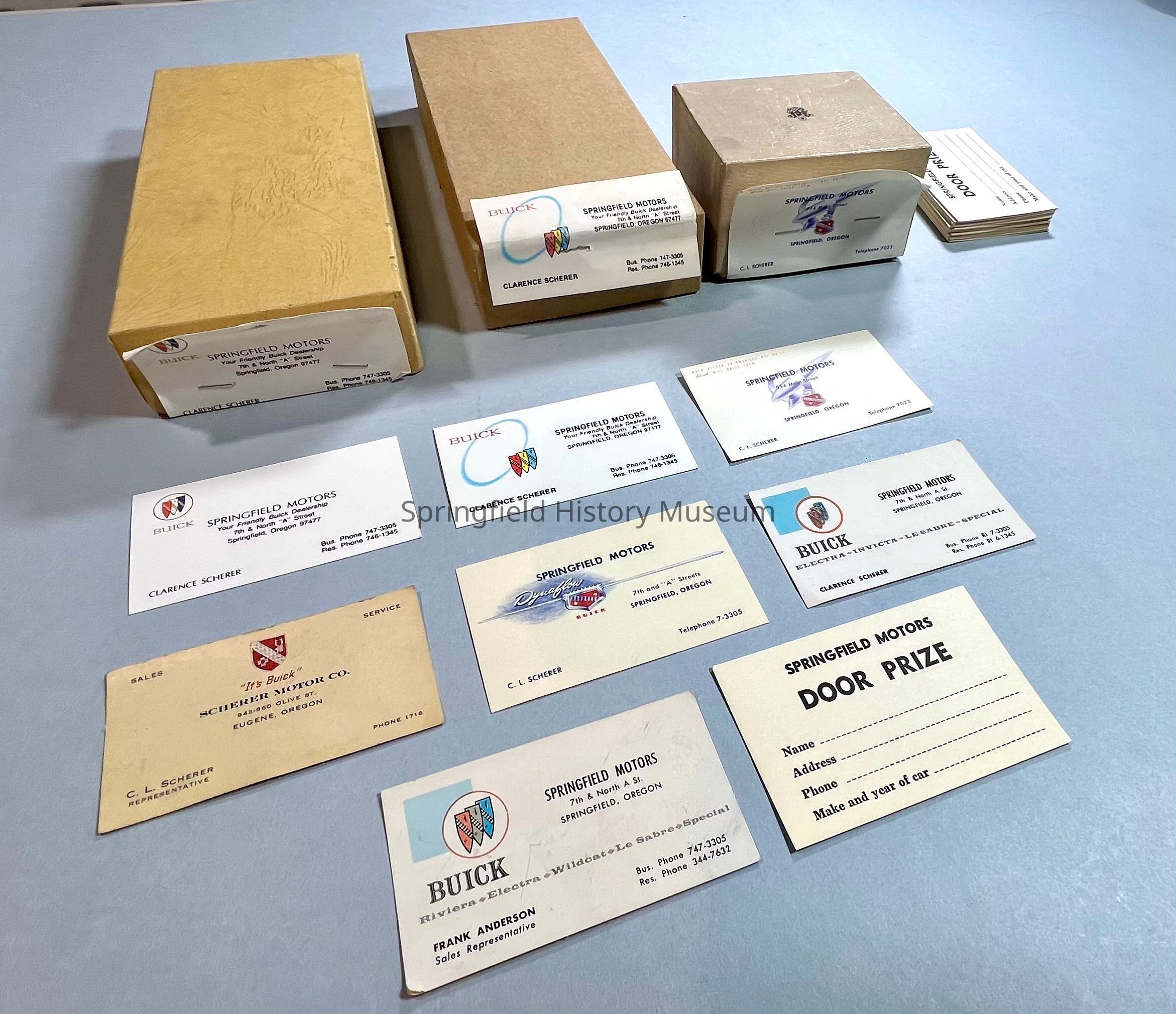 Business Cards of Springfield Motors and Clarence Scherer, Frank Anderson. Eight designs (one 'Door Prize'), kept in three original boxes and one envelope (a,b,c,d). Undated, circa 1960-1980Collection