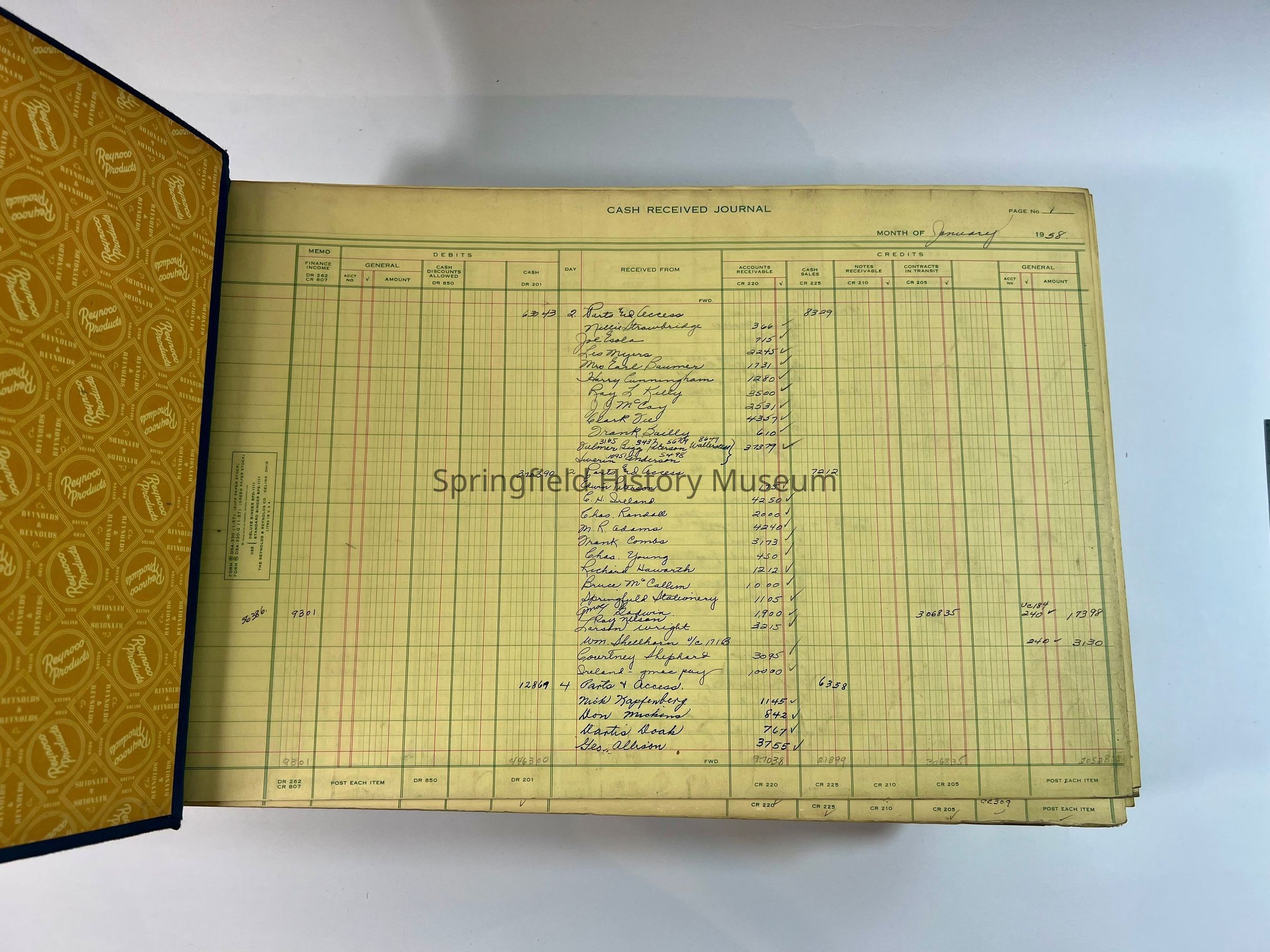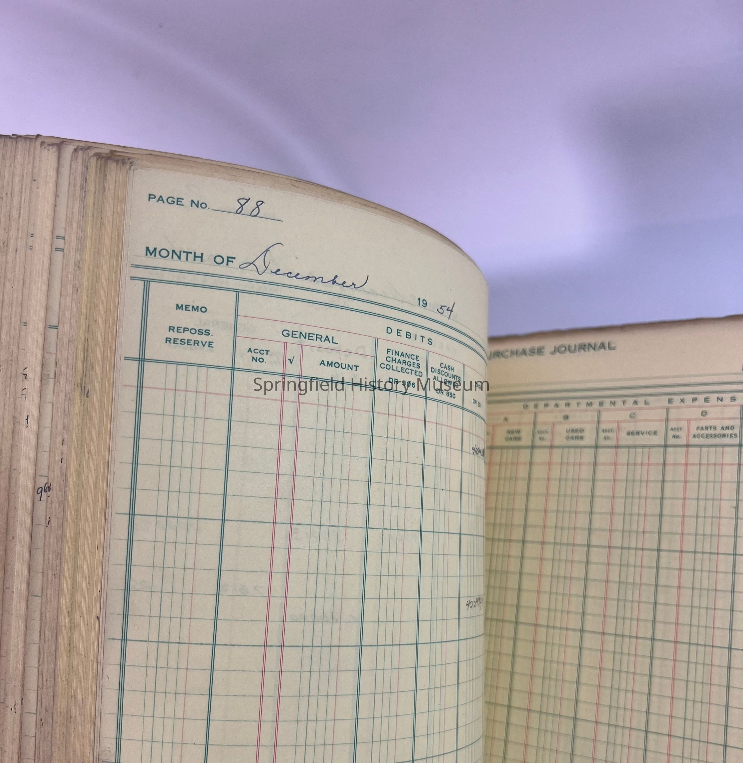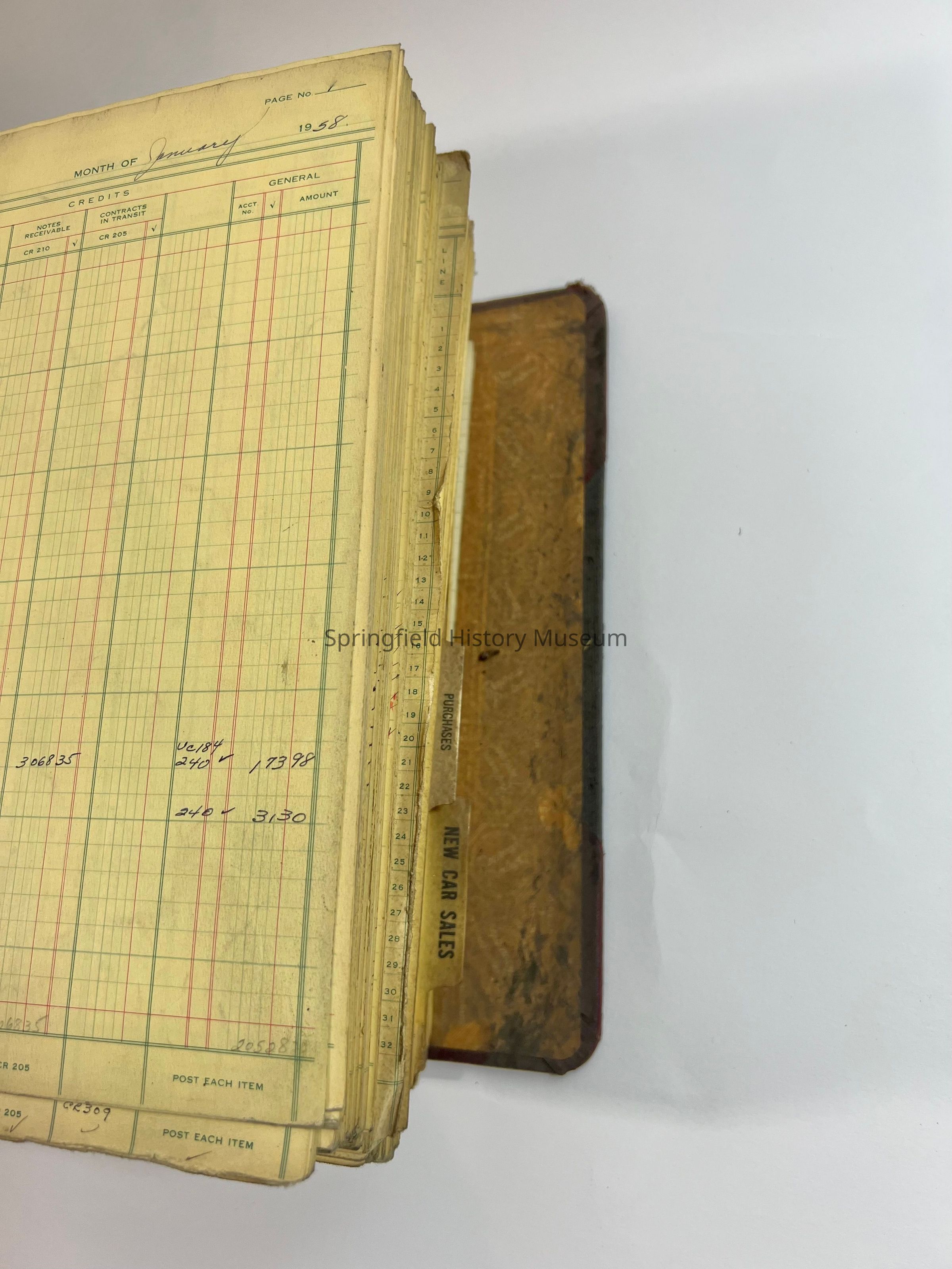 Business ledger, Springfield Motors. Large gray ledger, black cover, 1954-1958. Containing purchases and car sales.