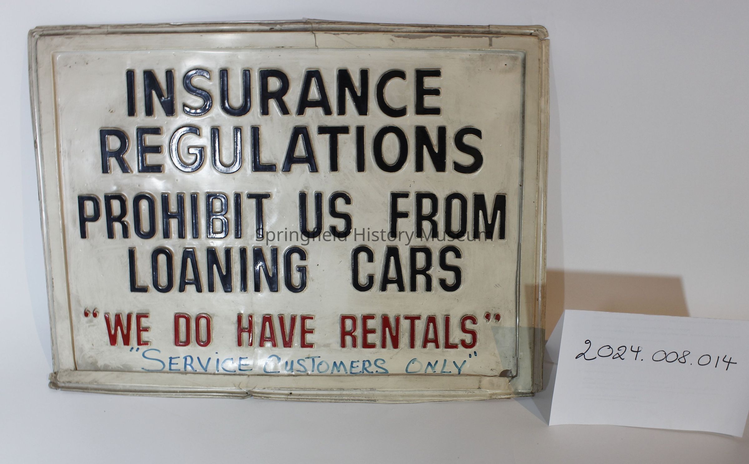 Plastic sign describing insurance regulations at Springfield Buick, undated