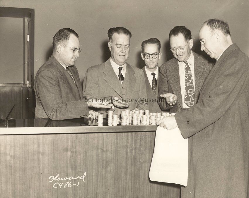 Business men of Springfield, Harold Burge, Bill Marshall, Dallas Murphy, John Litcomb and one unknown. Group of five men with stacks of large coins or tokens. Undated. Marked "Howard C486-1"