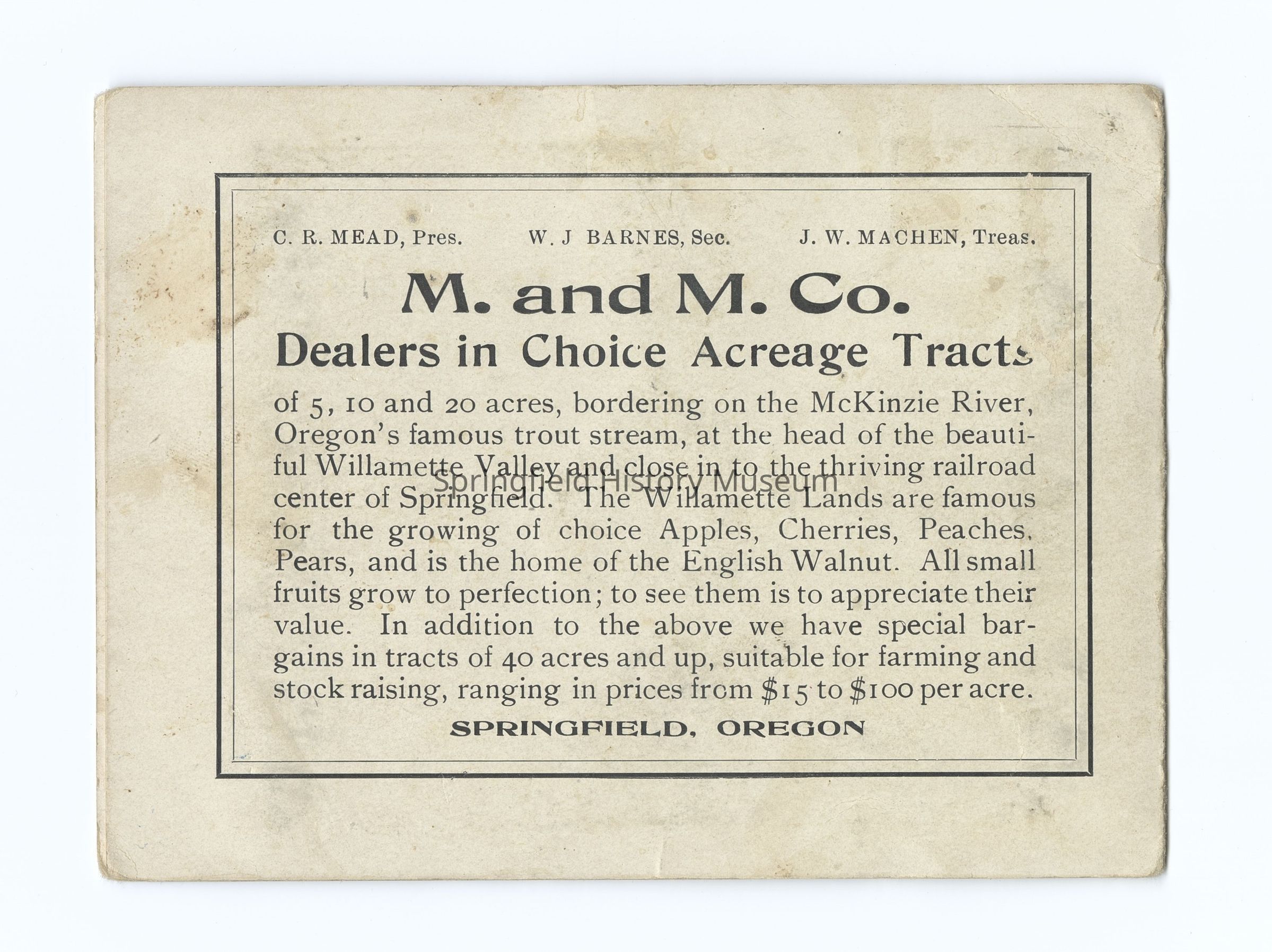 Small folded 11-panel booklet containing facts and pictures of Springfield and area. Has handwritten anecdotes next to some of the places in the booklet. Published by the Railroad and Lumber Center of the Upper Willamette Valley. Undated, circa 1910Context