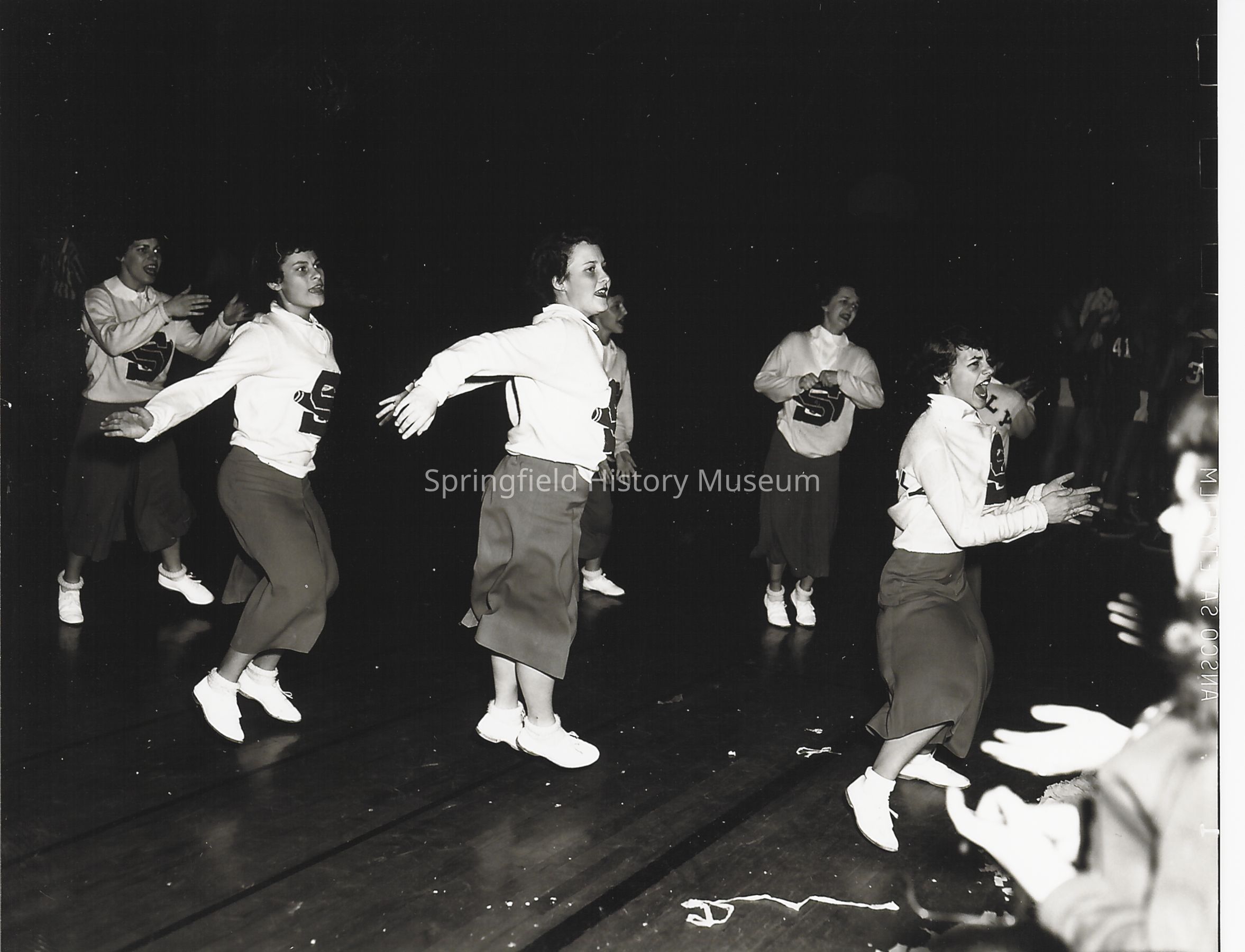 Springfield High School Cheerleaders, during preformance in gym. circa 1951