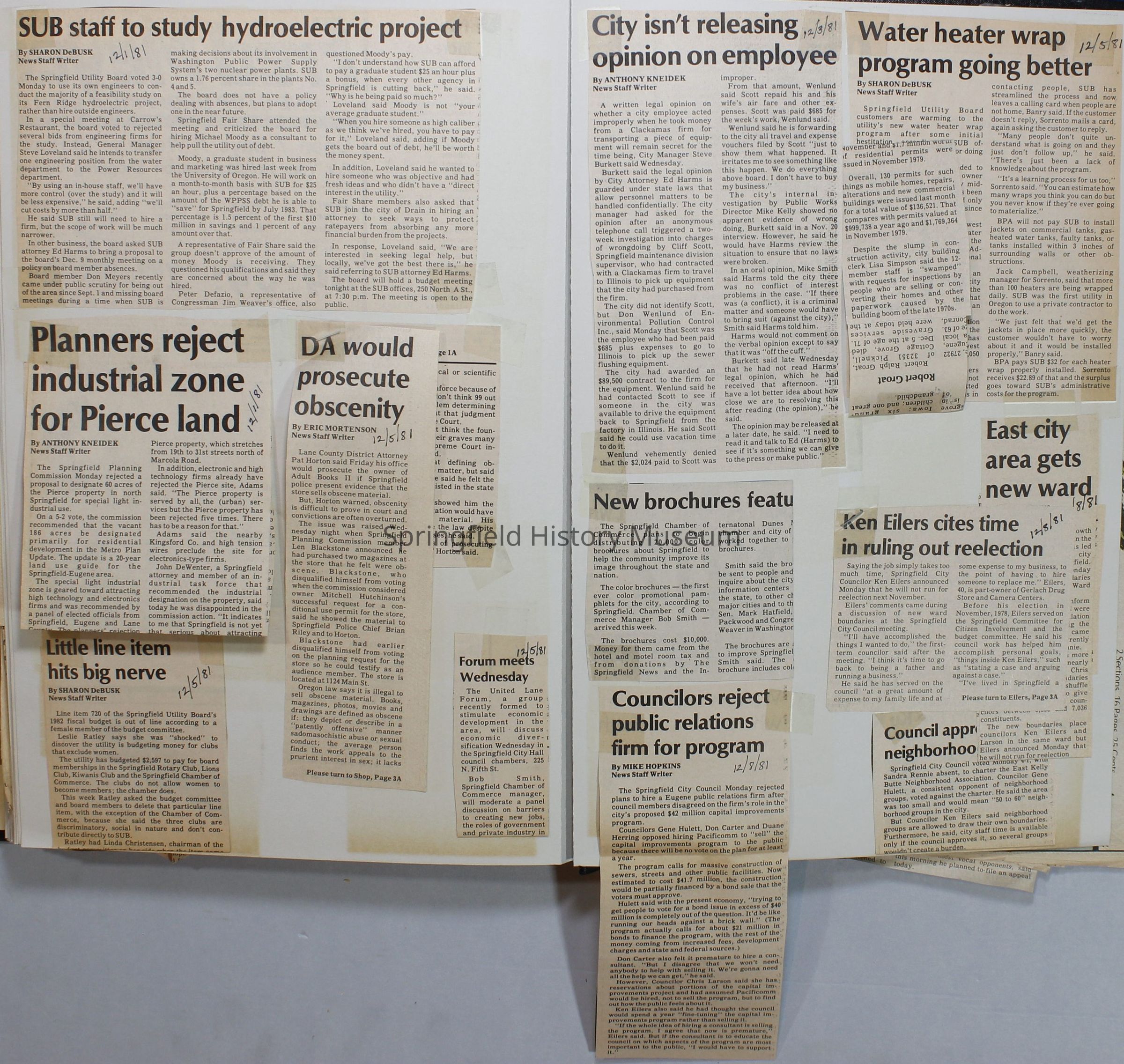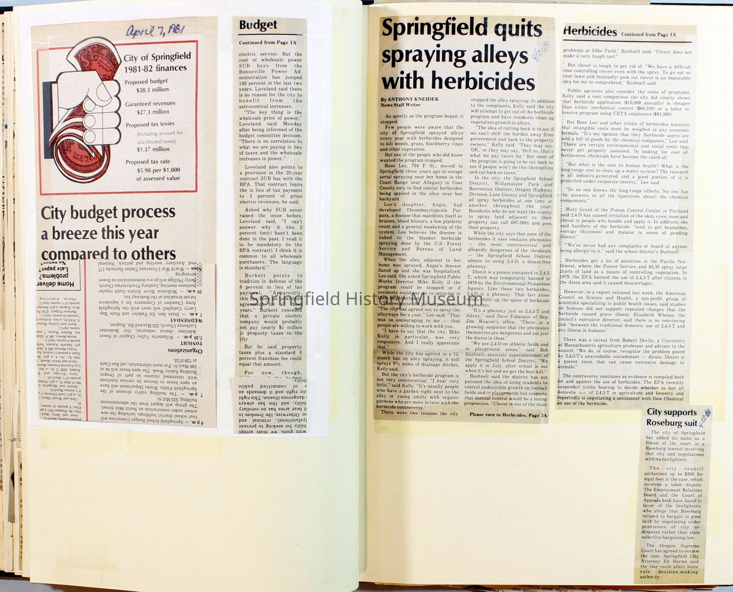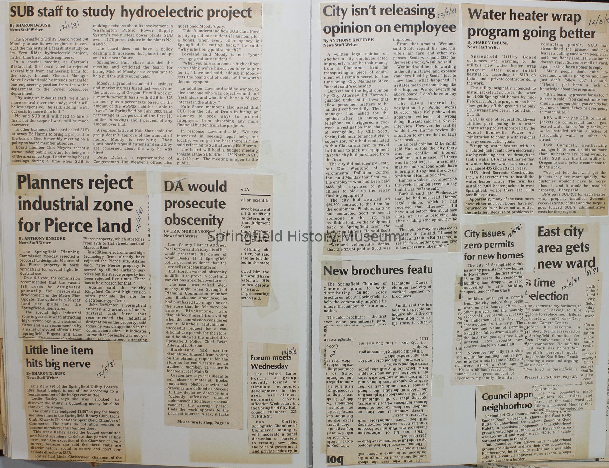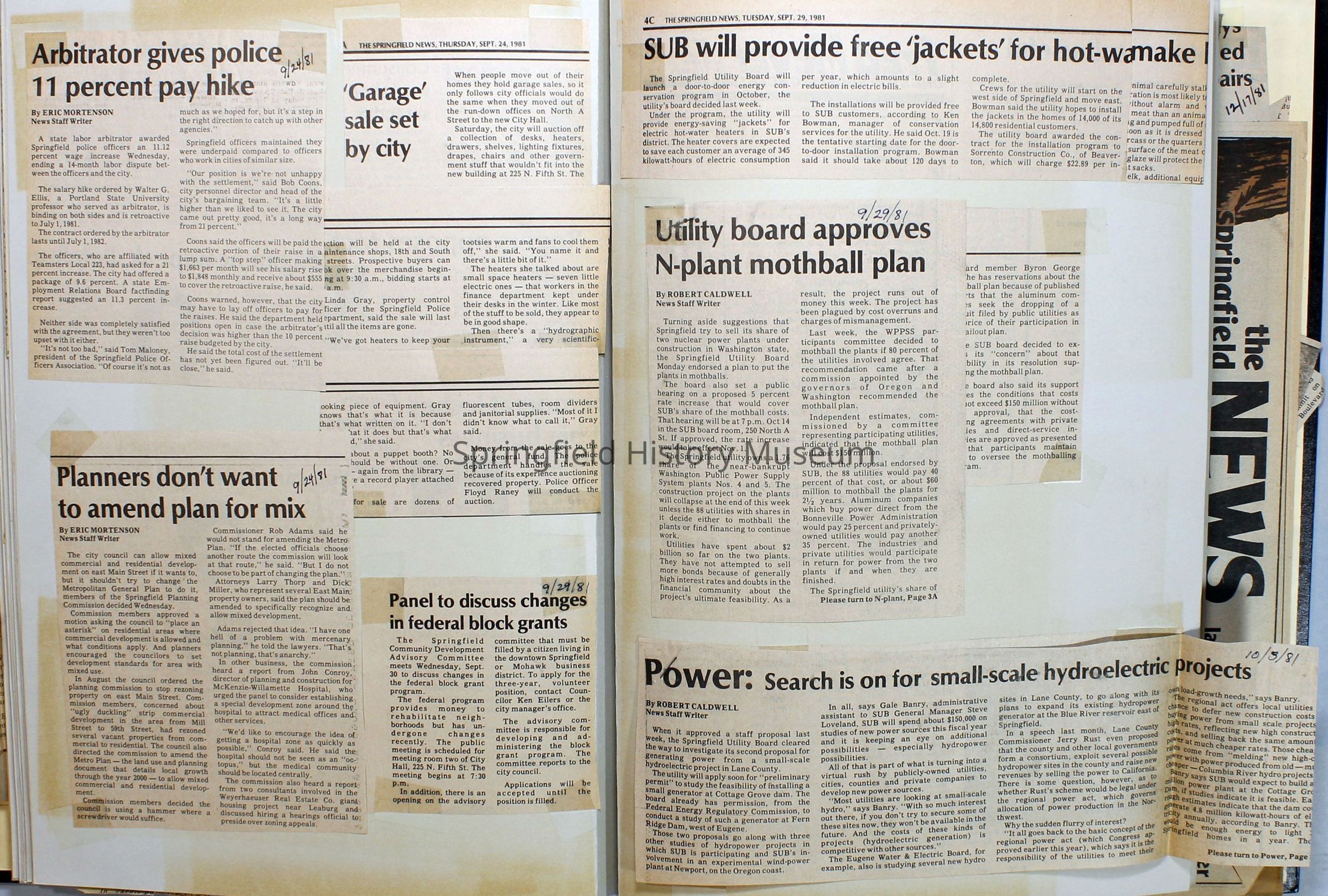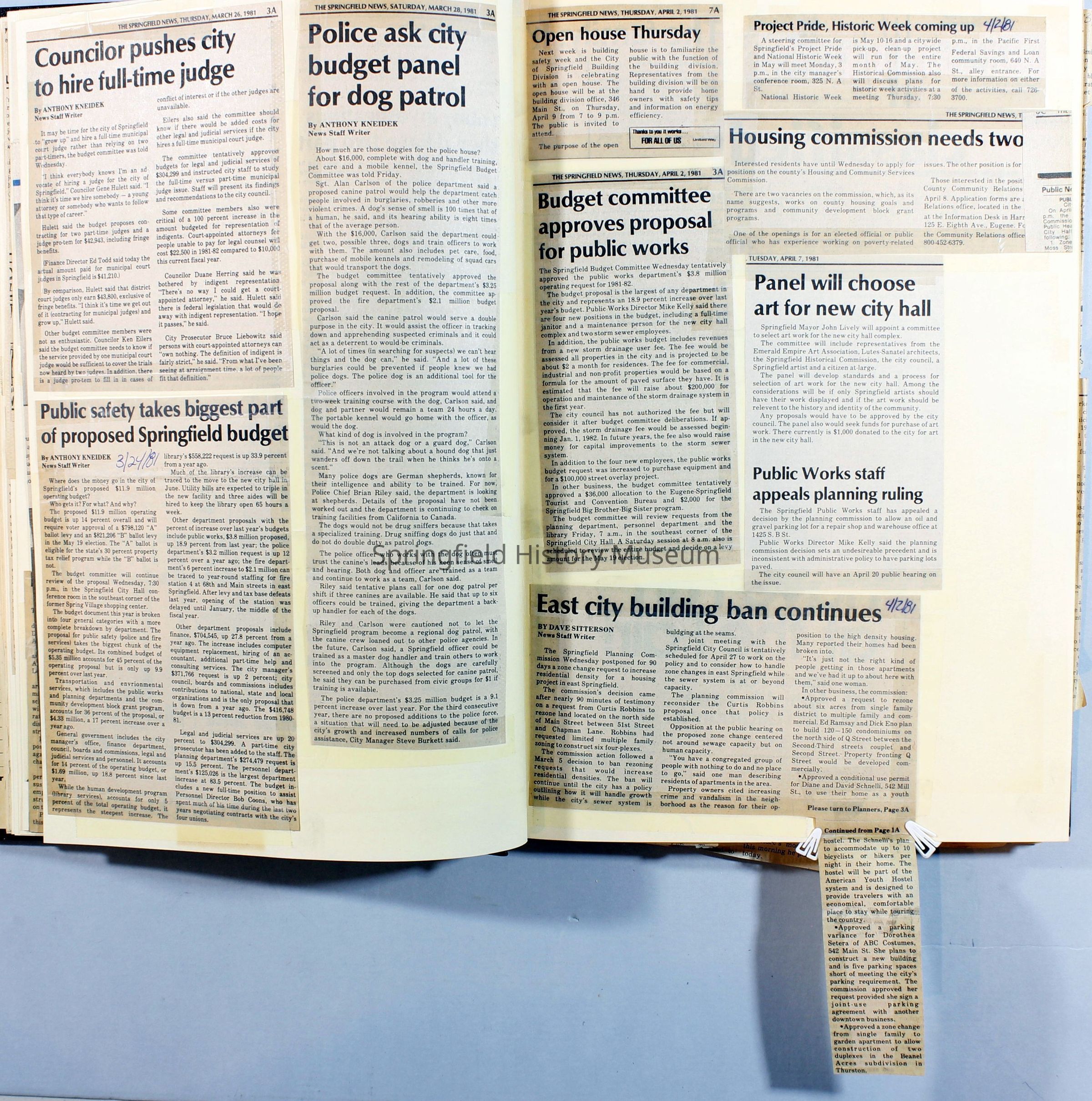 Scrapbook on the government of Springfield, Oregon. Newspaper articles from the Springfield News, 1981.