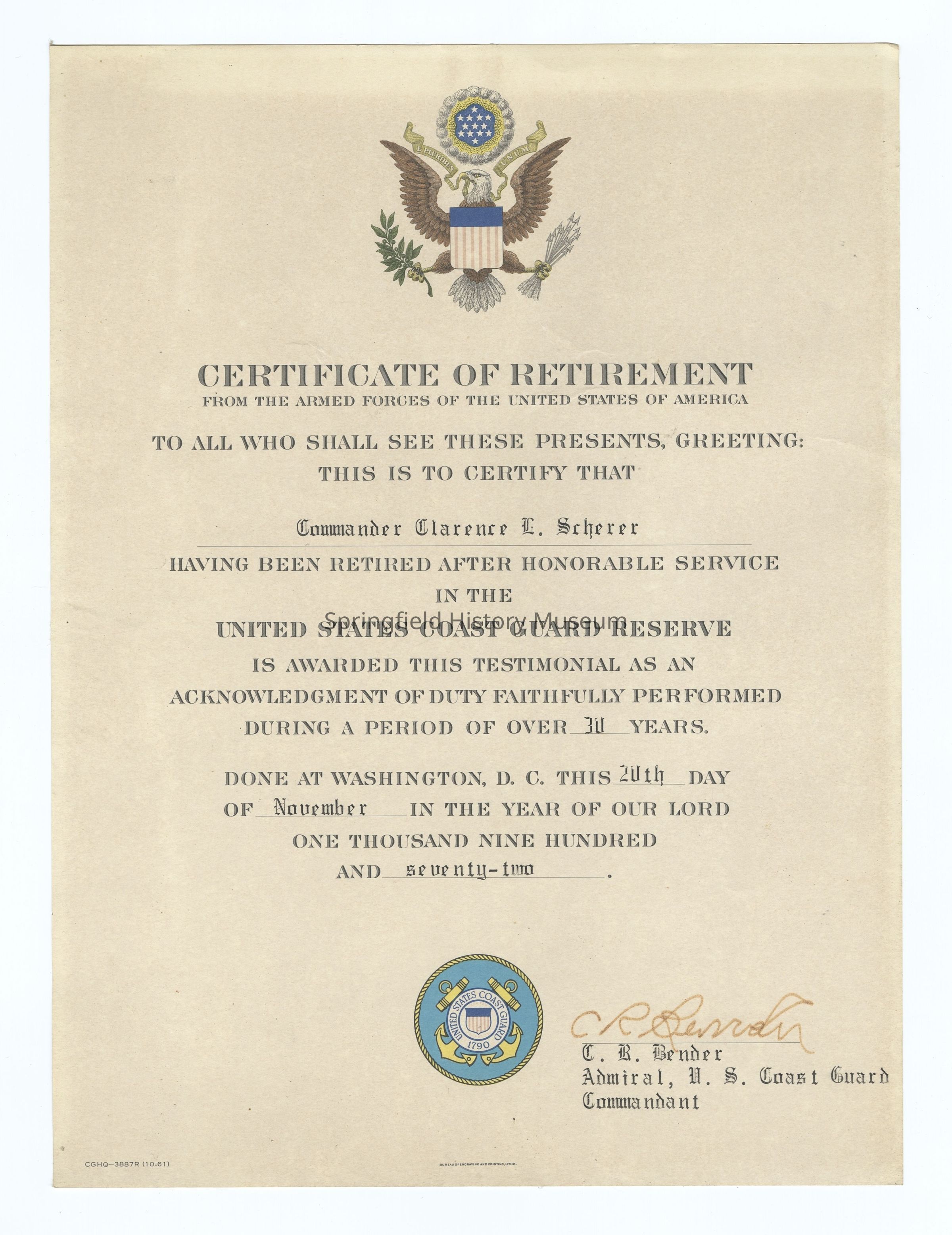 Clarence Scherer Retirement Certificate, U.S. Coast Guard, 1972. States his honorable retirement for over 30 years of service.Collection
