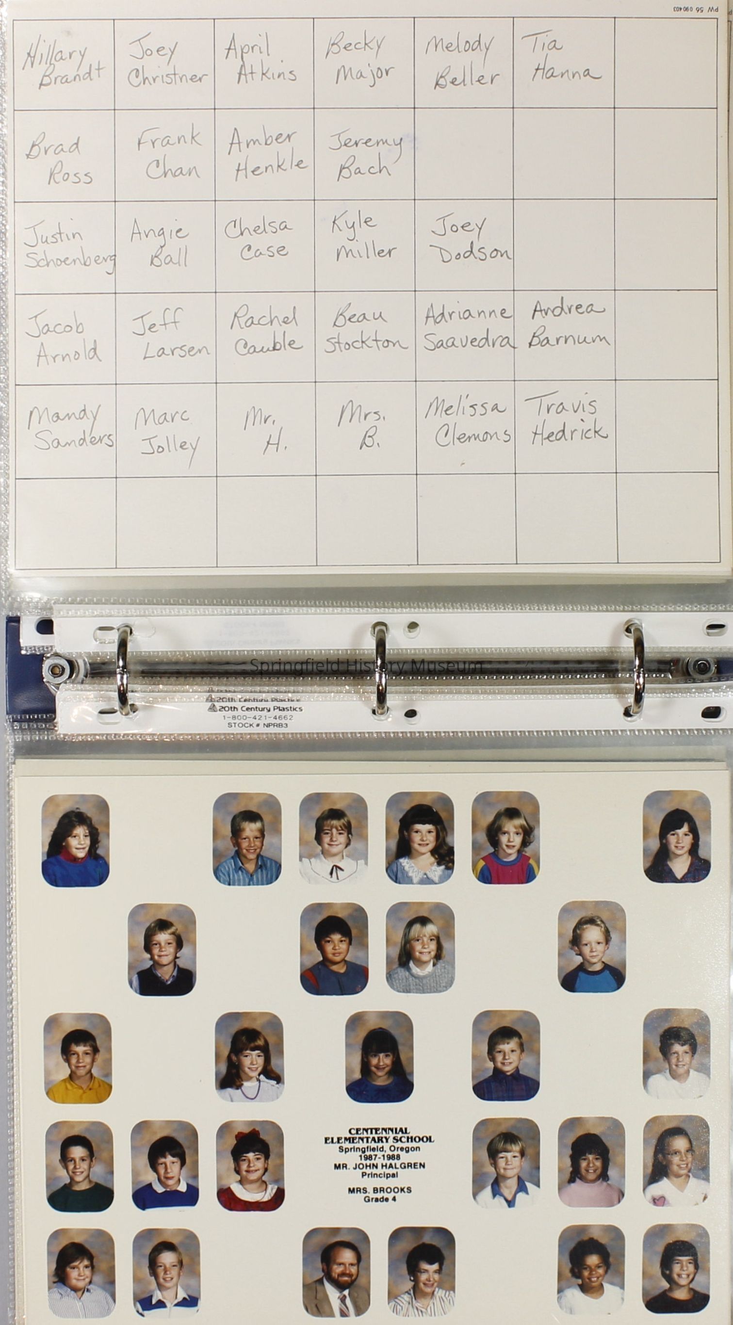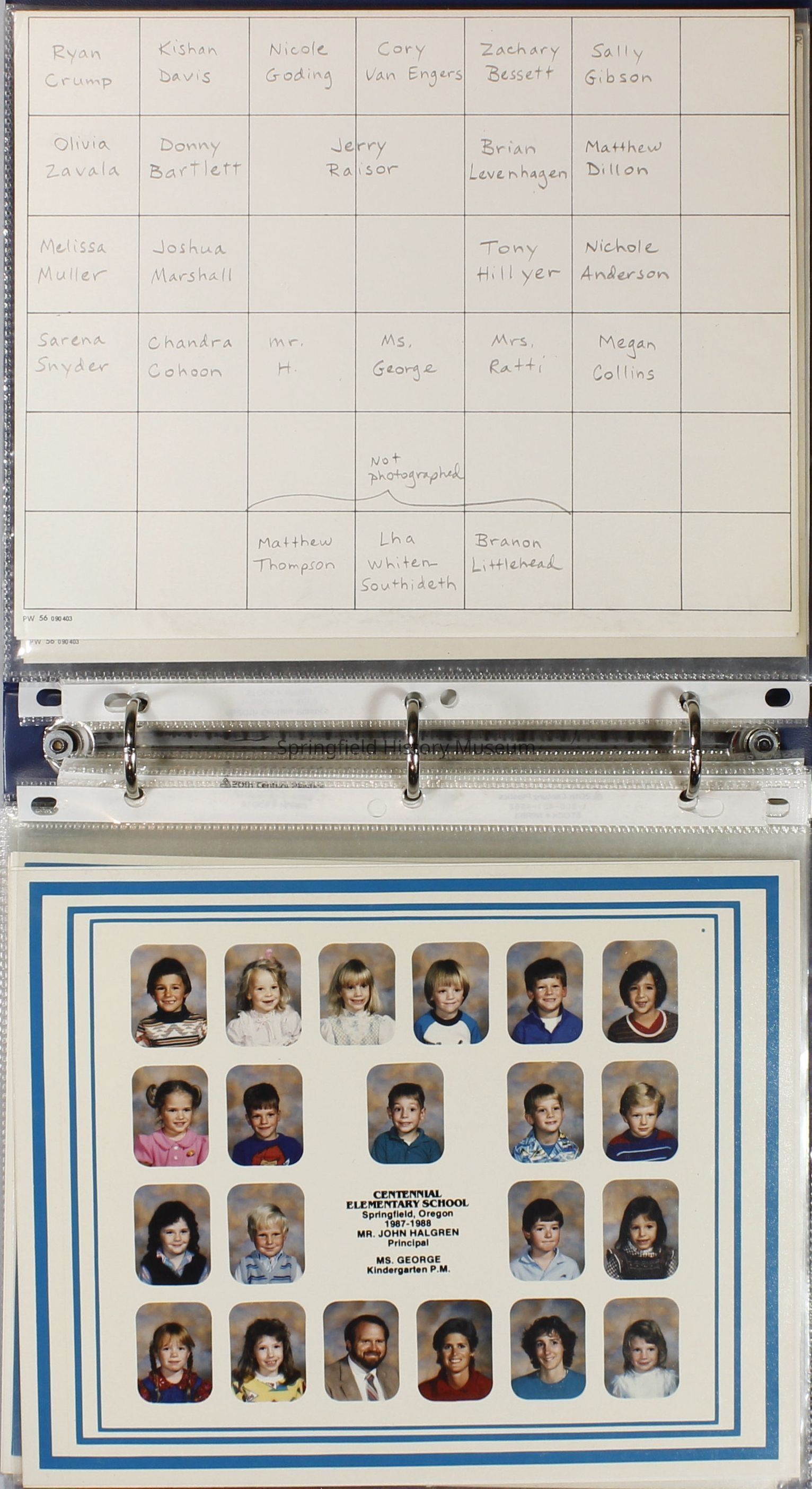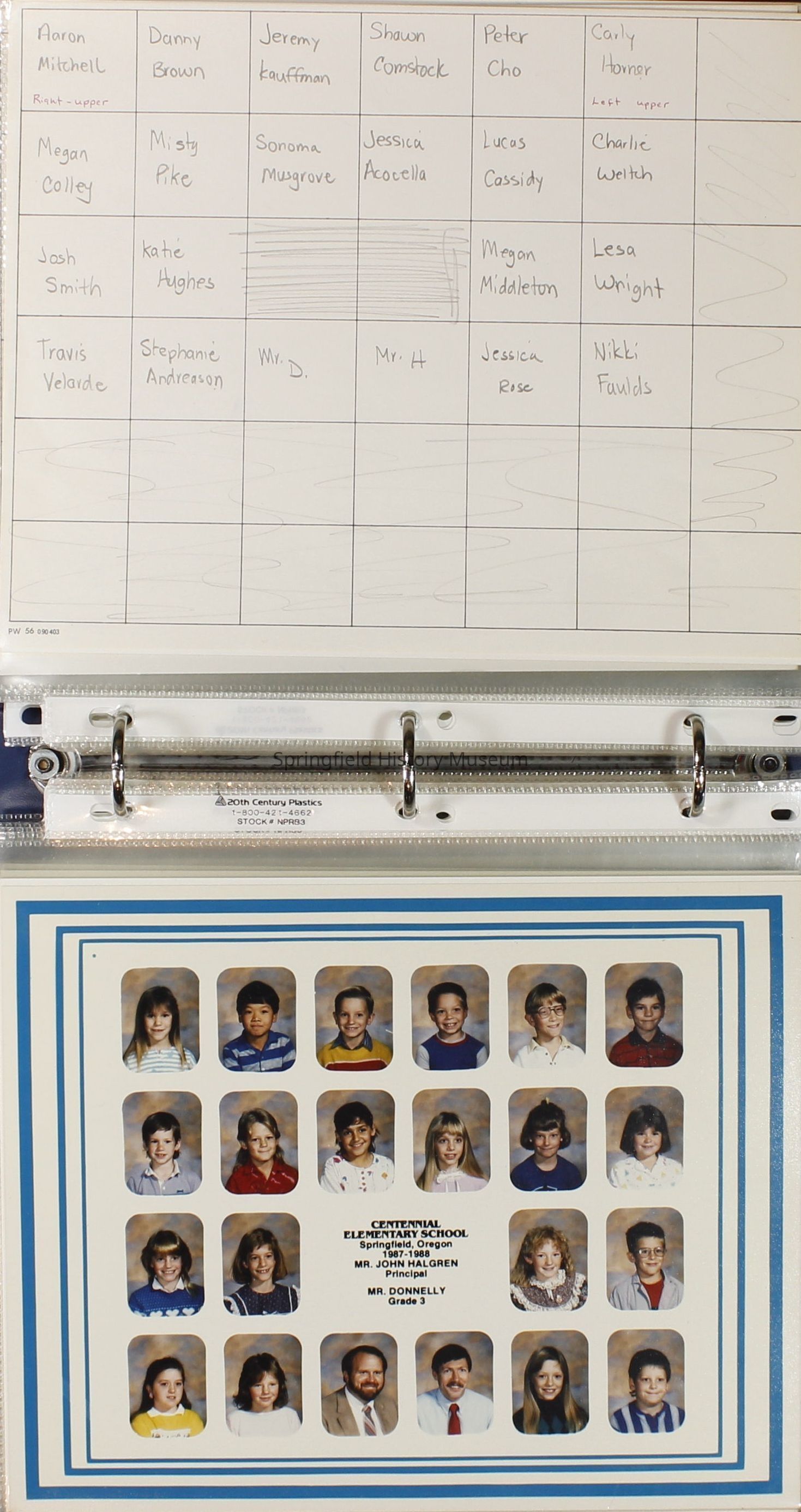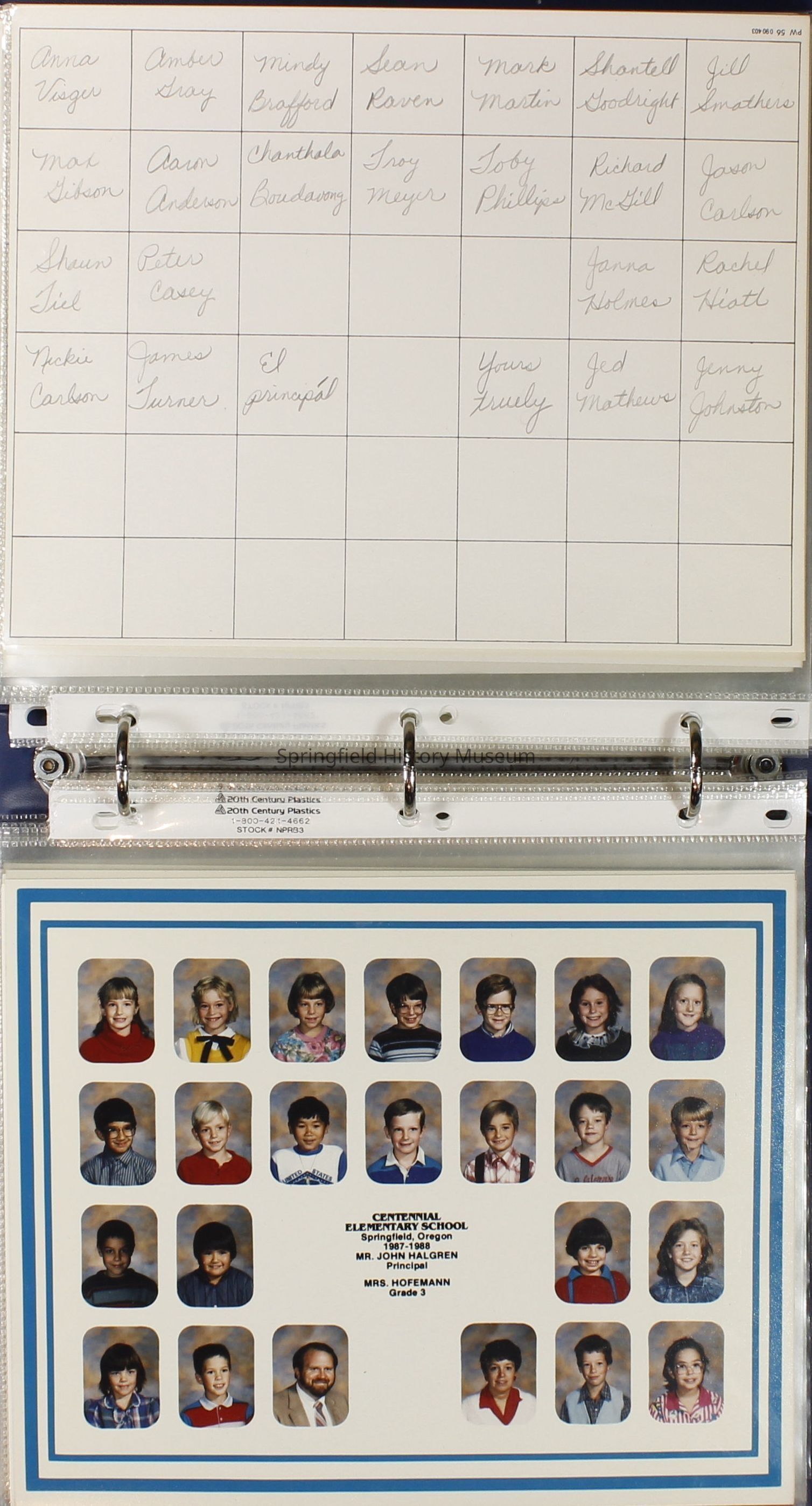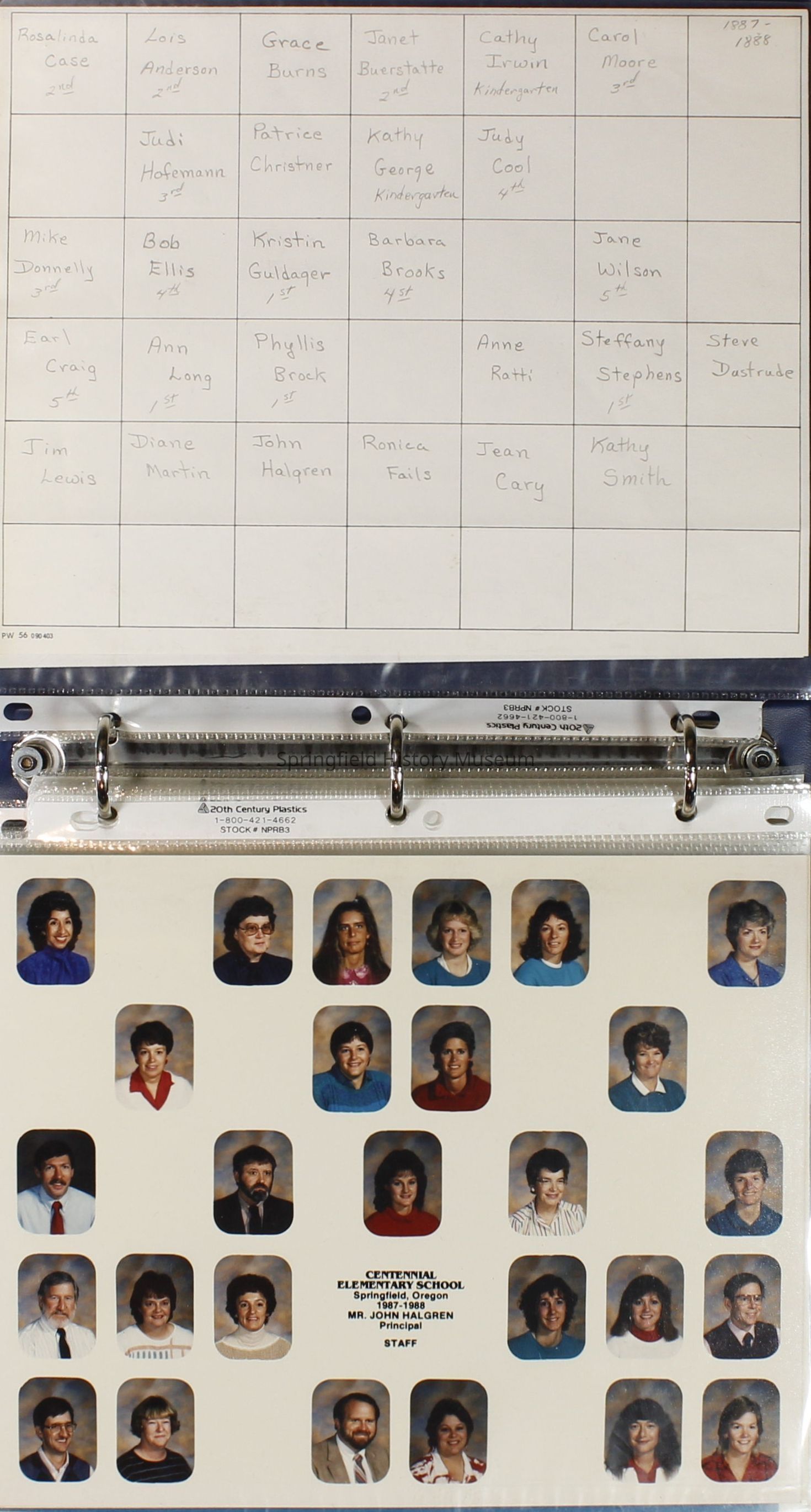 Class and Staff photographs, Centennial Elementary School, 1987-1988. Stored in a photograph album.Photograph Details