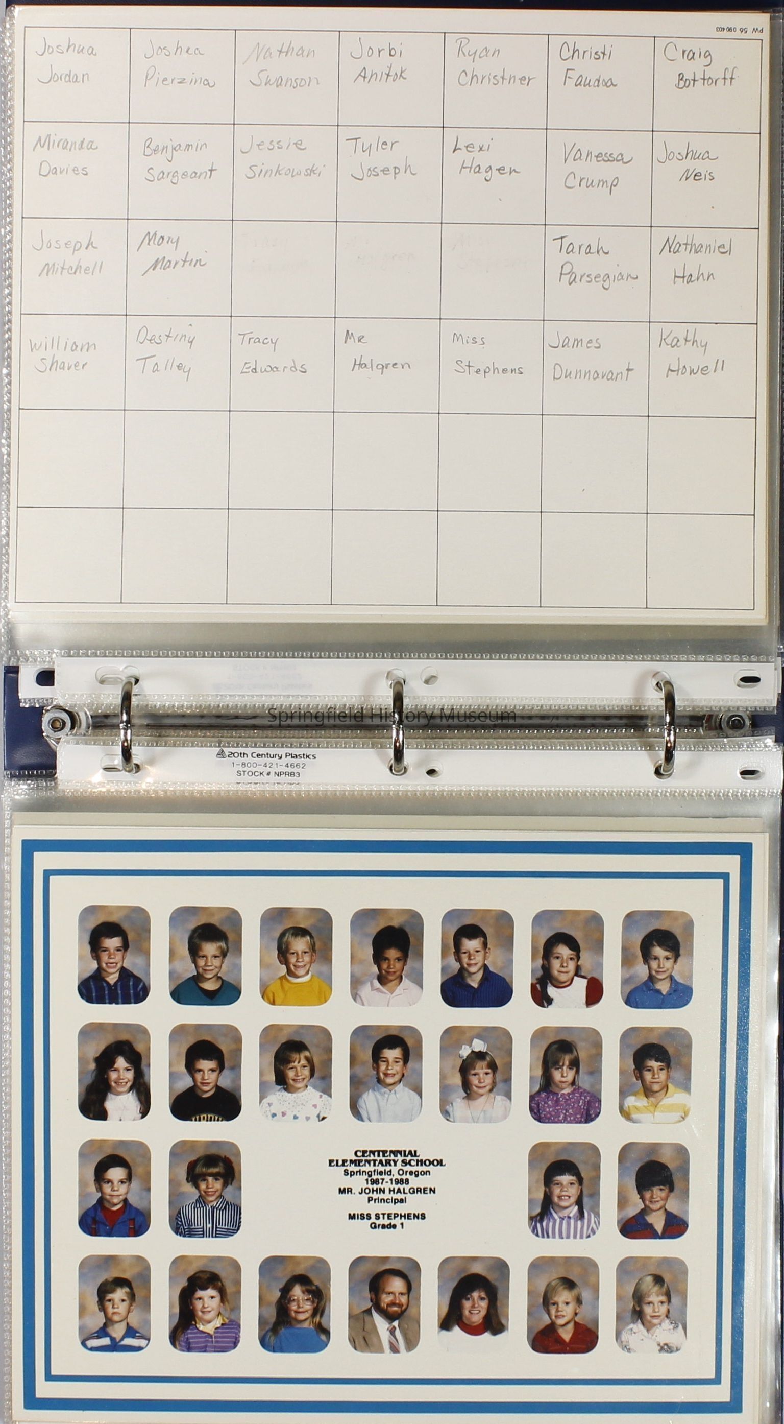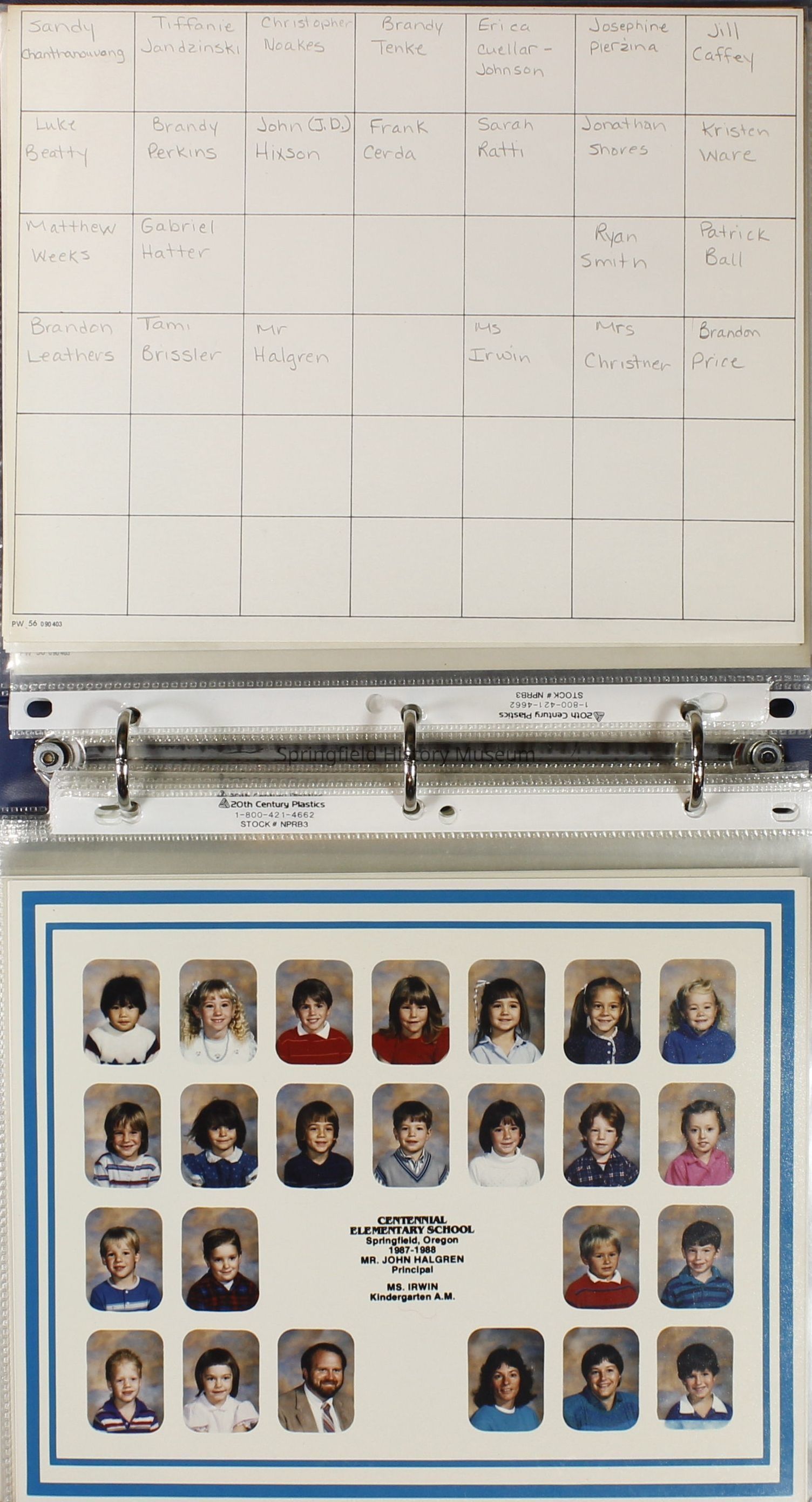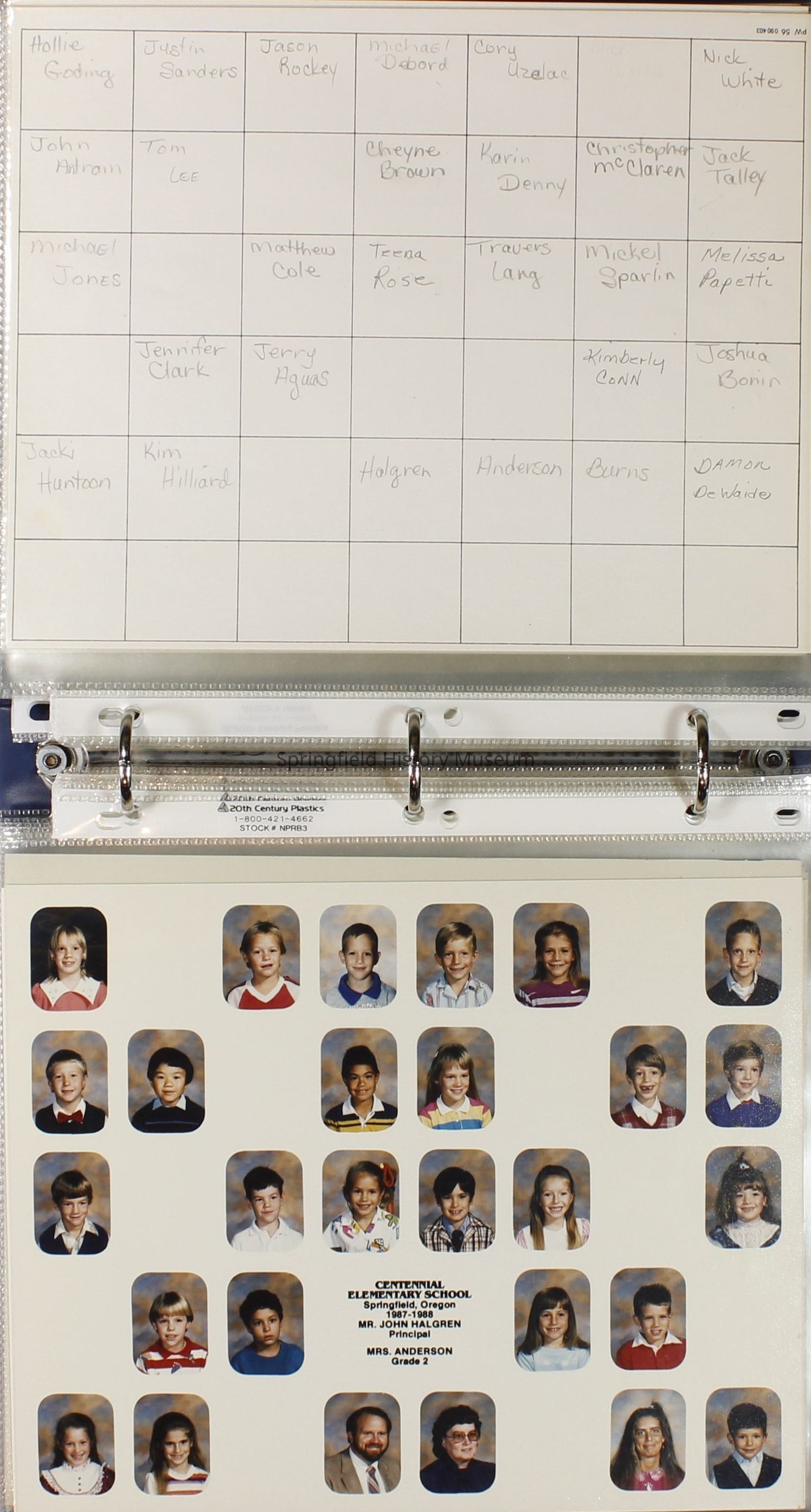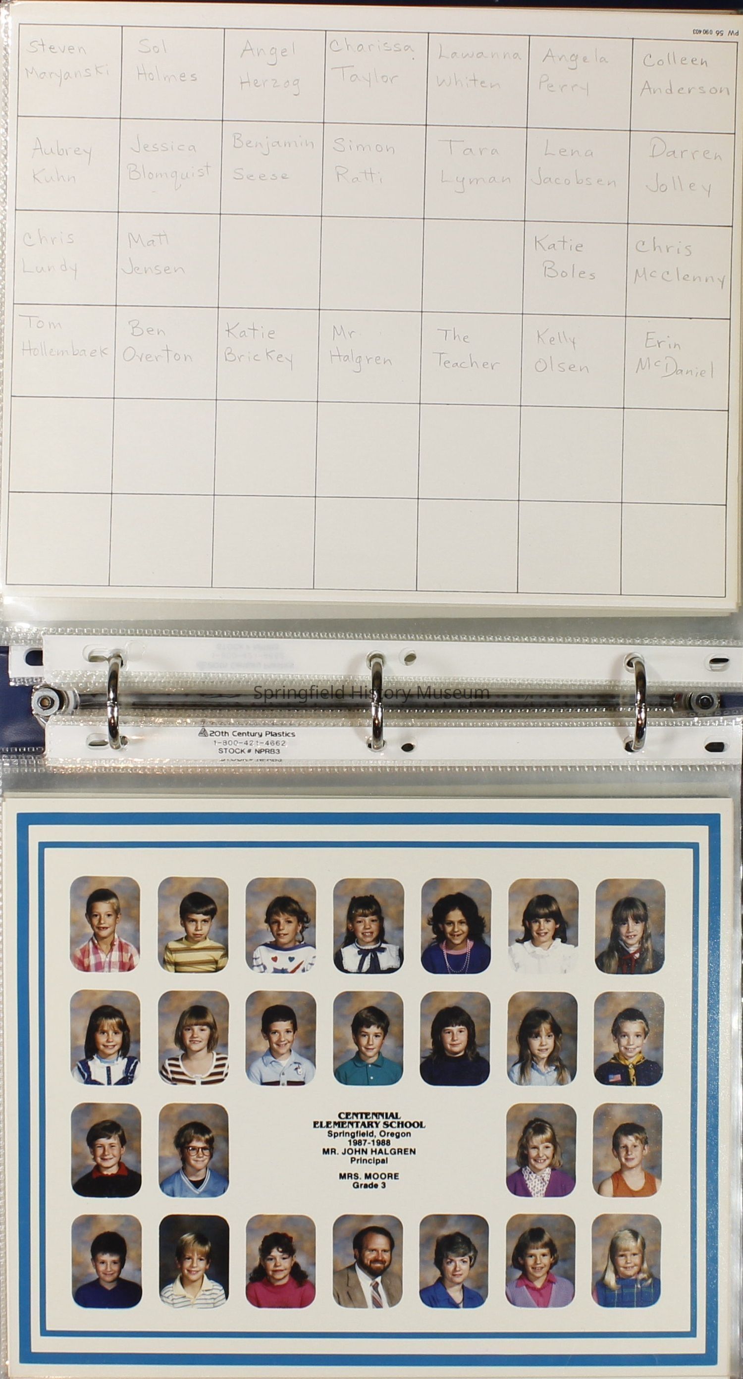 Class and Staff photographs, Centennial Elementary School, 1987-1988. Stored in a photograph album.Photograph Details