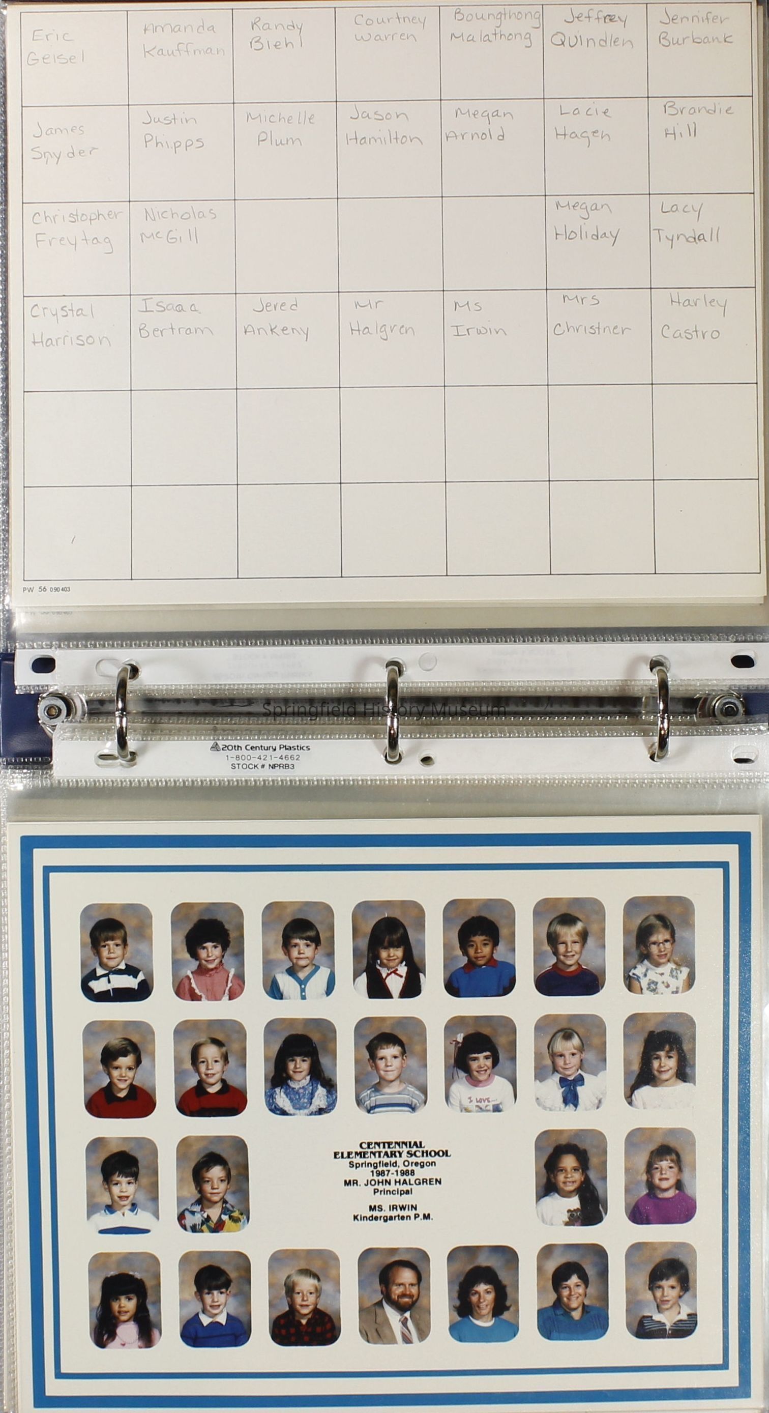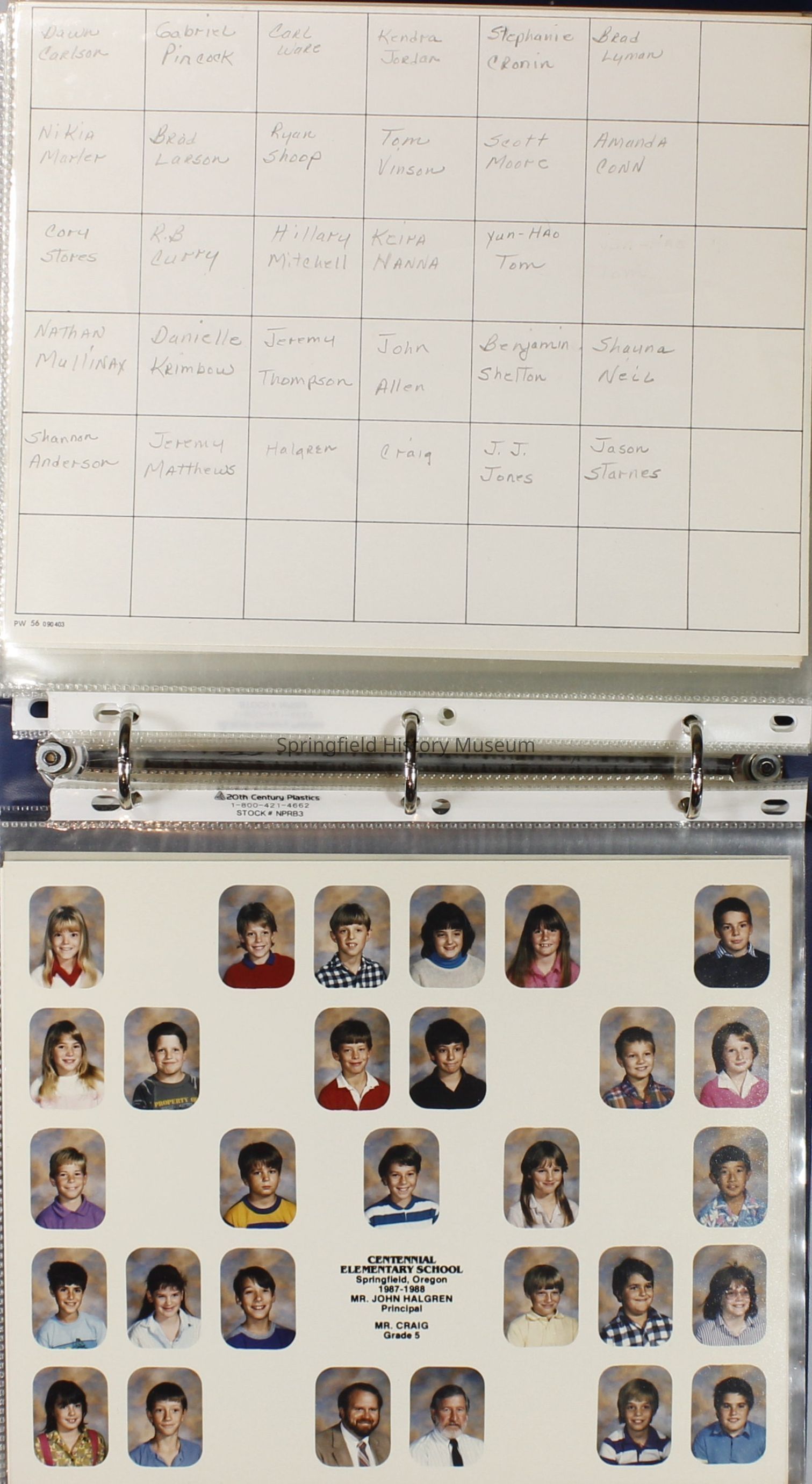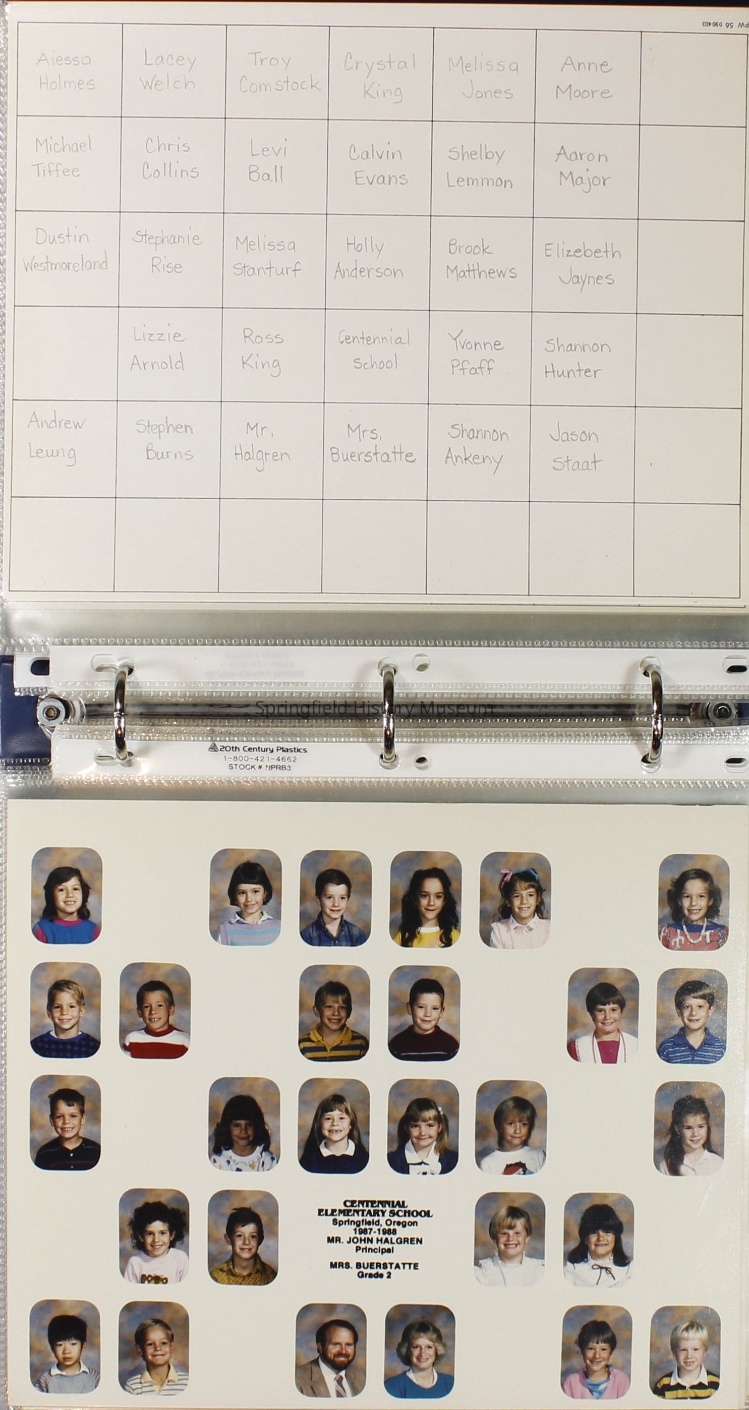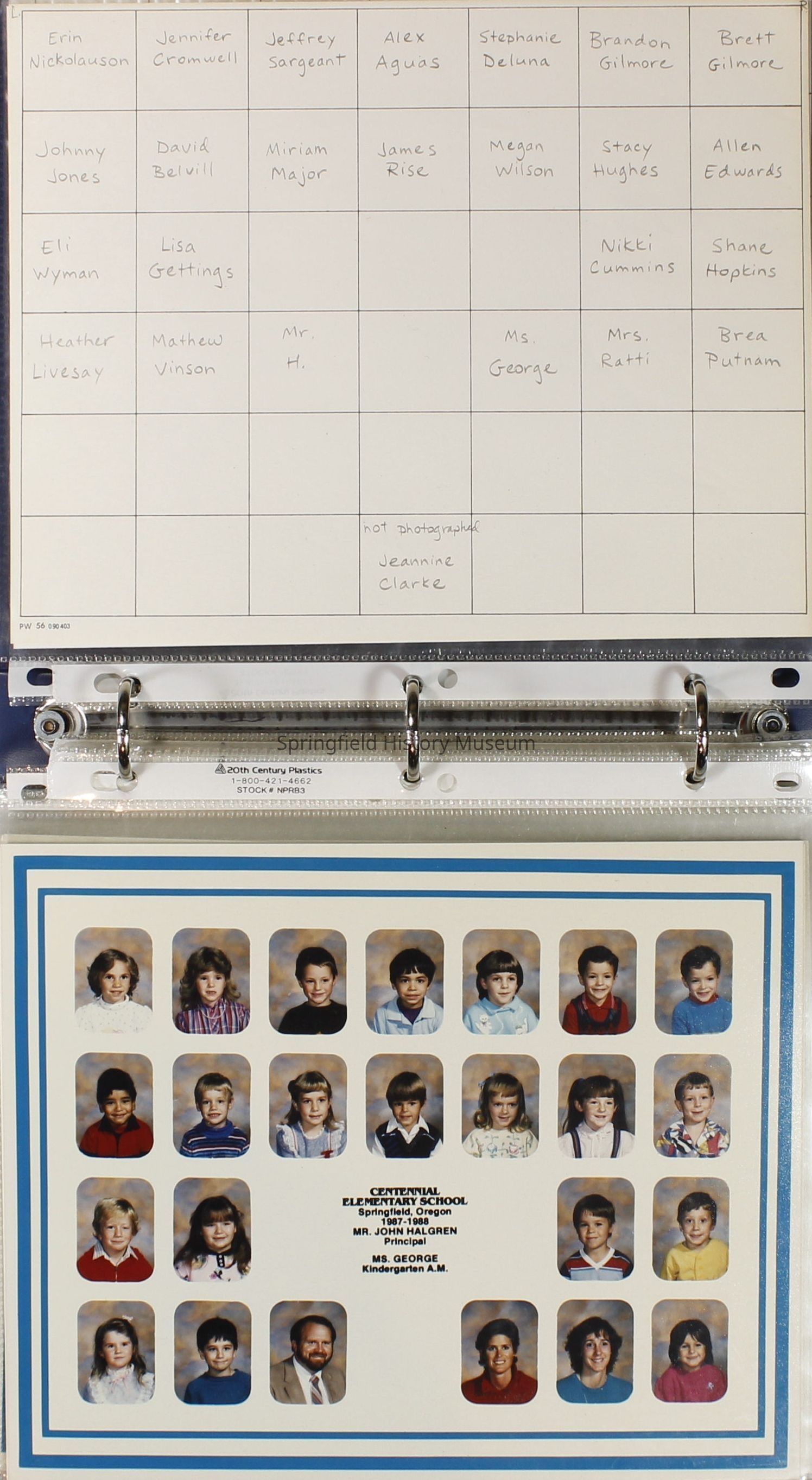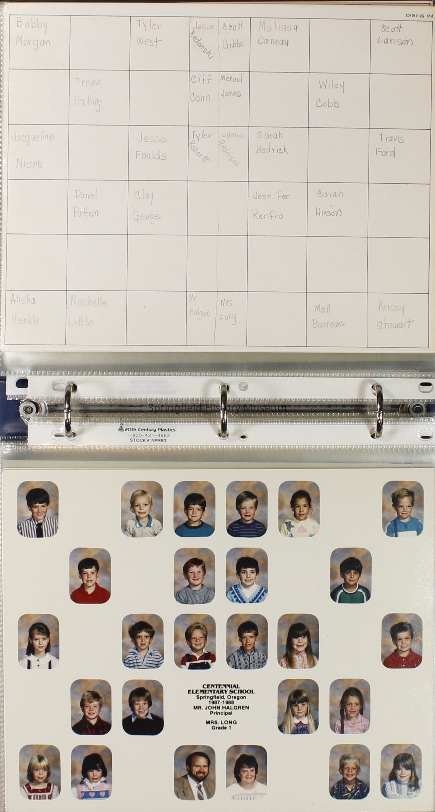 Class and Staff photographs, Centennial Elementary School, 1987-1988. Stored in a photograph album.Photograph Details
