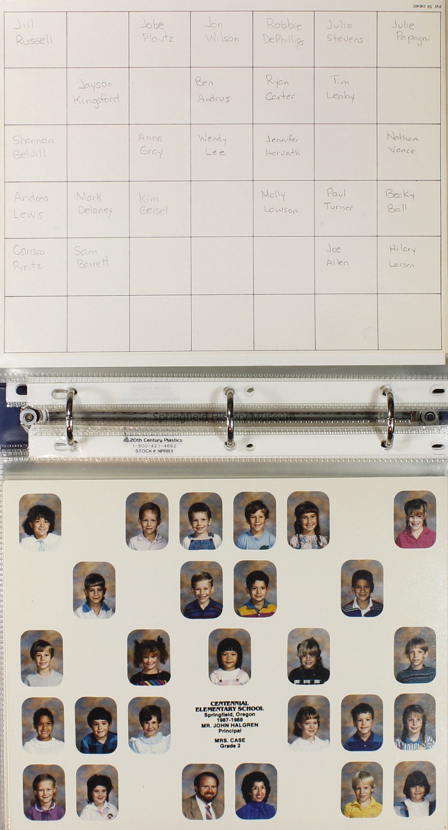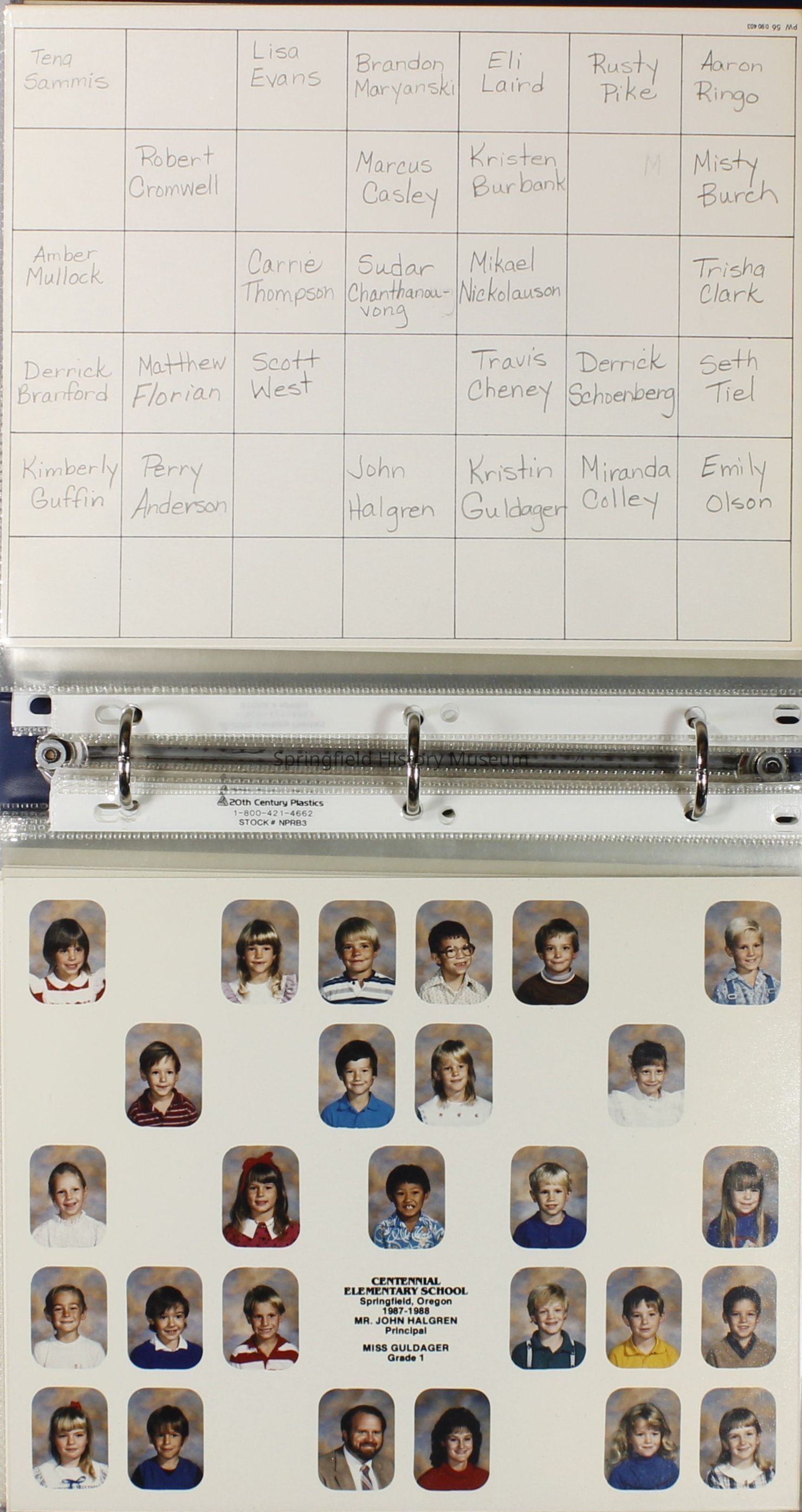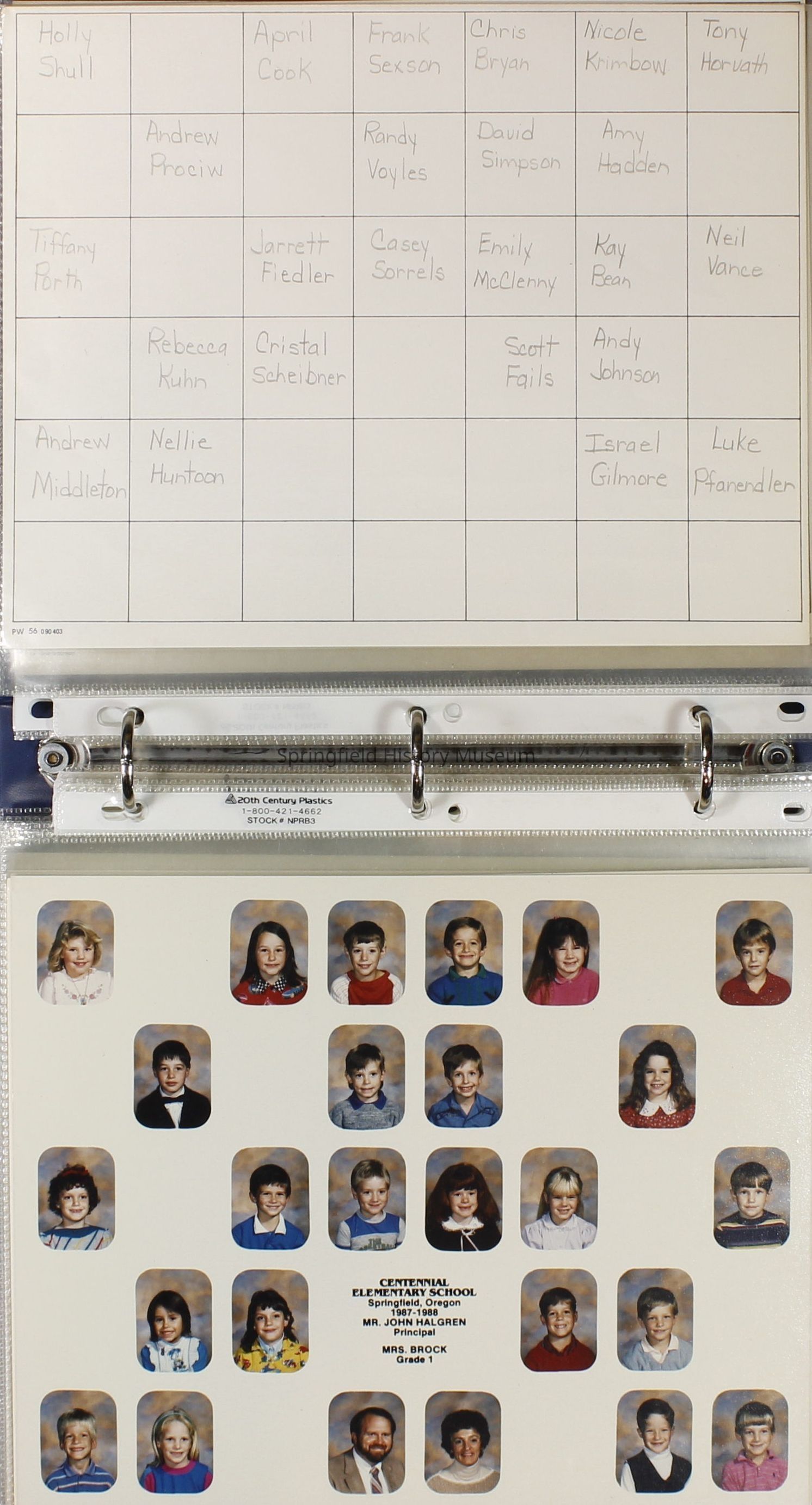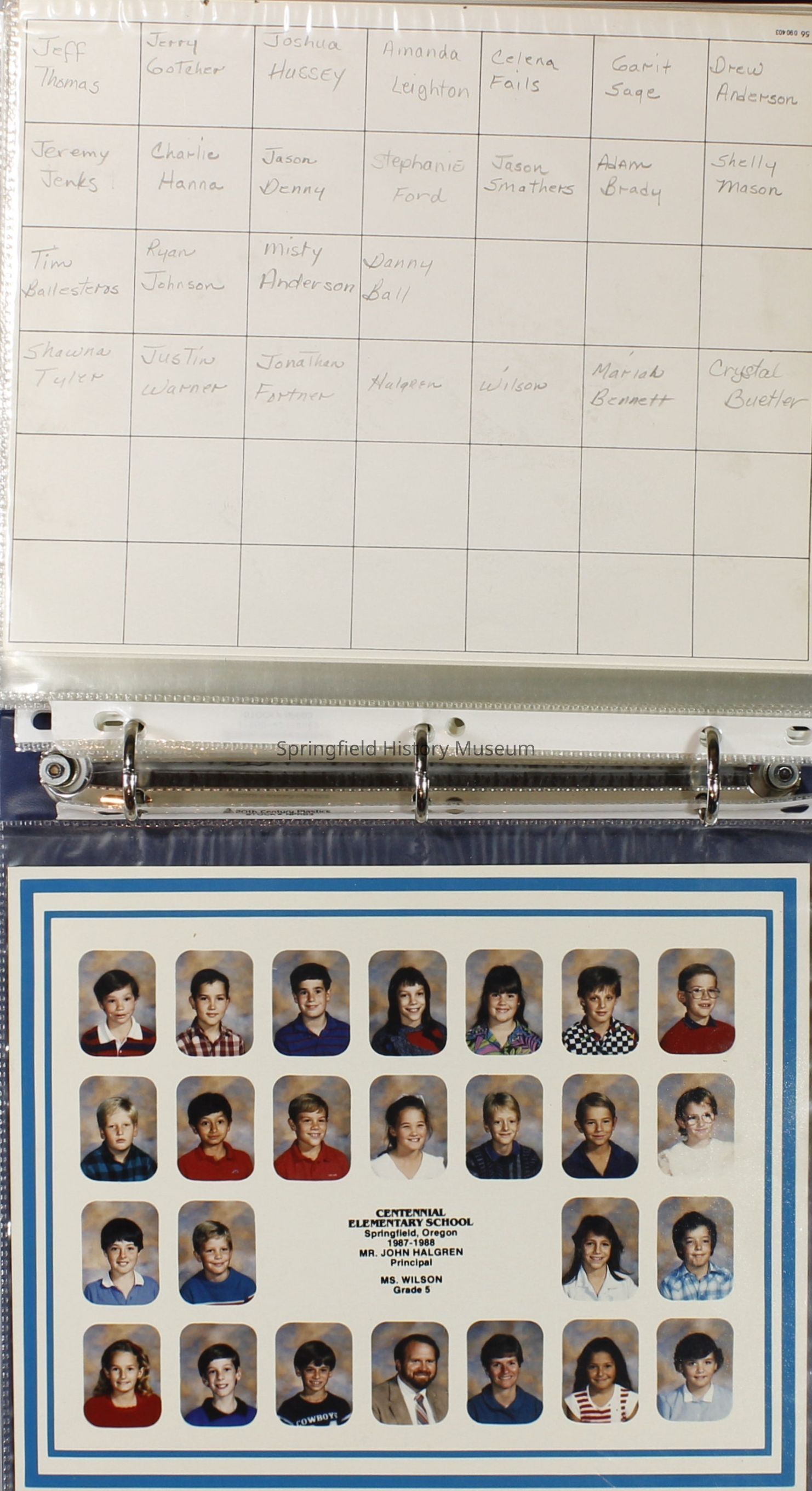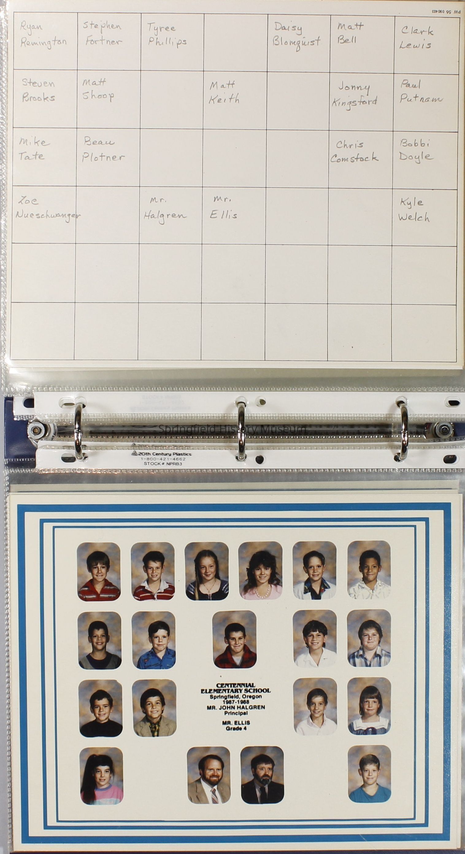Class and Staff photographs, Centennial Elementary School, 1987-1988. Stored in a photograph album.Photograph Details