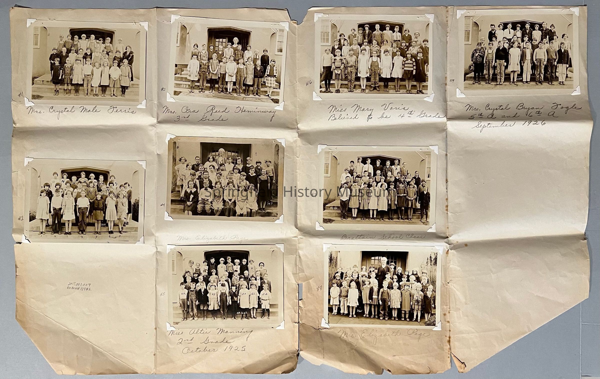 Nine Class Photographs, Brattain School, Springfield, circa 1925-1926. Black and white 5 by 7 inches photographs, attached to 22 by 34 inches paper.