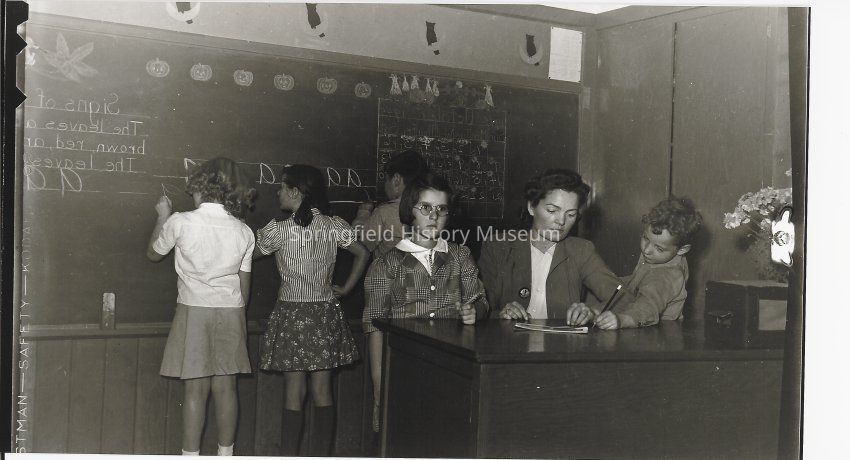 Maple school, teacher with students; one teacher with a student on each side of her and three students writing on chalkboard. 1940s