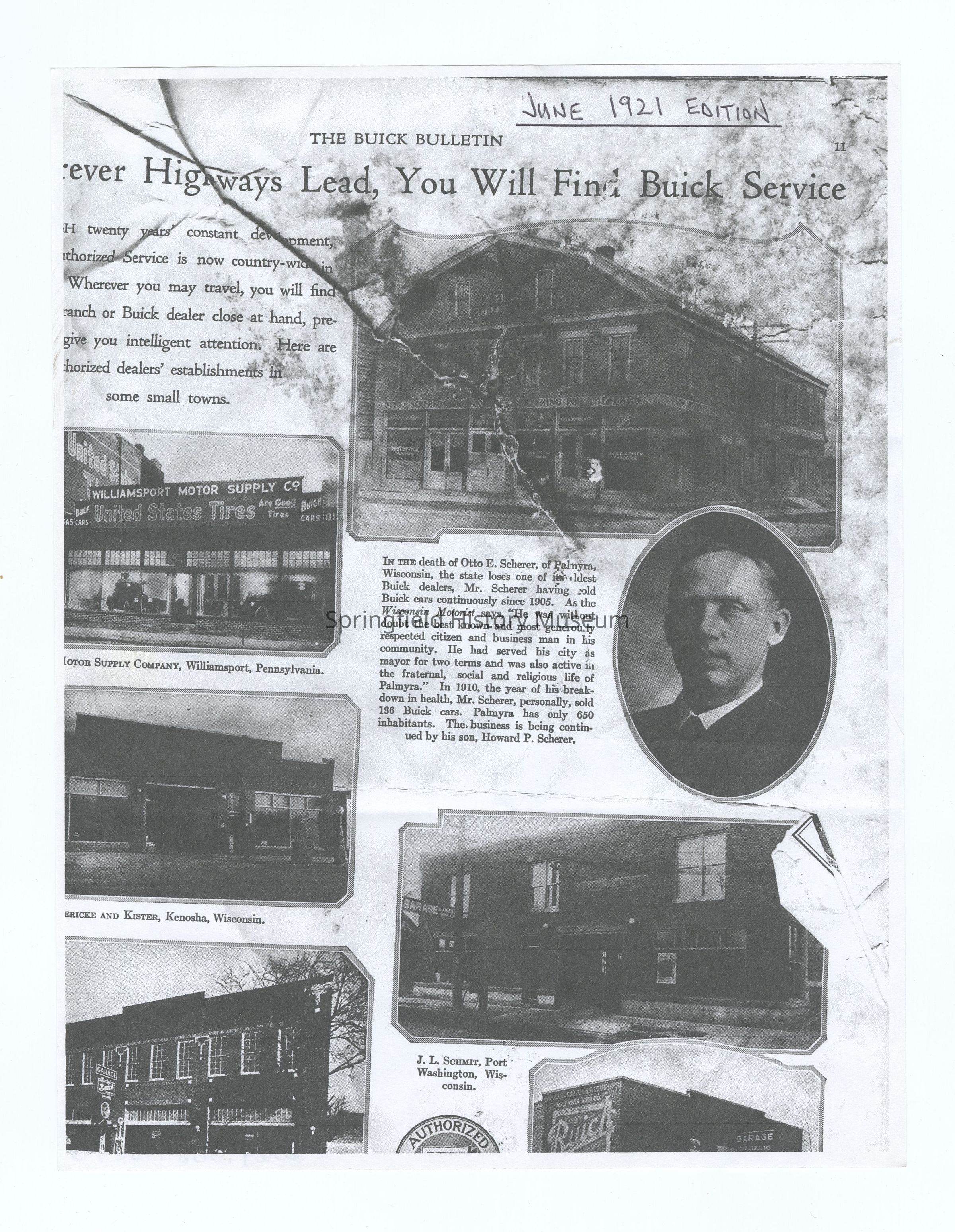 -Article on Otto E. Scherer and other Buick dealers, The Buick Bulletin, June 1921 (copy), scanned