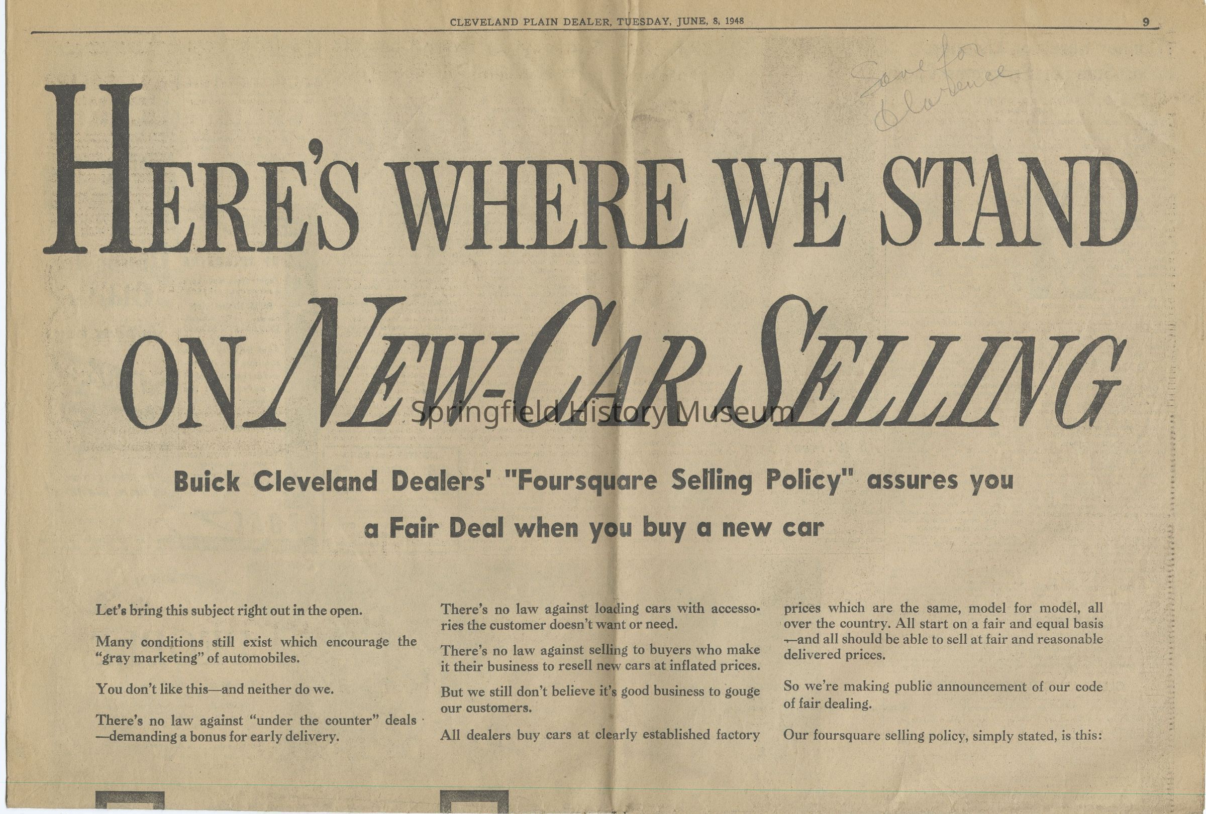 -"Here's where we stand on New-Car Selling" (Buick Cleveland), note "Save for Clarence", Cleveland Plain Dealer, June 8, 1948, scanned