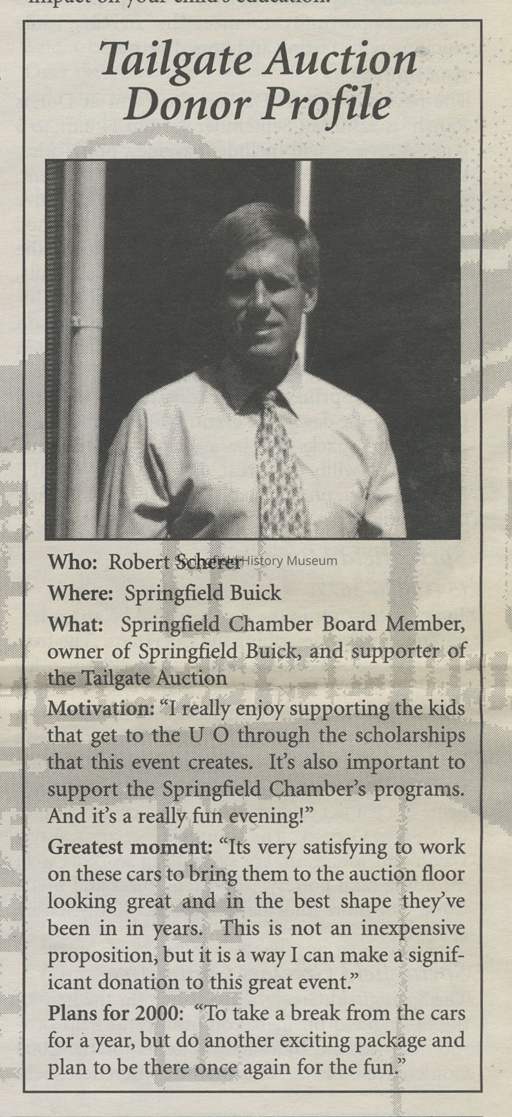 -"Tailgate Auction Donor Profile" Robert Scherer, Springfield Chamber of Commerce Newsletter, September 2000/3, scanned