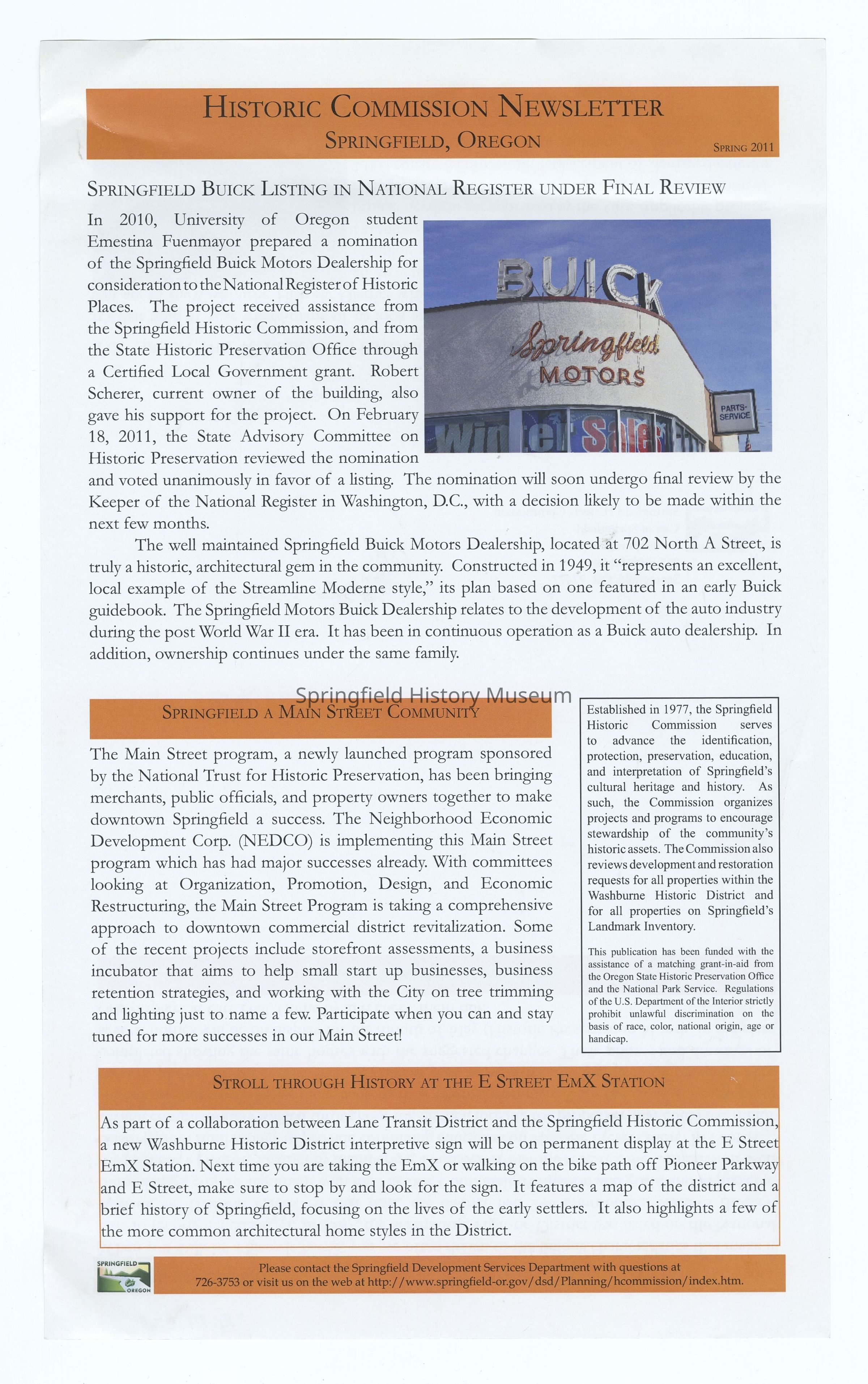 -"Springfield Buick Listing in National Register under Final Review", Historic Commission Newsletter, Springfield, Oregon, Spring 2011, scanned