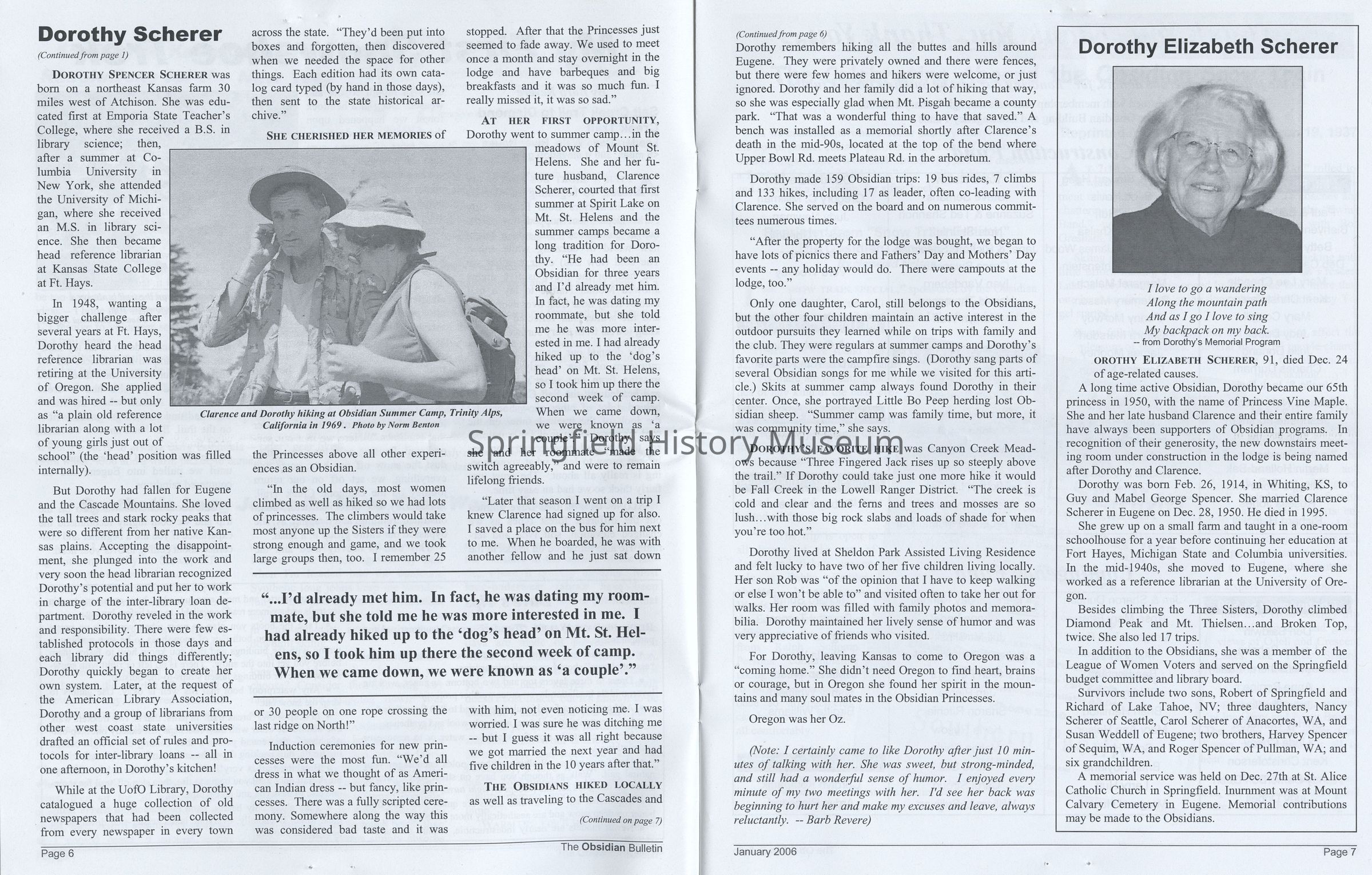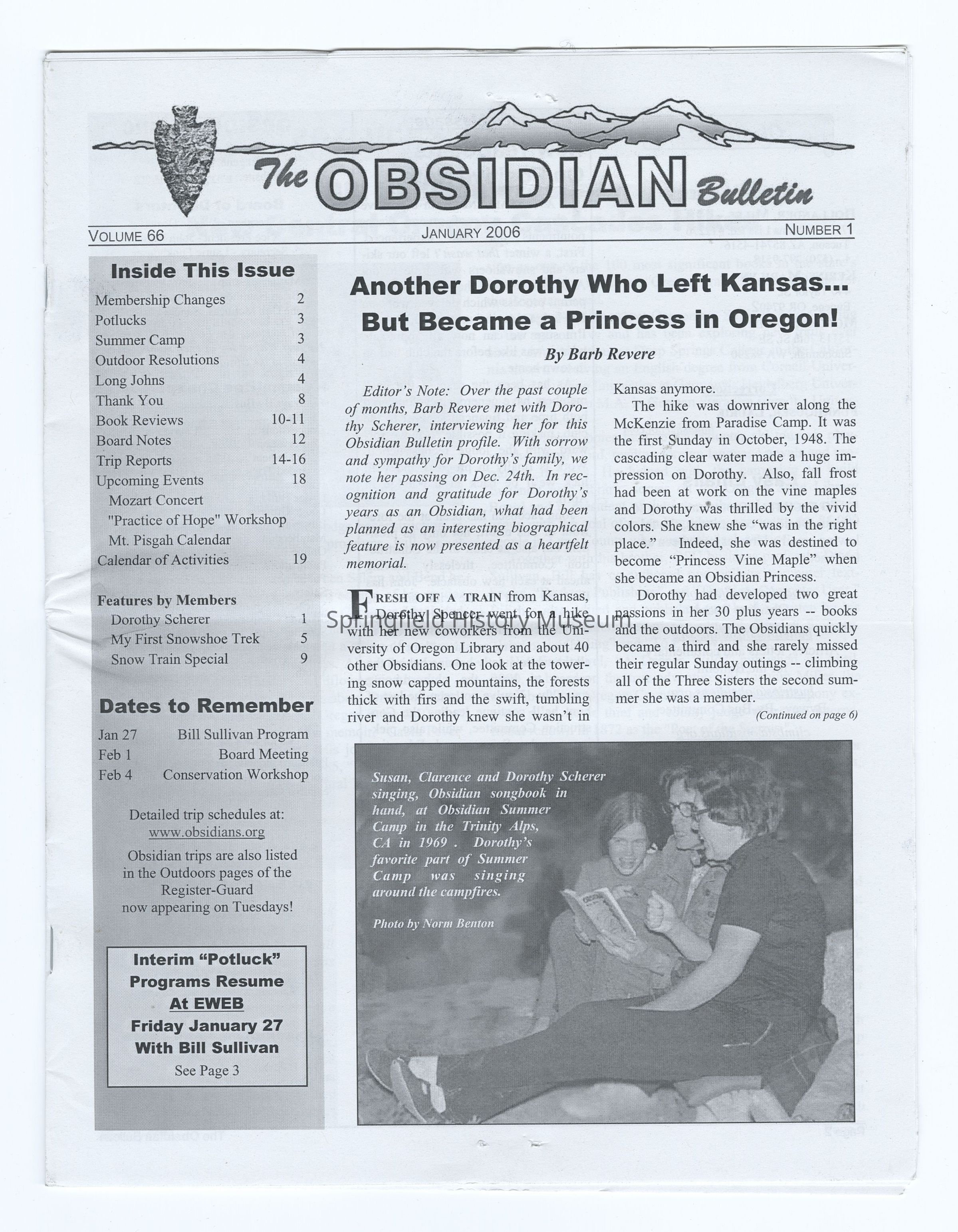 -"Another Dorothy Who Left Kansas... but became a princess in Oregon!", The Obsidian Bulletin, January 2006, vol 66, nr 1 (bio of Dorothy Scherer and photograph of Susan, Clarence and Dorothy Scherer), scanned